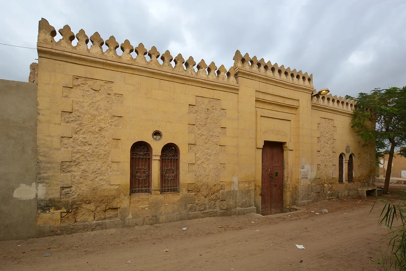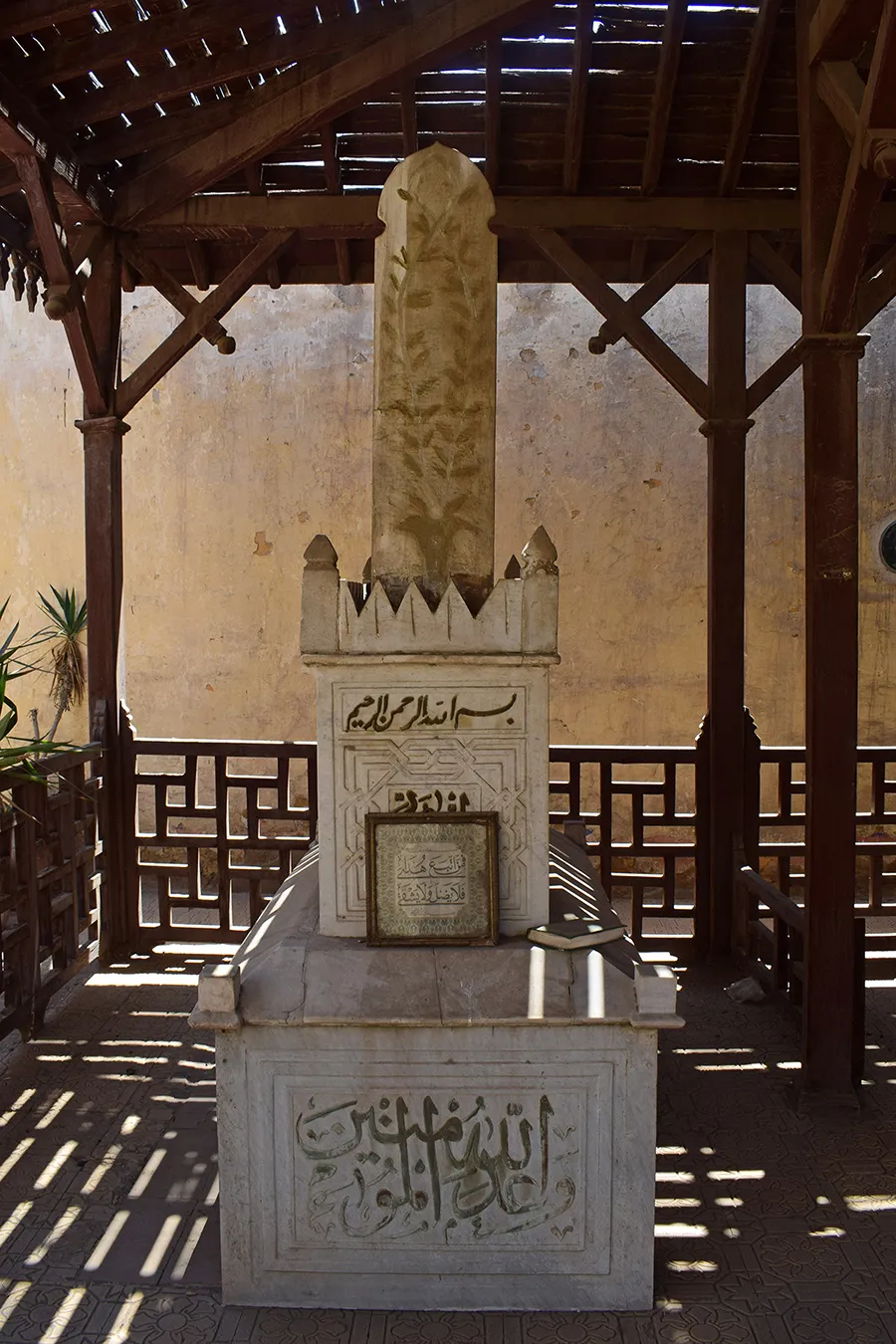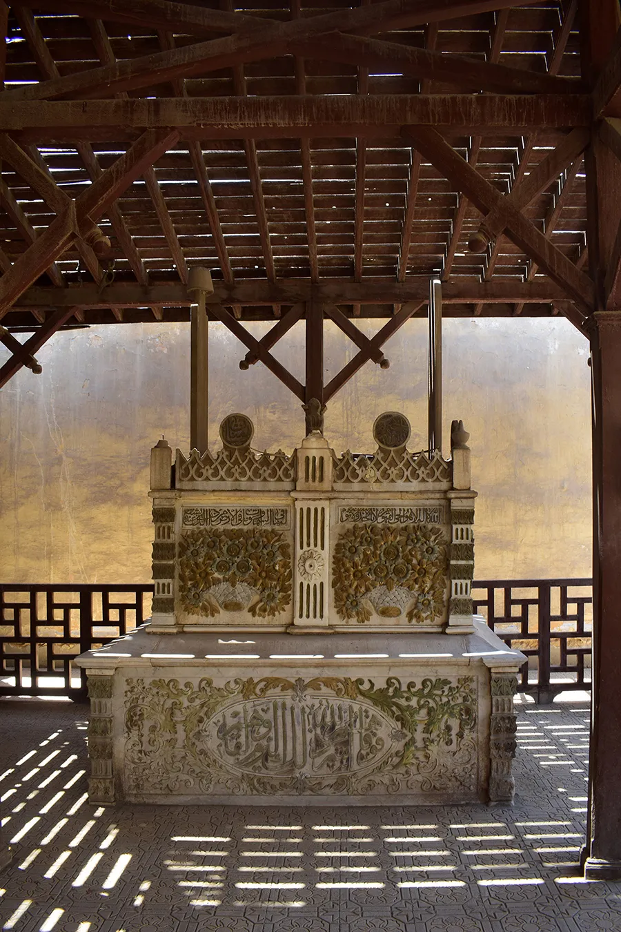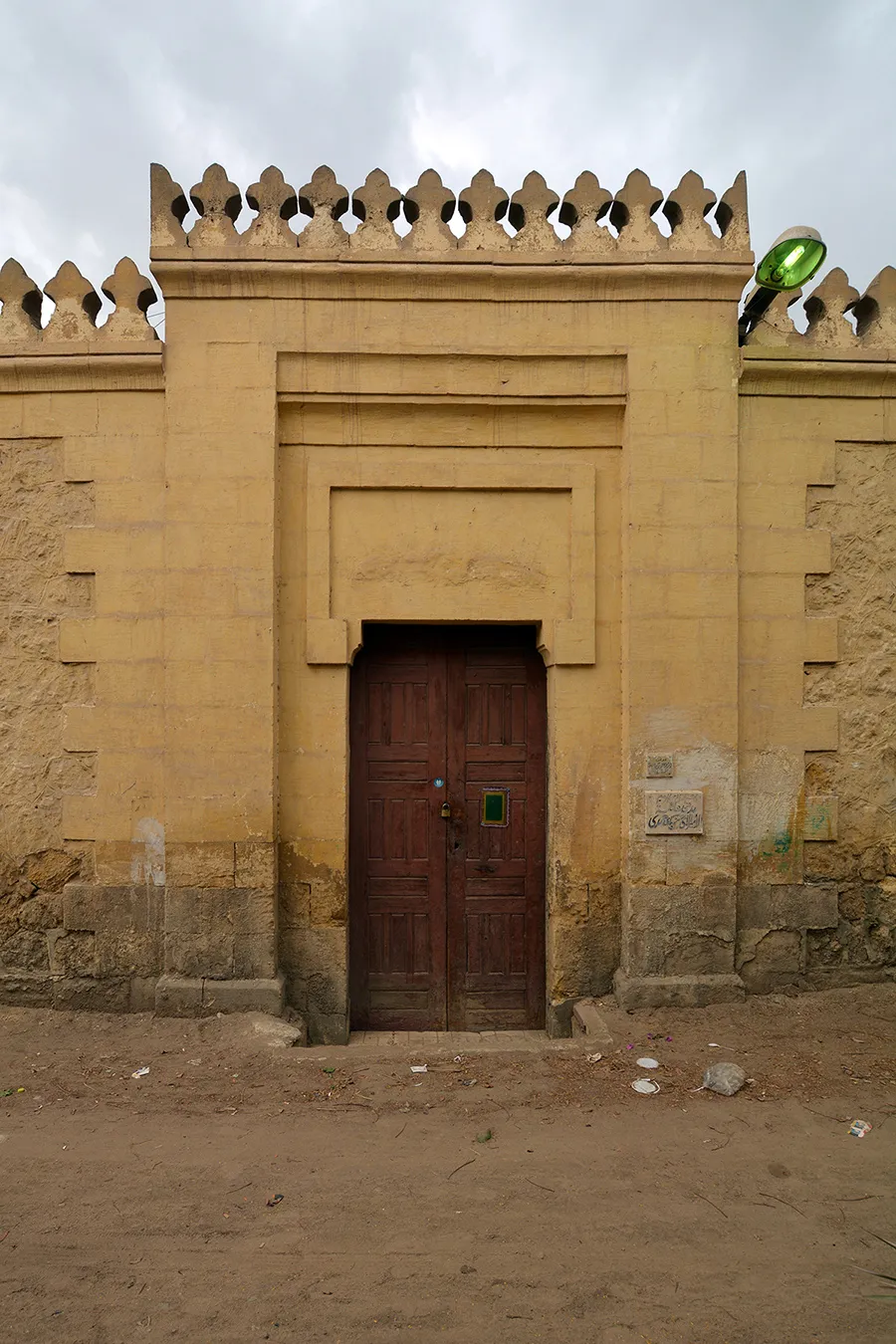 A walled enclosure with single-storey structures by the main façade and an open wooden canopy over cenotaphs placed at the back of the site. The main (eastern) façade slants obliquely in relation to the rectangular lot, following the line of the street that runs at an angle to Sultan Ahmad street, to which the lots in the area are aligned. The strictly symmetrical tripartite façade features a central entrance gate to each side, a pair of windows covered by semicircular arches, separated by a pillar with an engabed semi-column but otherwise undecorated, with a small plain oculus above. The windows are fitted with decorative wrought-iron grilles of a vaguely Art Noveau design (not Islamic patterns), and simple panelled wooden shutters. The very slightly protruding entrance section is slightly higher and contains a rectangular recess topped with a cavetto cornice with a rectangular door, the lintel of which and the relieving arch above are surrounded by a plane rectangular frame (possibly intended to be carved into knotted mouldings but never finished?) The façade is topped by a simple stone cavetto cornice and simple fleur-de-lys crenellations. The corners and the sections with openings are built of ashlar stone, while the parts between them are built of rubble stone. The external facades are coated with yelow wash.