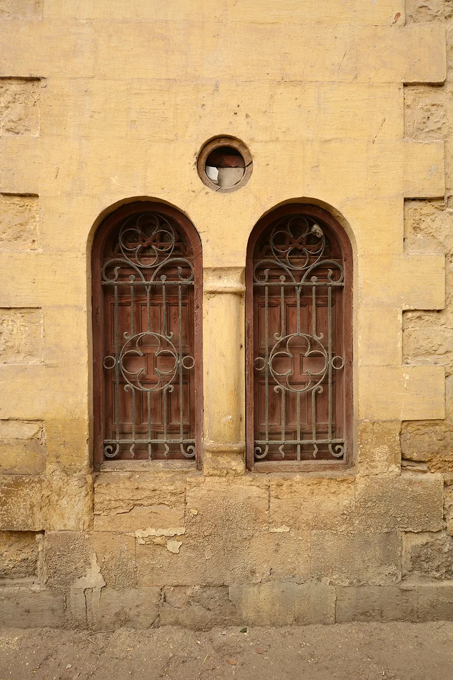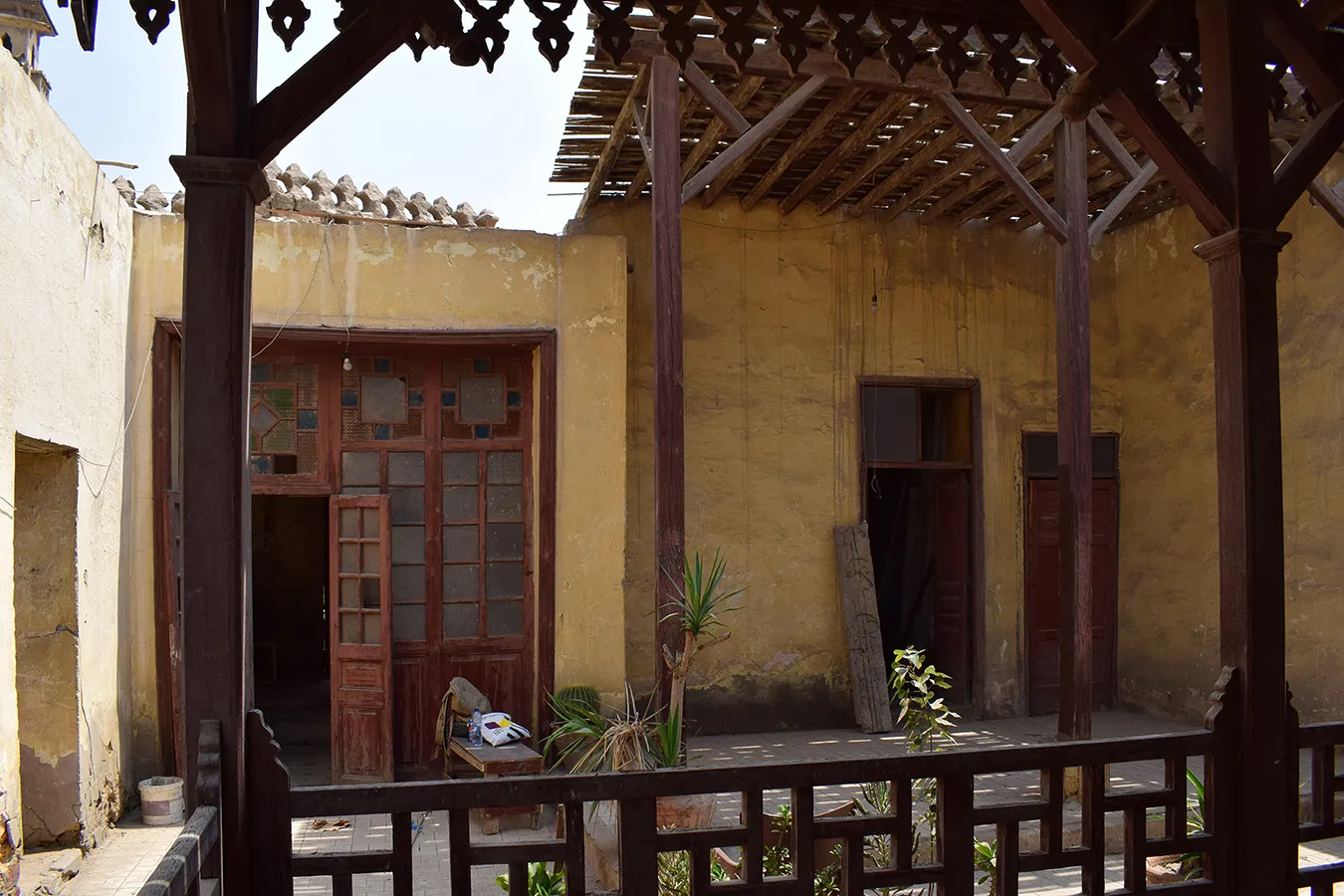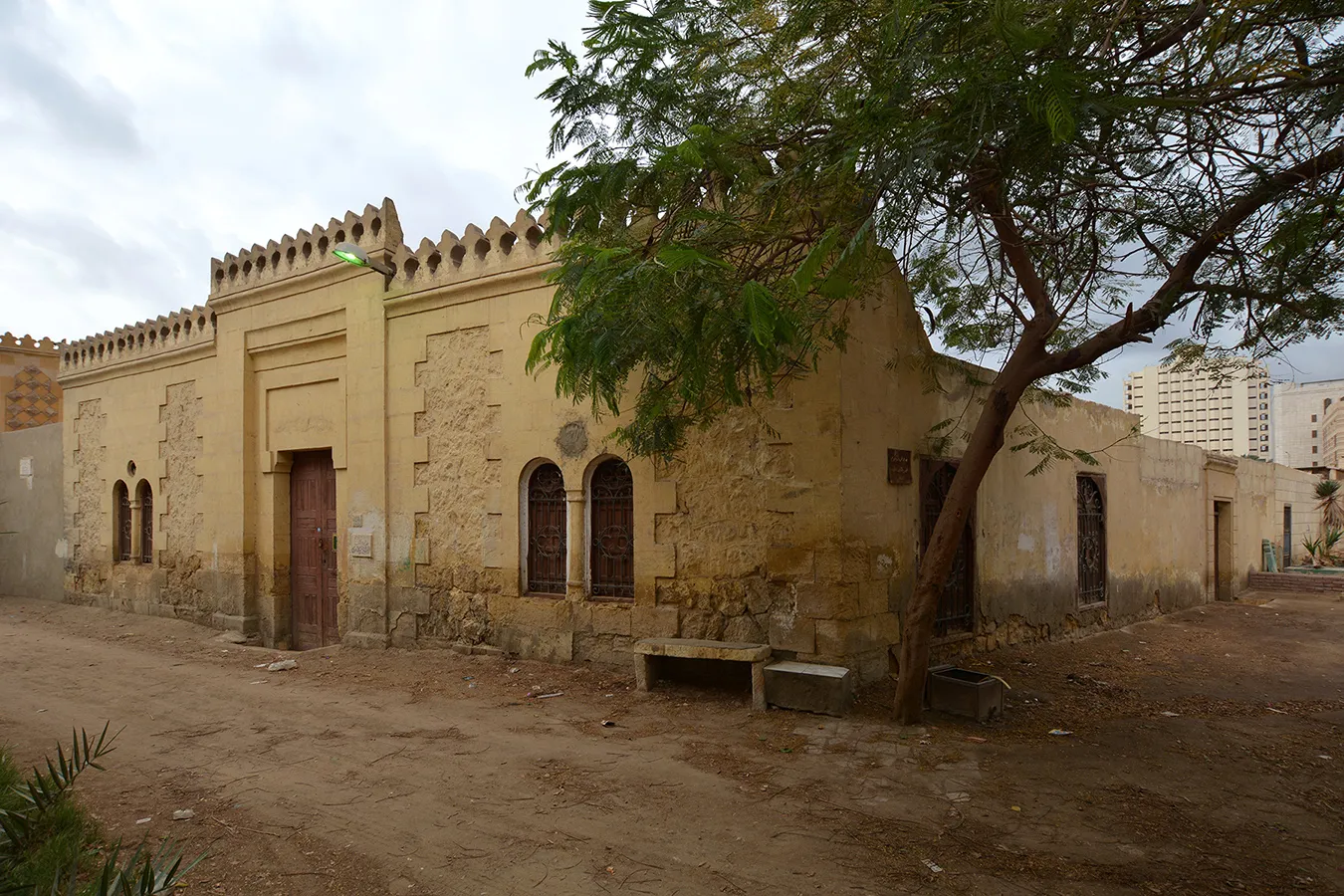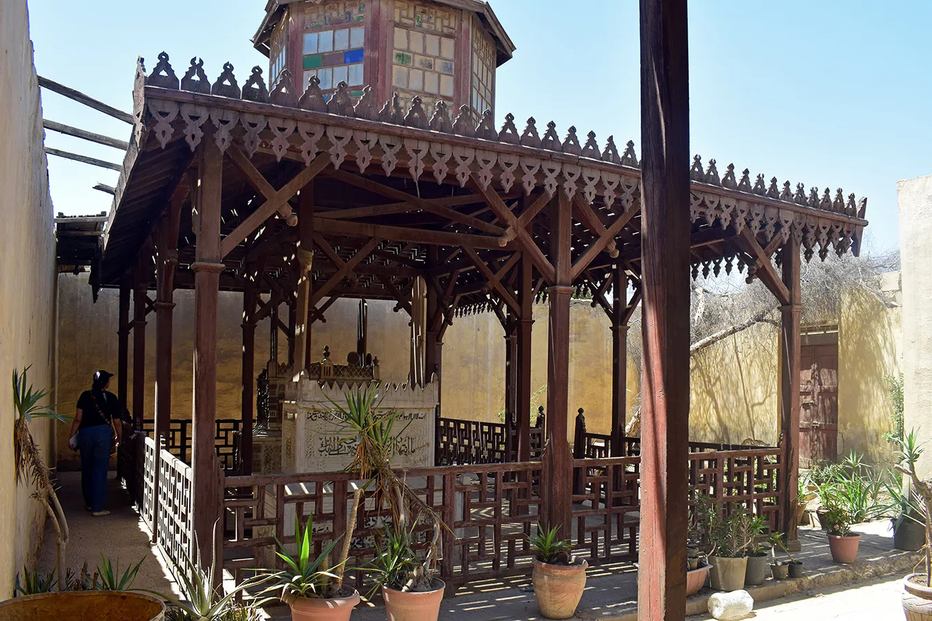 A walled enclosure with single-storey structures by the main façade and an open wooden canopy over cenotaphs placed at the back of the site. The main (eastern) façade slants obliquely in relation to the rectangular lot, following the line of the street that runs at an angle to Sultan Ahmad street, to which the lots in the area are aligned. The strictly symmetrical tripartite façade features a central entrance gate to each side, a pair of windows covered by semicircular arches, separated by a pillar with an engabed semi-column but otherwise undecorated, with a small plain oculus above. The windows are fitted with decorative wrought-iron grilles of a vaguely Art Noveau design (not Islamic patterns), and simple panelled wooden shutters. The very slightly protruding entrance section is slightly higher and contains a rectangular recess topped with a cavetto cornice with a rectangular door, the lintel of which and the relieving arch above are surrounded by a plane rectangular frame (possibly intended to be carved into knotted mouldings but never finished?) The façade is topped by a simple stone cavetto cornice and simple fleur-de-lys crenellations. The corners and the sections with openings are built of ashlar stone, while the parts between them are built of rubble stone. The external facades are coated with yelow wash.