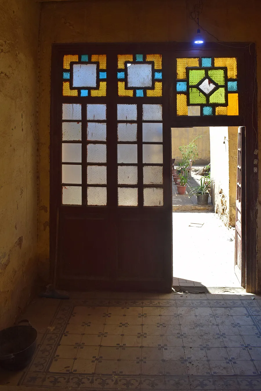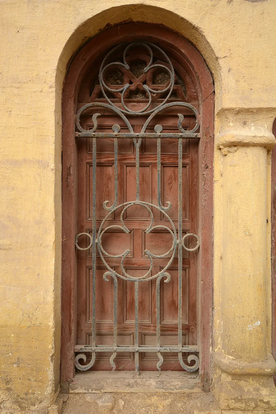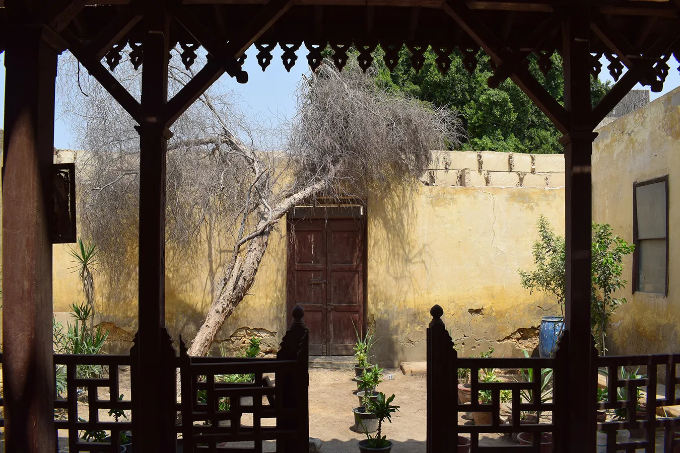 The main entrance leads to the vestibule that opens on the courtyard with a wide rectangular opening with a wooden-and-stained-glass screen including a glazed two-leaf door. Rooms in the north-eastern and south-eastern corners of the enclosure are accessed from the courtyard. The latter has a simple wooden porch on two slender posts.