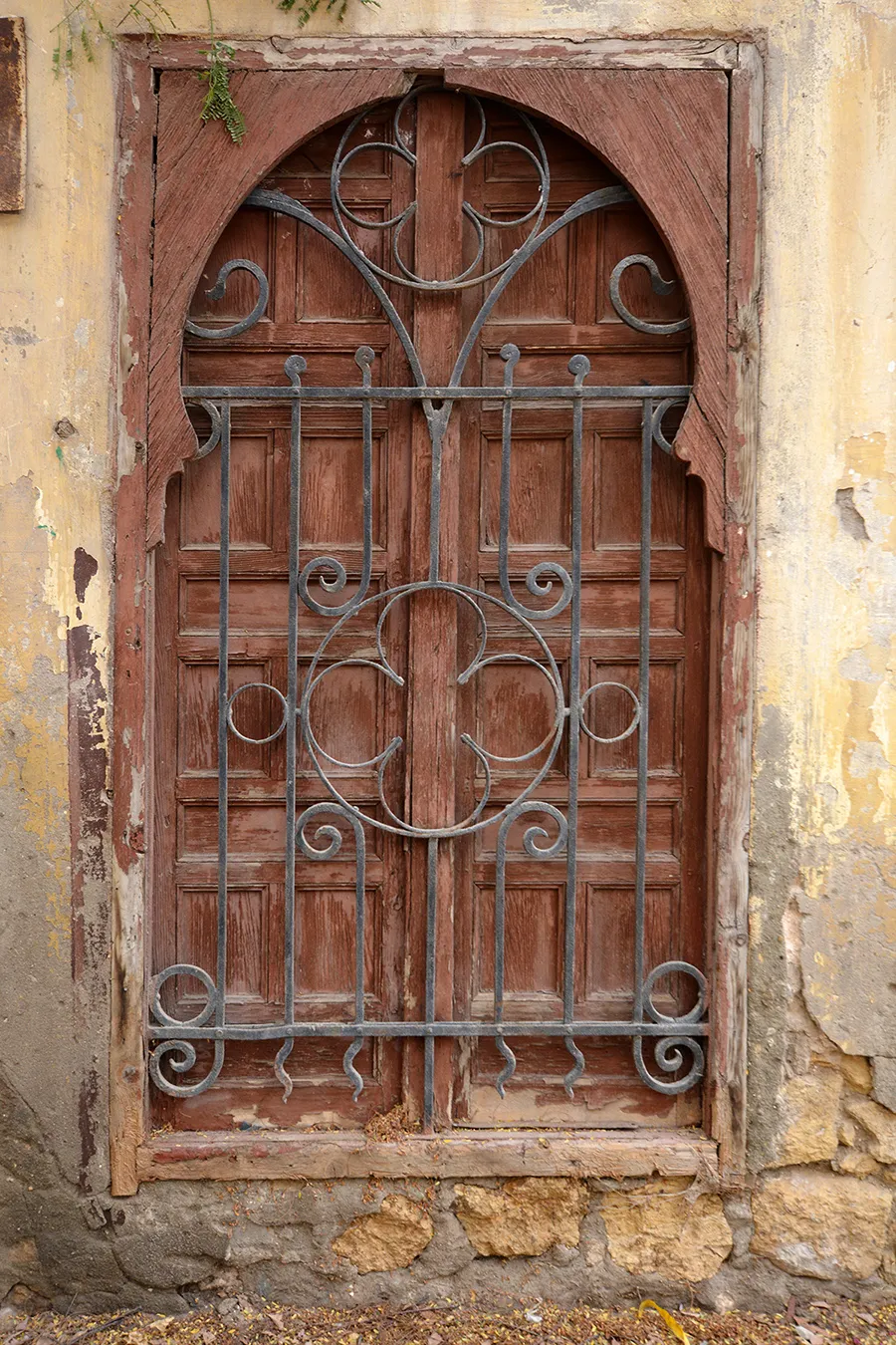The secondary northern façade (longer side of the lot) is plain, built of rubble stone and plastered. It has an undecorated secondary entrance in its right section and two rectangular windows with grilles and shutters similar to those in the front façade. The window frames feature a wooden horseshoe arch in the upper part.