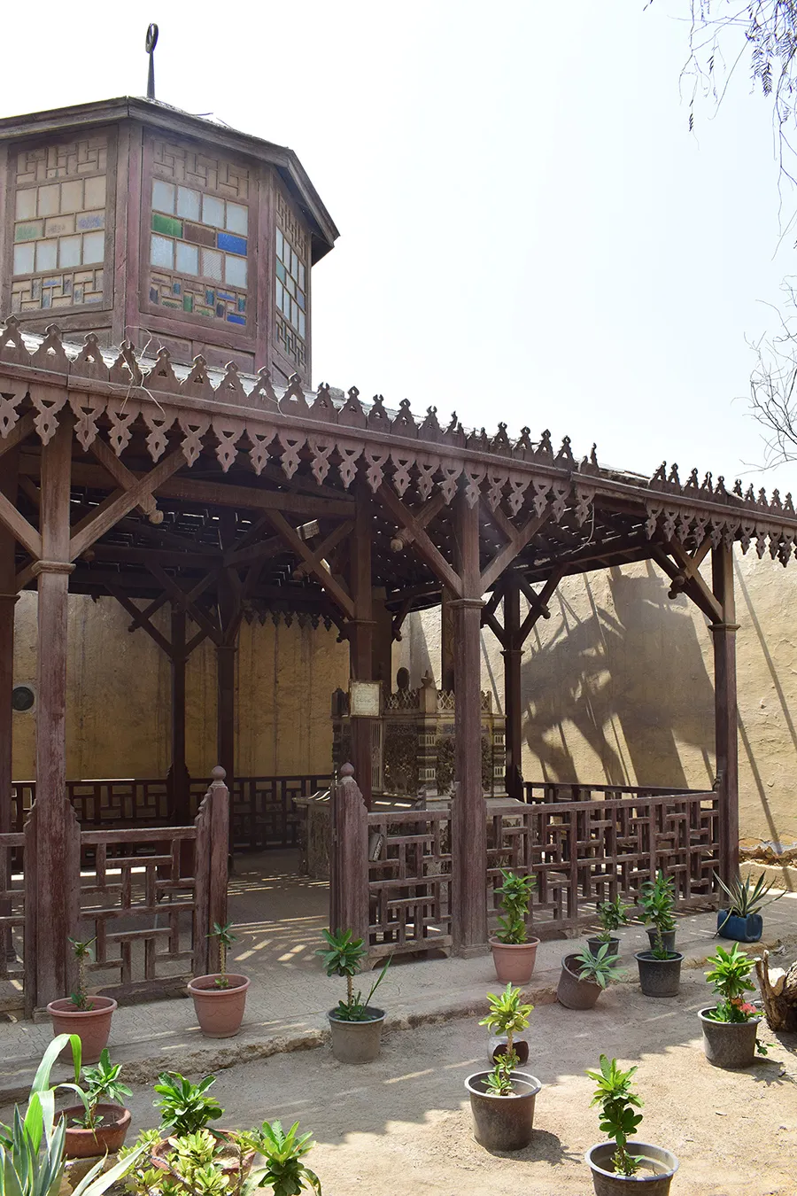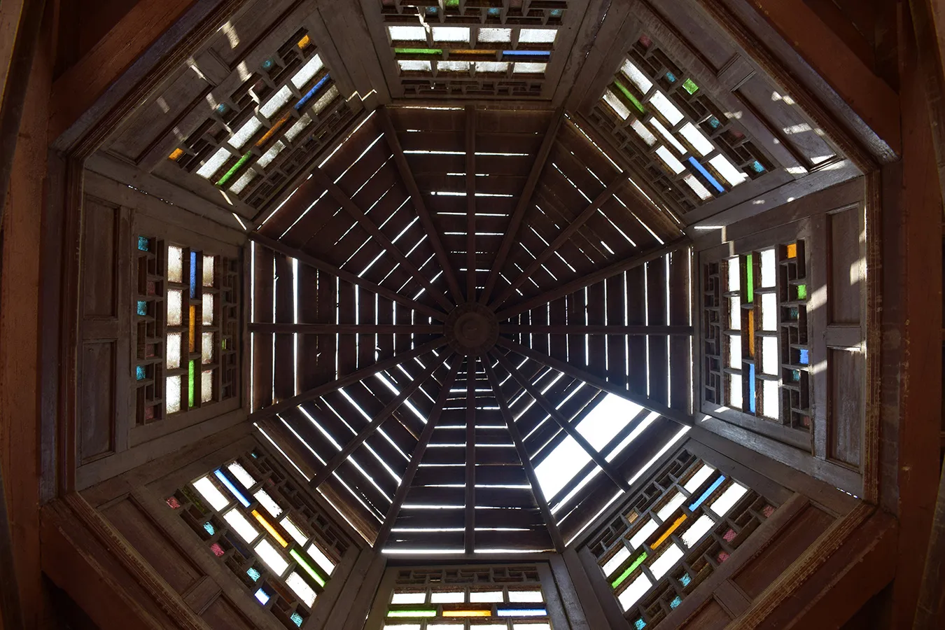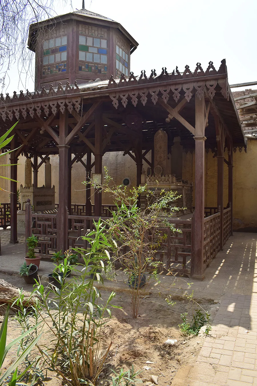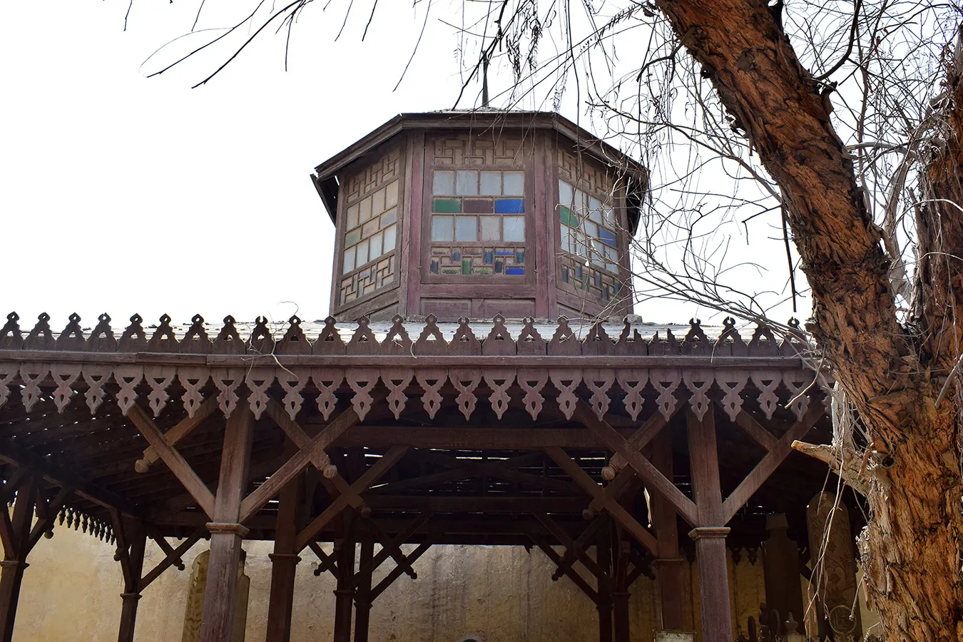 The south-western quarter of the enclosure is taken by an elaborate free-standing canopy of rectangular plan, with a roof supported on three square slender wooden posts to each shorter side, and four to each longer side, and with four internal posts supporting the structure of the lantern. The roof ends wooden eaves with elaborate frills. The windows of the octagonal lantern are divided into geometric panes glazed with transparent and coloured glass. It is covered with a conical roof.