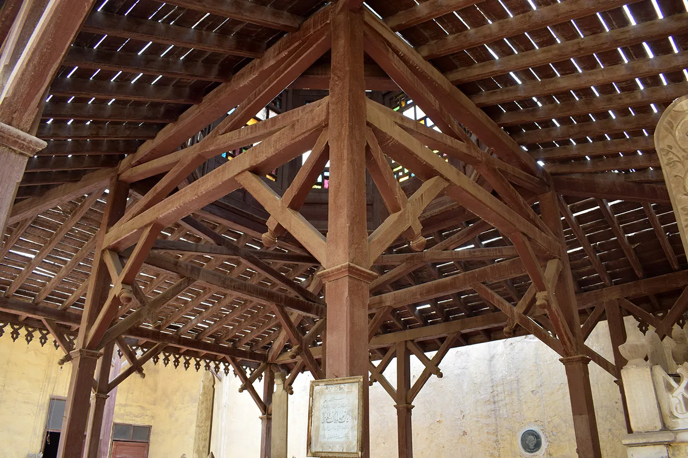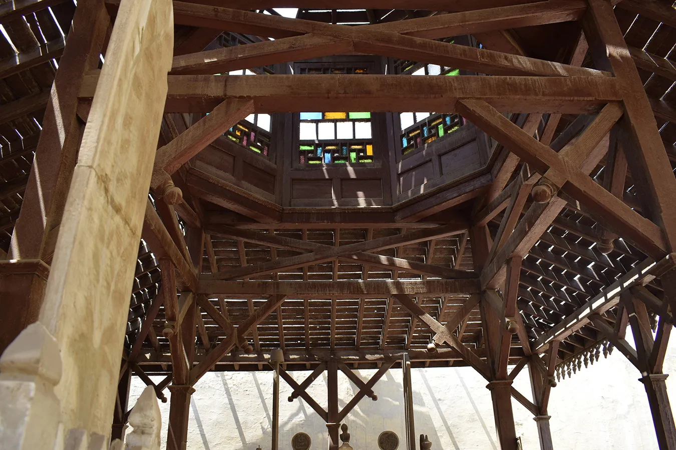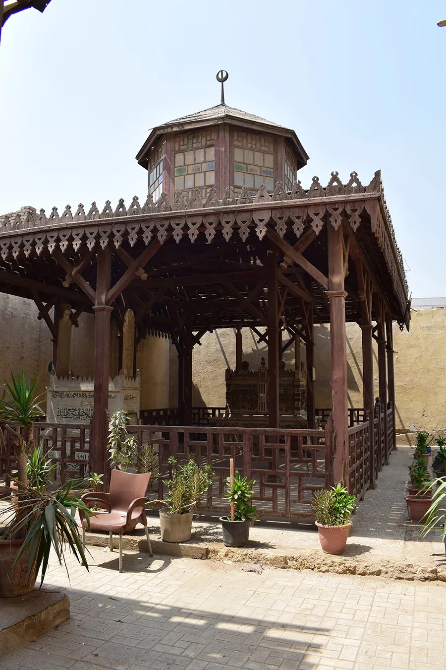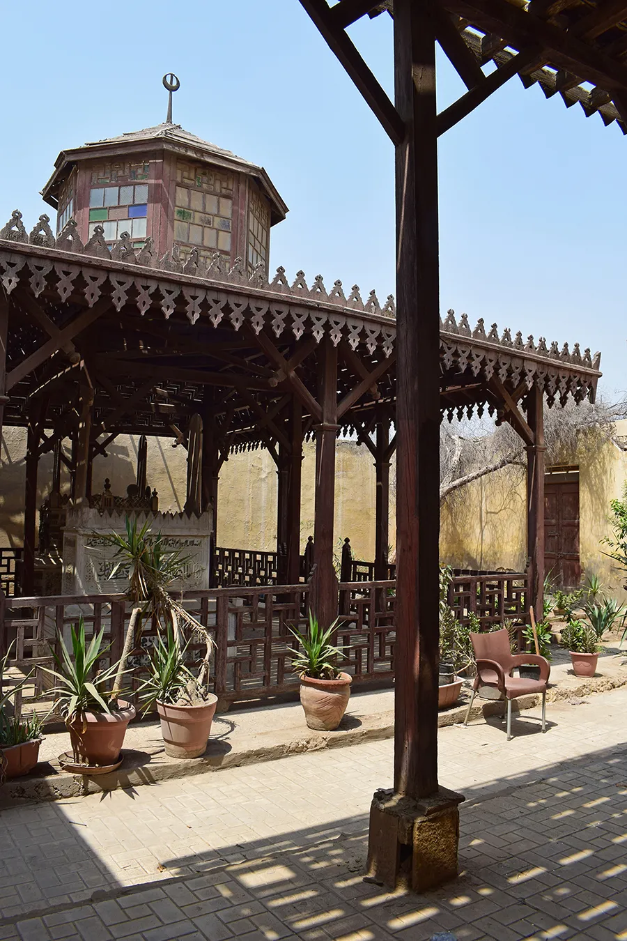 The south-western quarter of the enclosure is taken by an elaborate free-standing canopy of rectangular plan, with a roof supported on three square slender wooden posts to each shorter side, and four to each longer side, and with four internal posts supporting the structure of the lantern. The roof ends wooden eaves with elaborate frills. The windows of the octagonal lantern are divided into geometric panes glazed with transparent and coloured glass. It is covered with a conical roof.