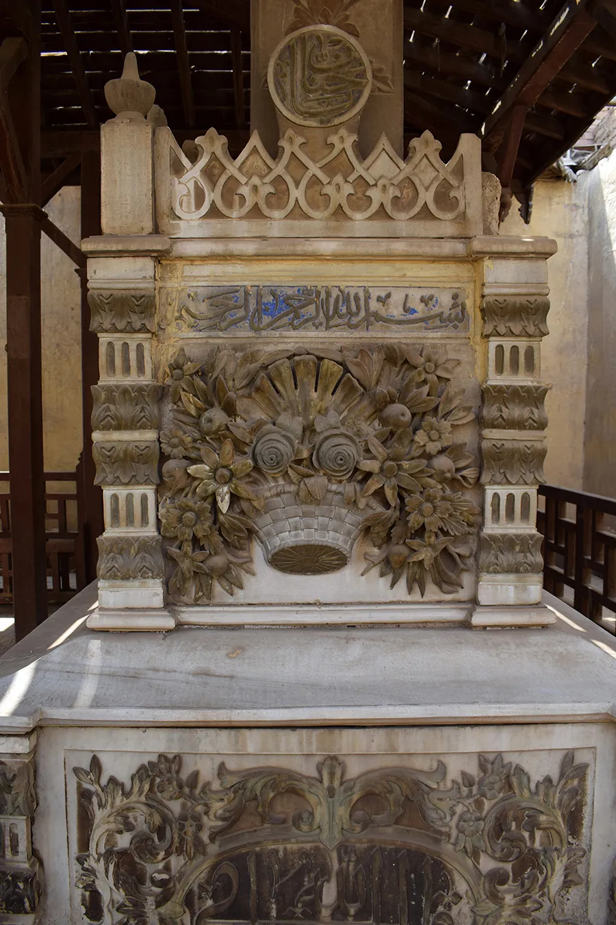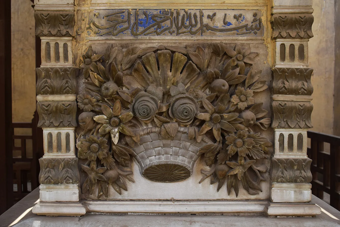 The canopy covers two elaborately carved marble cenotaphs, one of them remarkable for a naturalistic depiction of a basket of flowers in raised relief