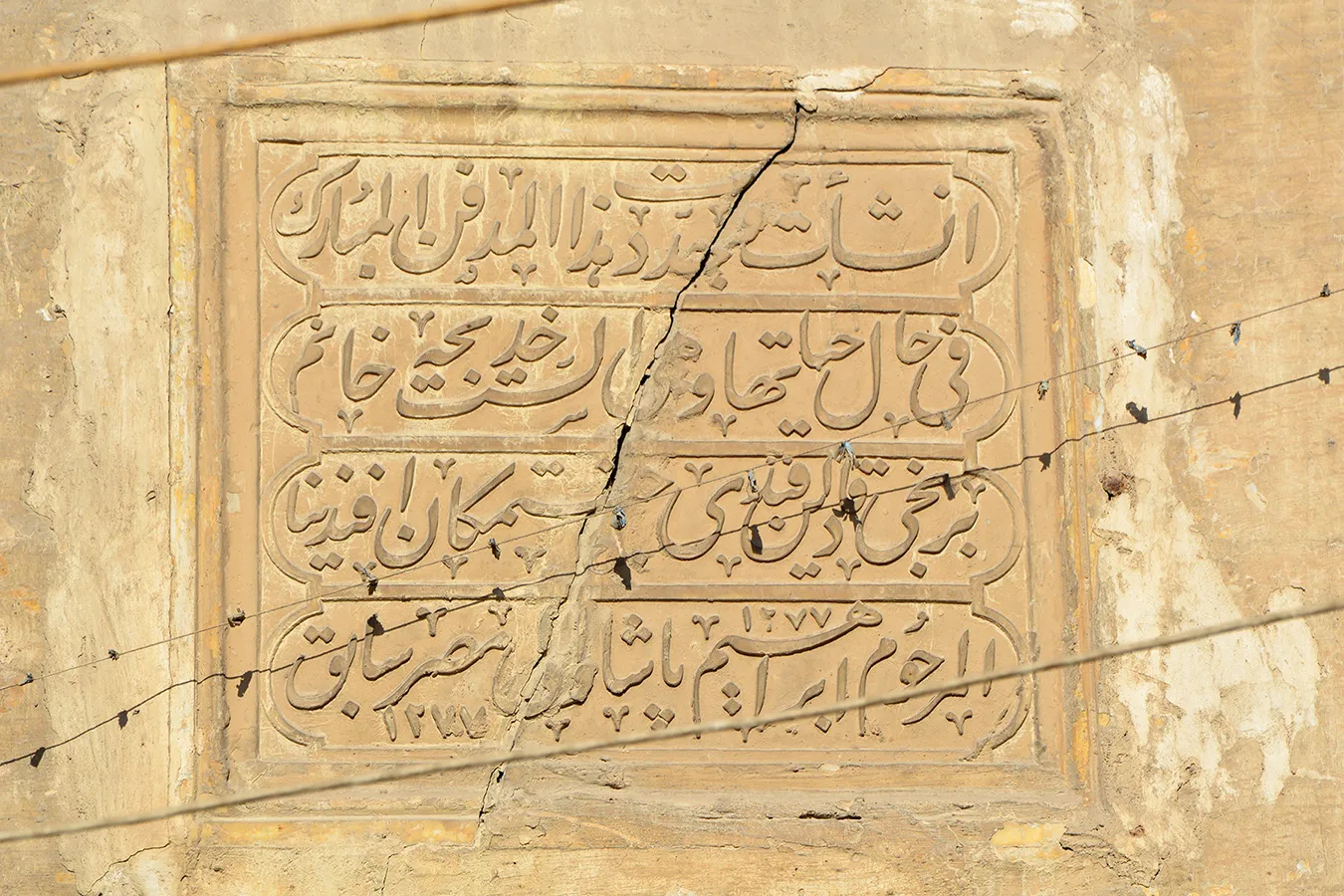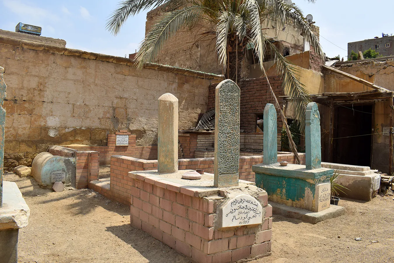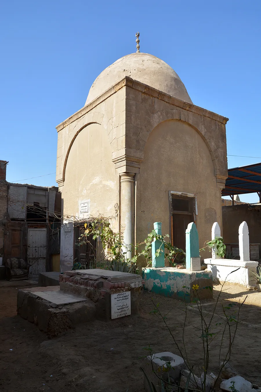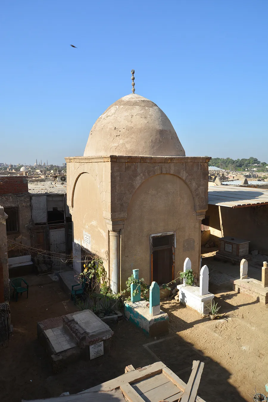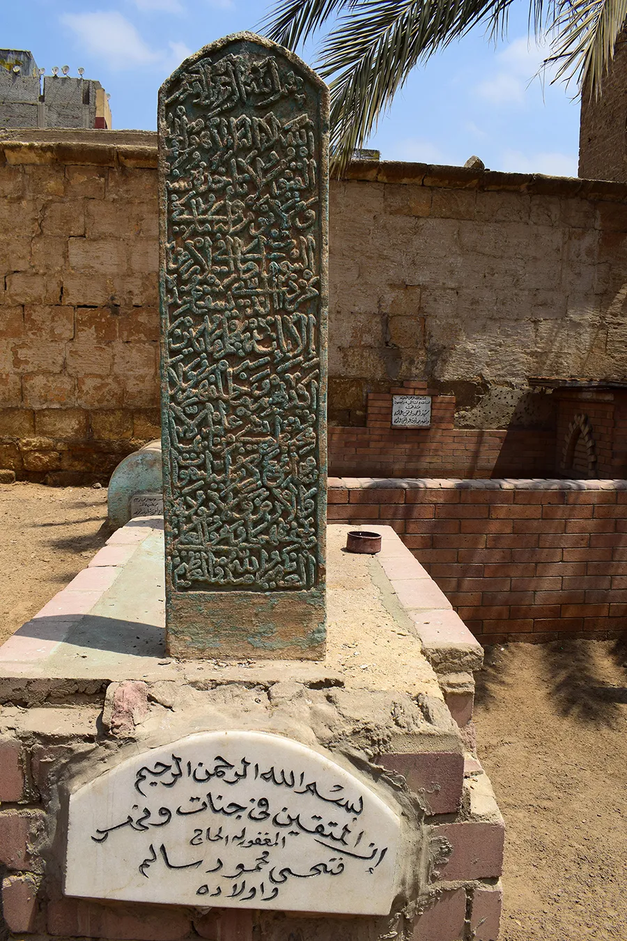 The dedicatory inscription over the entrance gate mentions “the building/renovation in AH 1277 [= AD 1861] of the funerary enclosure of Lady Khadiga Khanum Brengi Qadim of the time of the late Ibrahim Pasha, wali of Egypt”. (Khadiga is the name; khanum, brengi, and qadim are Ottoman honorific titles for women of high status in the ruling family.) The titles in the inscription, and the texts on cenotaphs in the enclosure clearly indicate that Lady Khadiga was a royal consort, the wife of Ibrahim Pasha. The inscription on a cenotaph dated AH 1348 / AD 1929 for Khadiga’s servant women indicates that Khadiga was a manumitted slave.