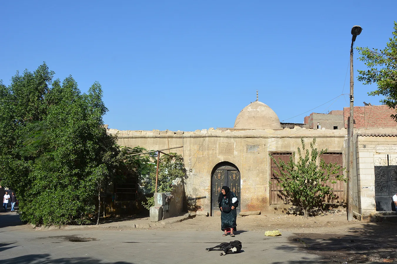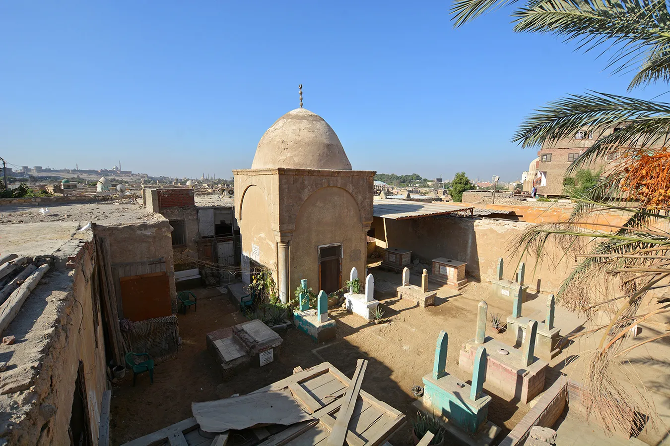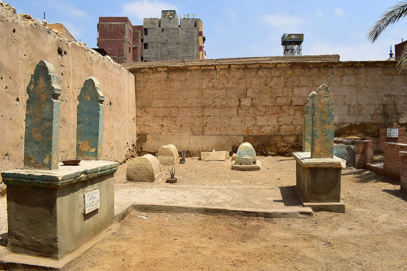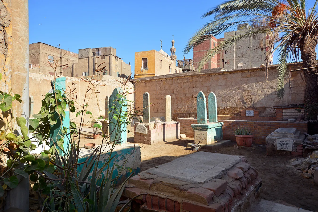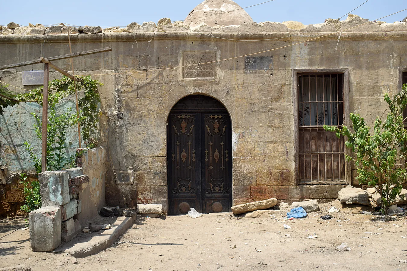 The dedicatory inscription over the entrance gate mentions “the building/renovation in AH 1277 [= AD 1861] of the funerary enclosure of Lady Khadiga Khanum Brengi Qadim of the time of the late Ibrahim Pasha, wali of Egypt”. (Khadiga is the name; khanum, brengi, and qadim are Ottoman honorific titles for women of high status in the ruling family.) The titles in the inscription, and the texts on cenotaphs in the enclosure clearly indicate that Lady Khadiga was a royal consort, the wife of Ibrahim Pasha. The inscription on a cenotaph dated AH 1348 / AD 1929 for Khadiga’s servant women indicates that Khadiga was a manumitted slave.