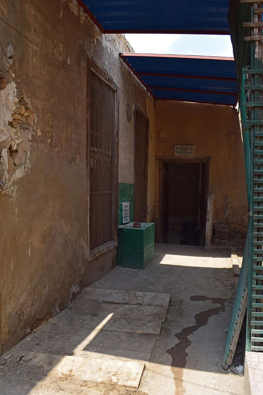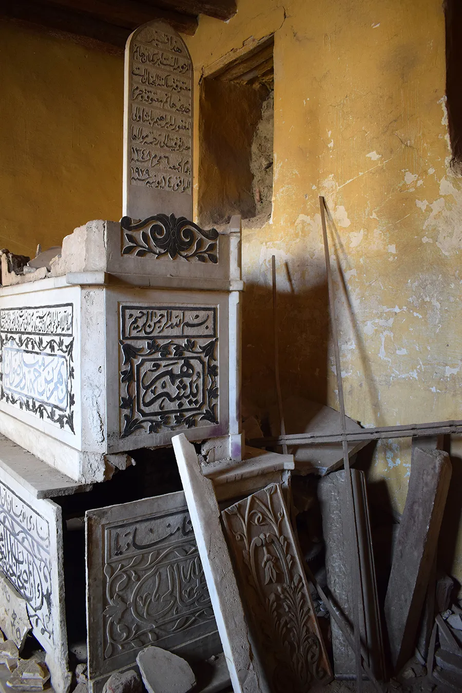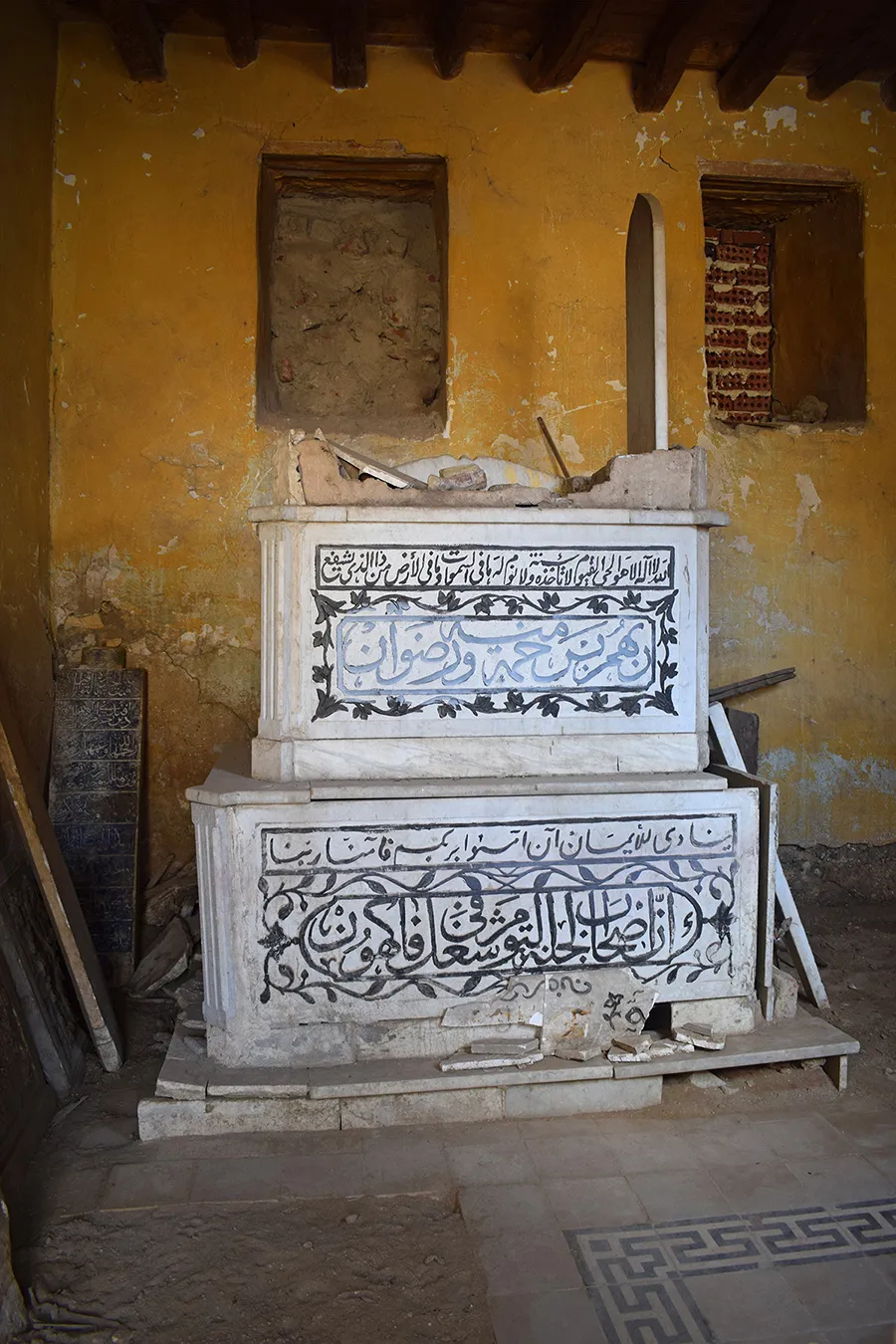 An annexe adjoins the enclosure to the west, with entrances from the street, where it continues the southern façade, and from the courtyard. The very simple structure has been recently covered with a simple roof of corrugated steel sheets on steel beams, with a roof lantern. In the room stands a richly carved marble cenotaph of Muhammad Bey Ibrahim, dated 4 Muharram 1326 AH [= 6 February AD 1908]. On the northern wall is mounted a richly carved marble side panel from another cenotaph, while on the eastern wall are twelve randomly placed commemorative marble plaques for people who died in the late 20th – early 21st centuries, the most recent of 2021.