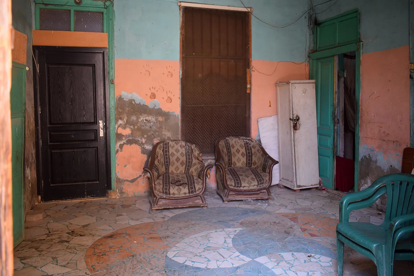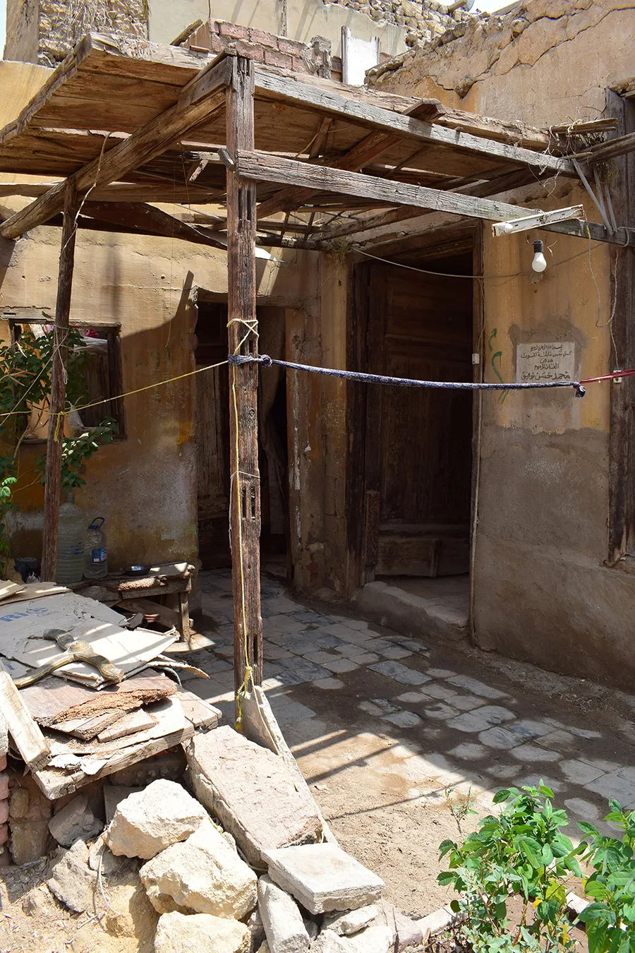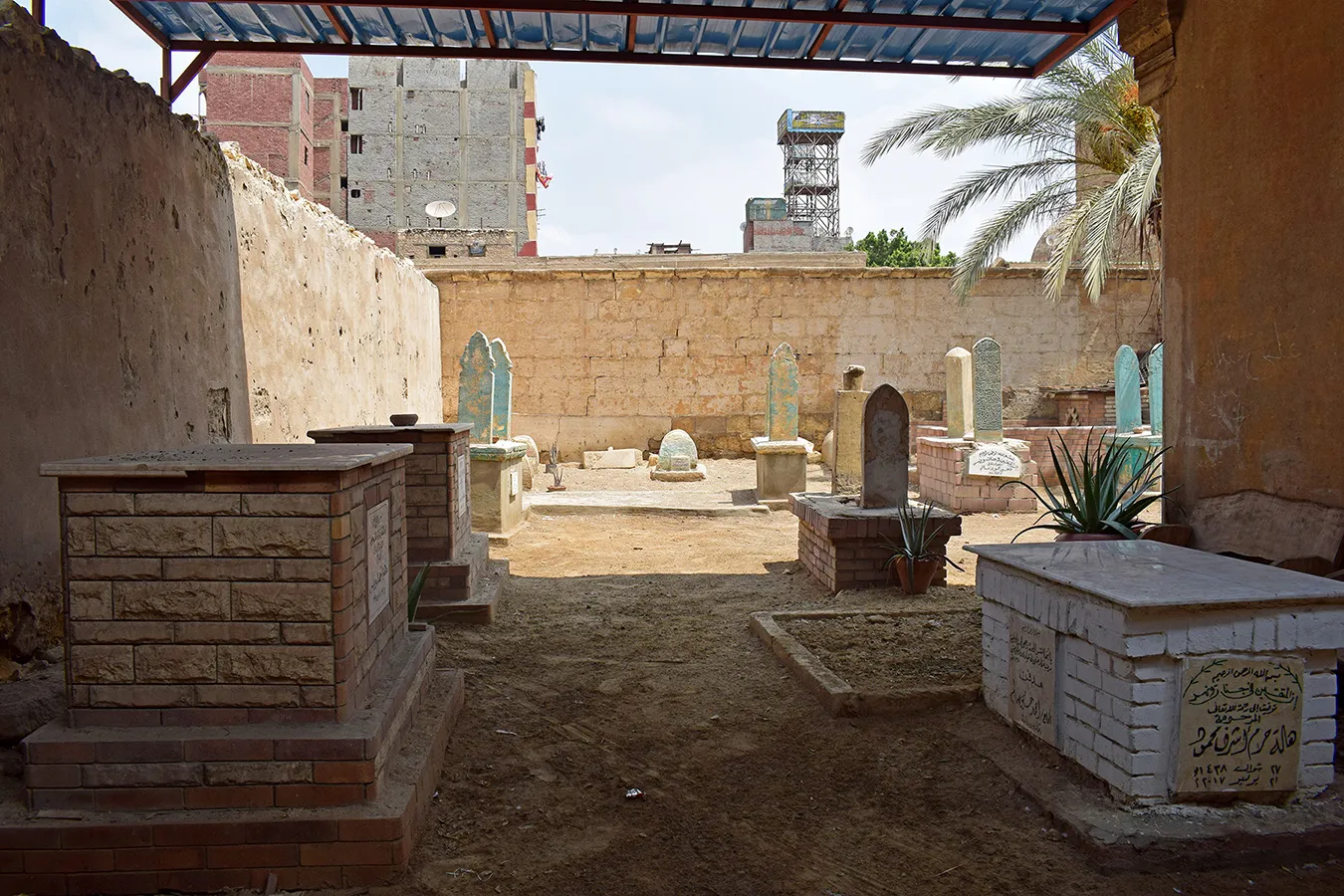 An annexe adjoins the enclosure to the west, with entrances from the street, where it continues the southern façade, and from the courtyard. The very simple structure has been recently covered with a simple roof of corrugated steel sheets on steel beams, with a roof lantern. In the room stands a richly carved marble cenotaph of Muhammad Bey Ibrahim, dated 4 Muharram 1326 AH [= 6 February AD 1908]. On the northern wall is mounted a richly carved marble side panel from another cenotaph, while on the eastern wall are twelve randomly placed commemorative marble plaques for people who died in the late 20th – early 21st centuries, the most recent of 2021.