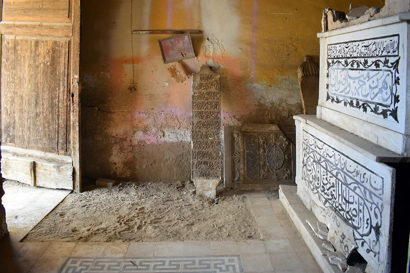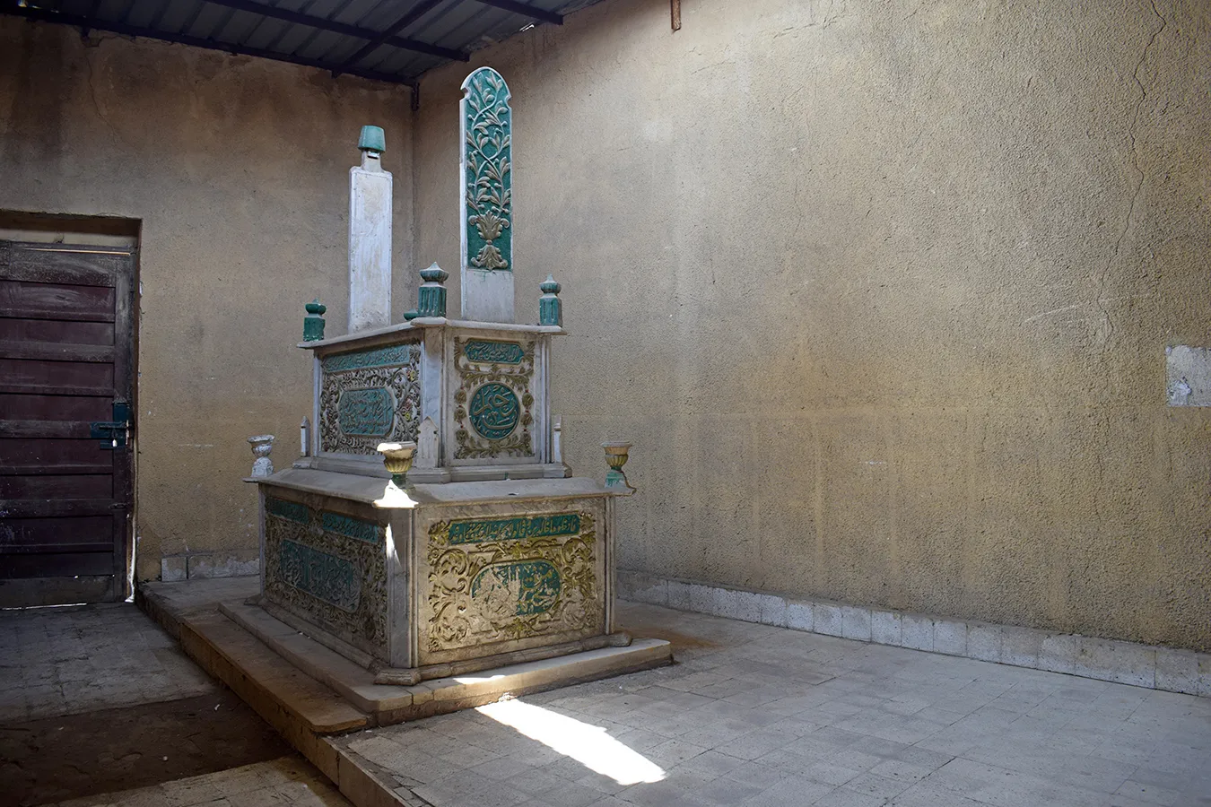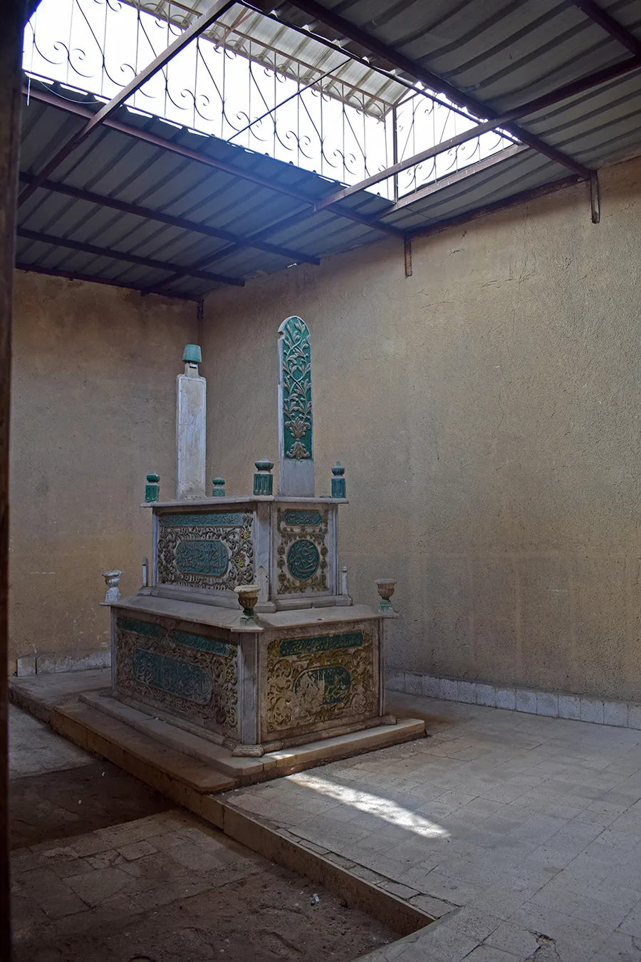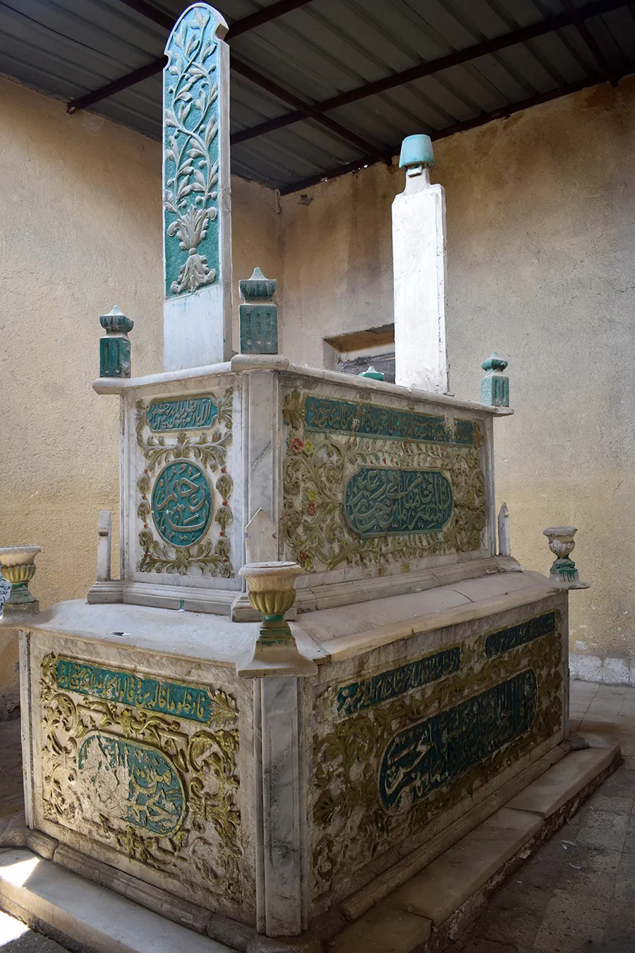 In one of the rooms by the eastern perimeter wall stands a decorated marble cenotaph dated to AH 1348 / AD 1929. In the room are stored marble pieces from other cenotaphs, including shahid stelae, one of a woman called Kalrab married to a man called Gentemkan (definitely not Arabic names), dated to AH 1282 (?) [= AD 1865], another dated 27 Muharram 1287 [= 28 April AD 1870]. A plaque on the courtyard wall next to the door to the chamber commemorates the artist (presumably an actor) Muhammad Hasan Tawfiq who died in AH 1424 / AD 2003.