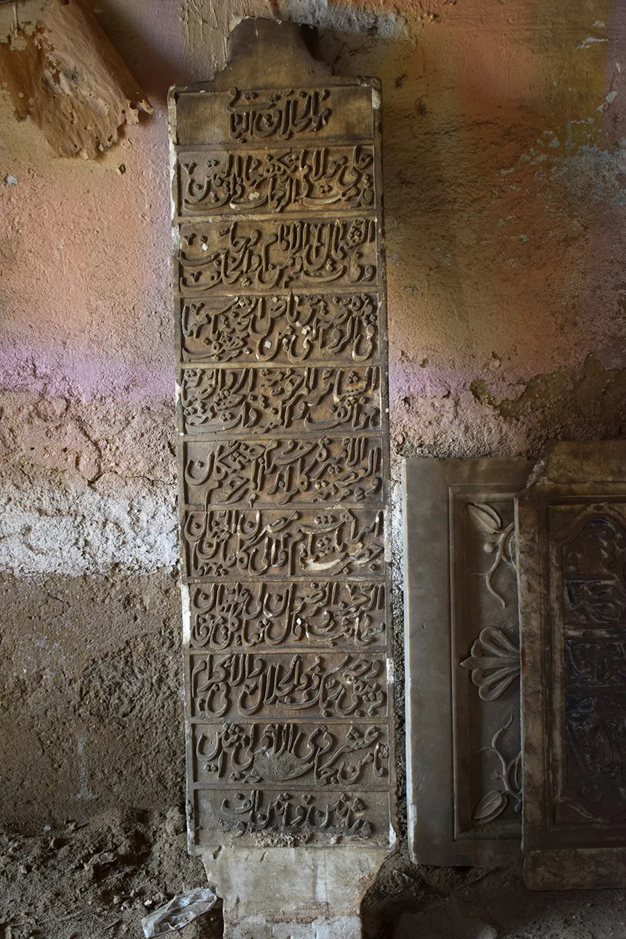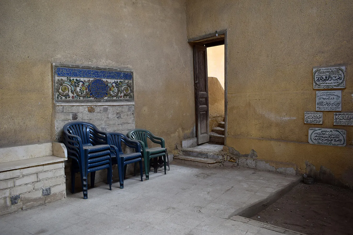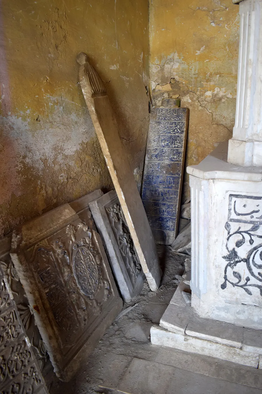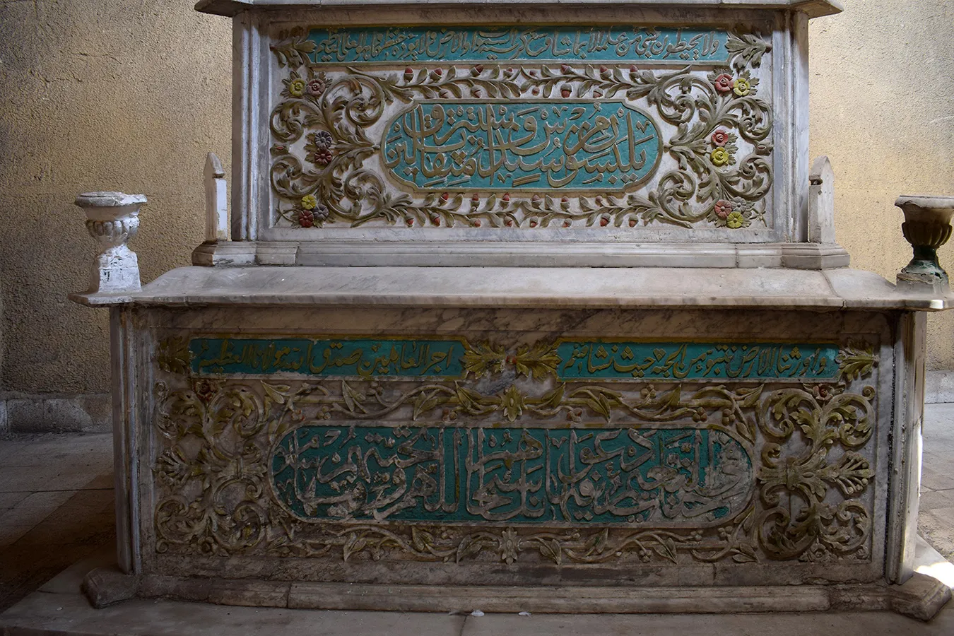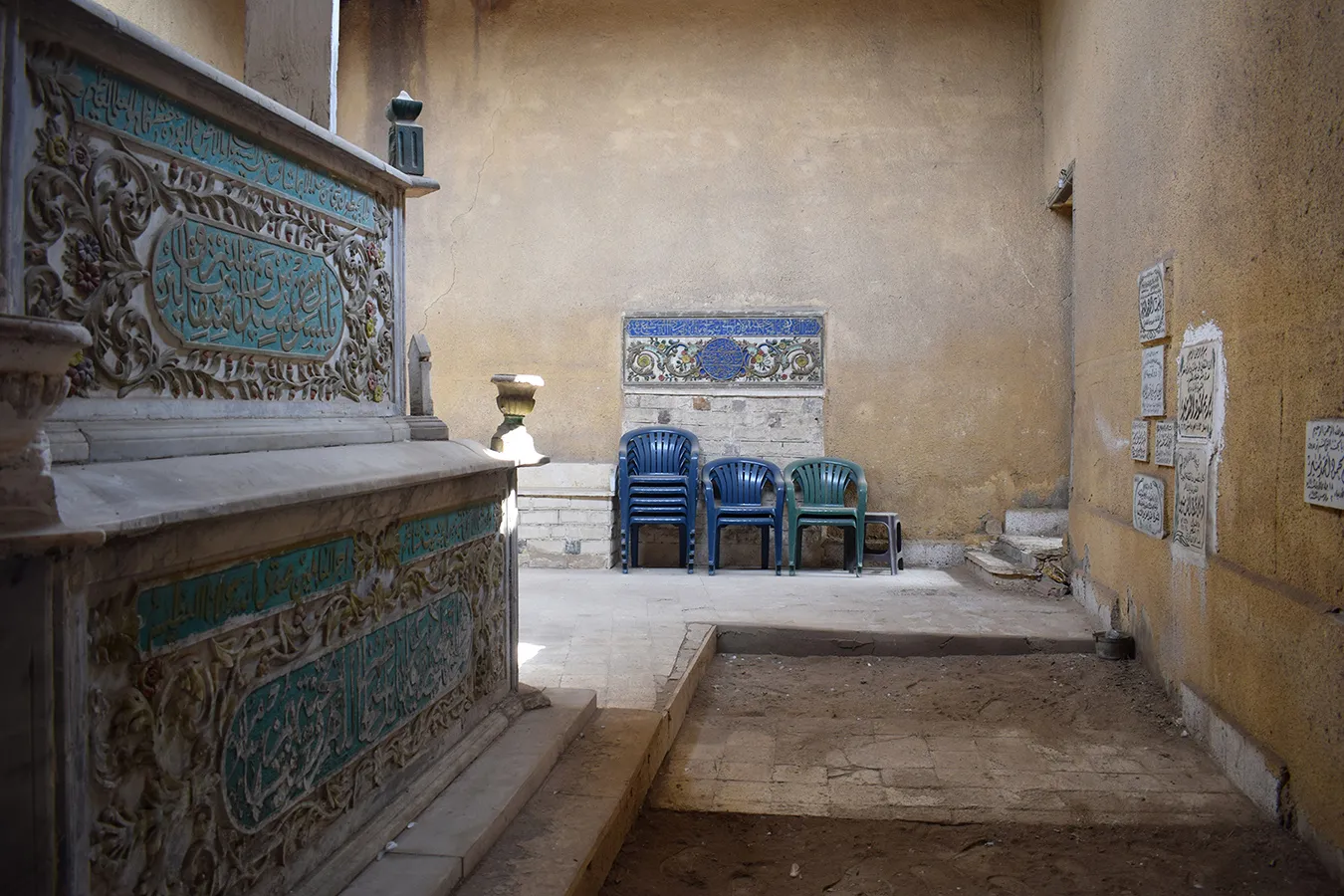 In one of the rooms by the eastern perimeter wall stands a decorated marble cenotaph dated to AH 1348 / AD 1929. In the room are stored marble pieces from other cenotaphs, including shahid stelae, one of a woman called Kalrab married to a man called Gentemkan (definitely not Arabic names), dated to AH 1282 (?) [= AD 1865], another dated 27 Muharram 1287 [= 28 April AD 1870]. A plaque on the courtyard wall next to the door to the chamber commemorates the artist (presumably an actor) Muhammad Hasan Tawfiq who died in AH 1424 / AD 2003.