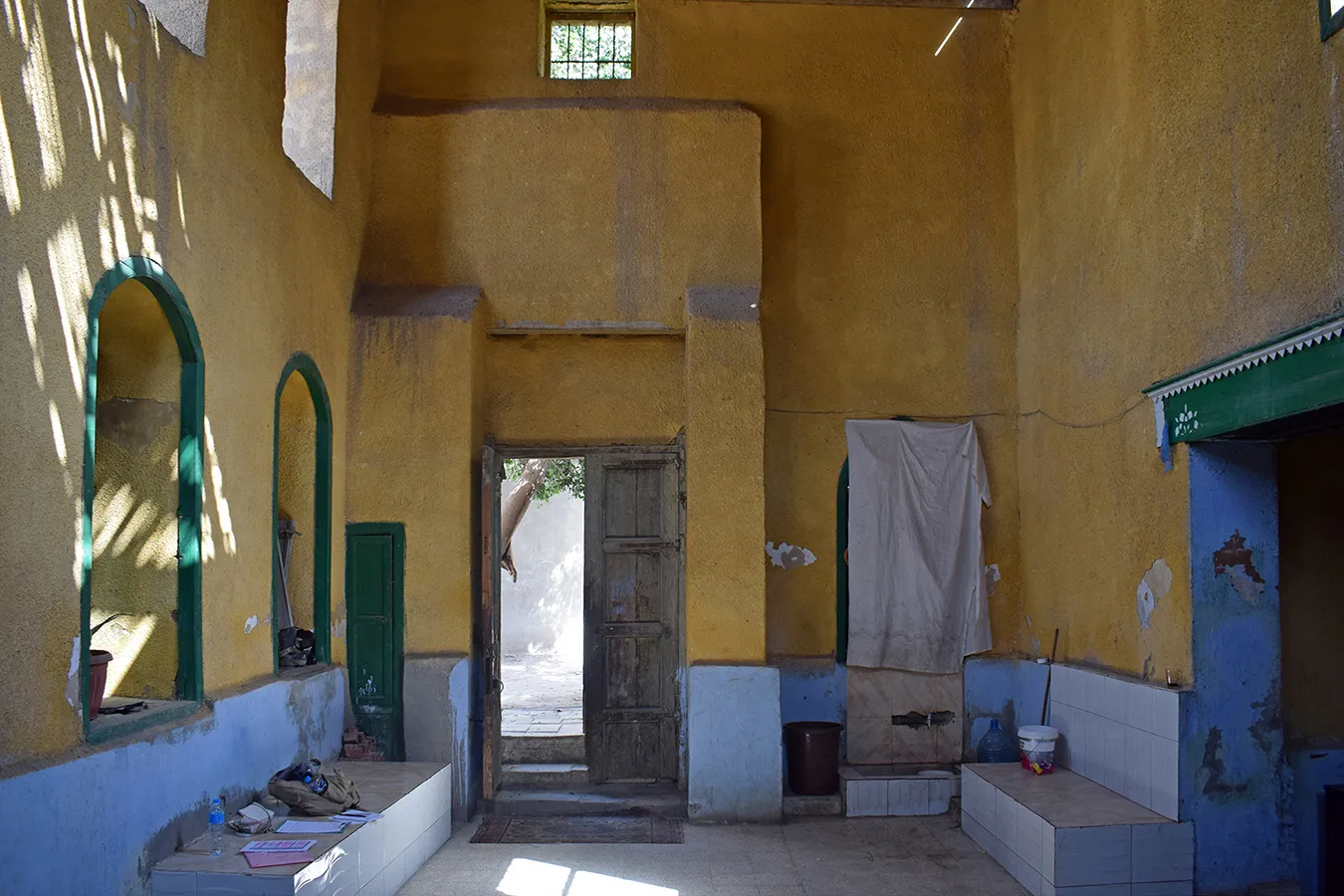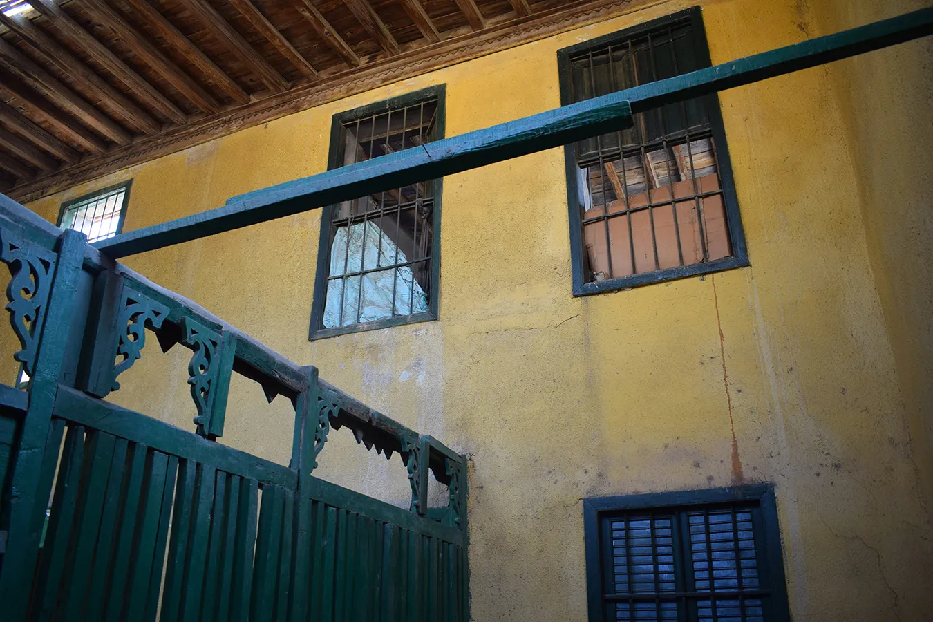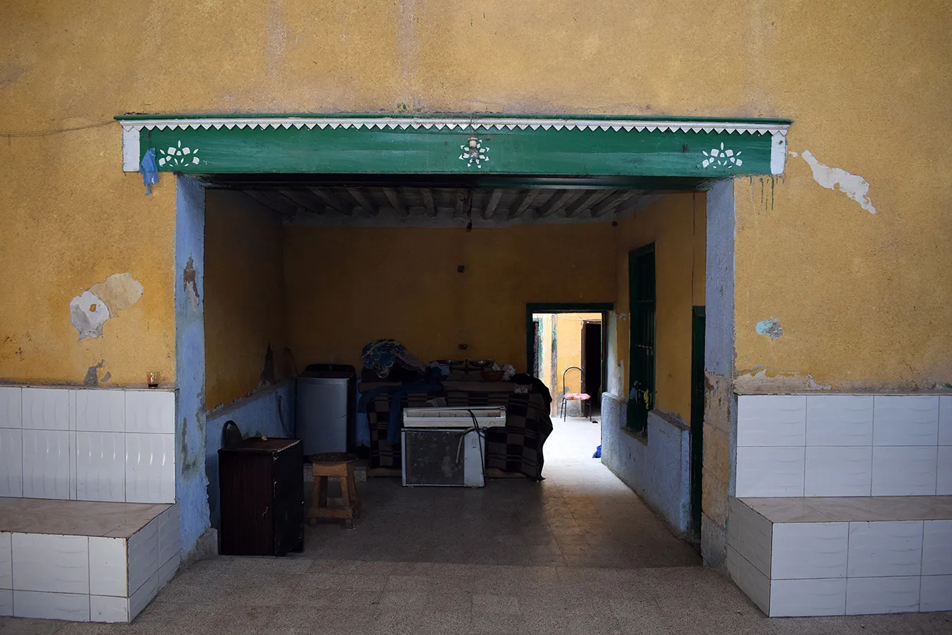 In the southern interior wall of the burial space, a wide rectangular opening leads into a lobby of the residential section and an adjoining room. The lobby leads into a small courtyard, including 2 kitchen spaces on the western perimeter of the enclosure, a shared toilet on the south-eastern corner, and two bedrooms on the south side, where one of the bedrooms is accessed from a corridor that also leads to a staircase leading into 4 bedrooms and a lobby on the upper floor, with one of the rooms overlooking the double-height burial space.