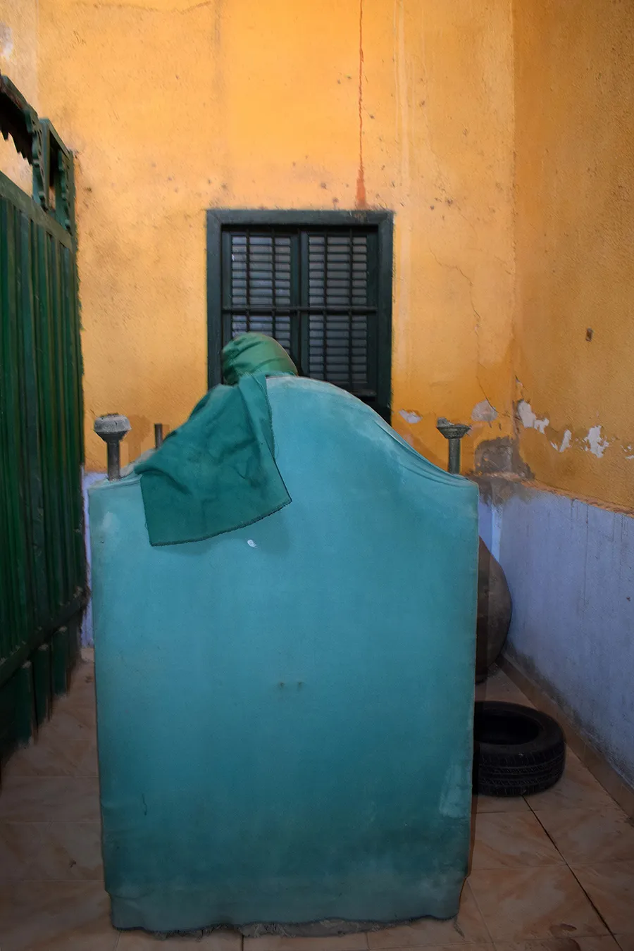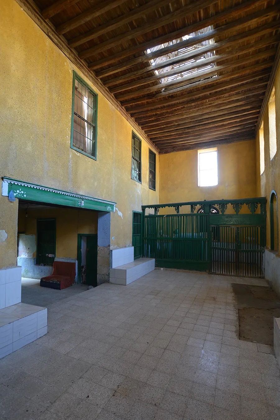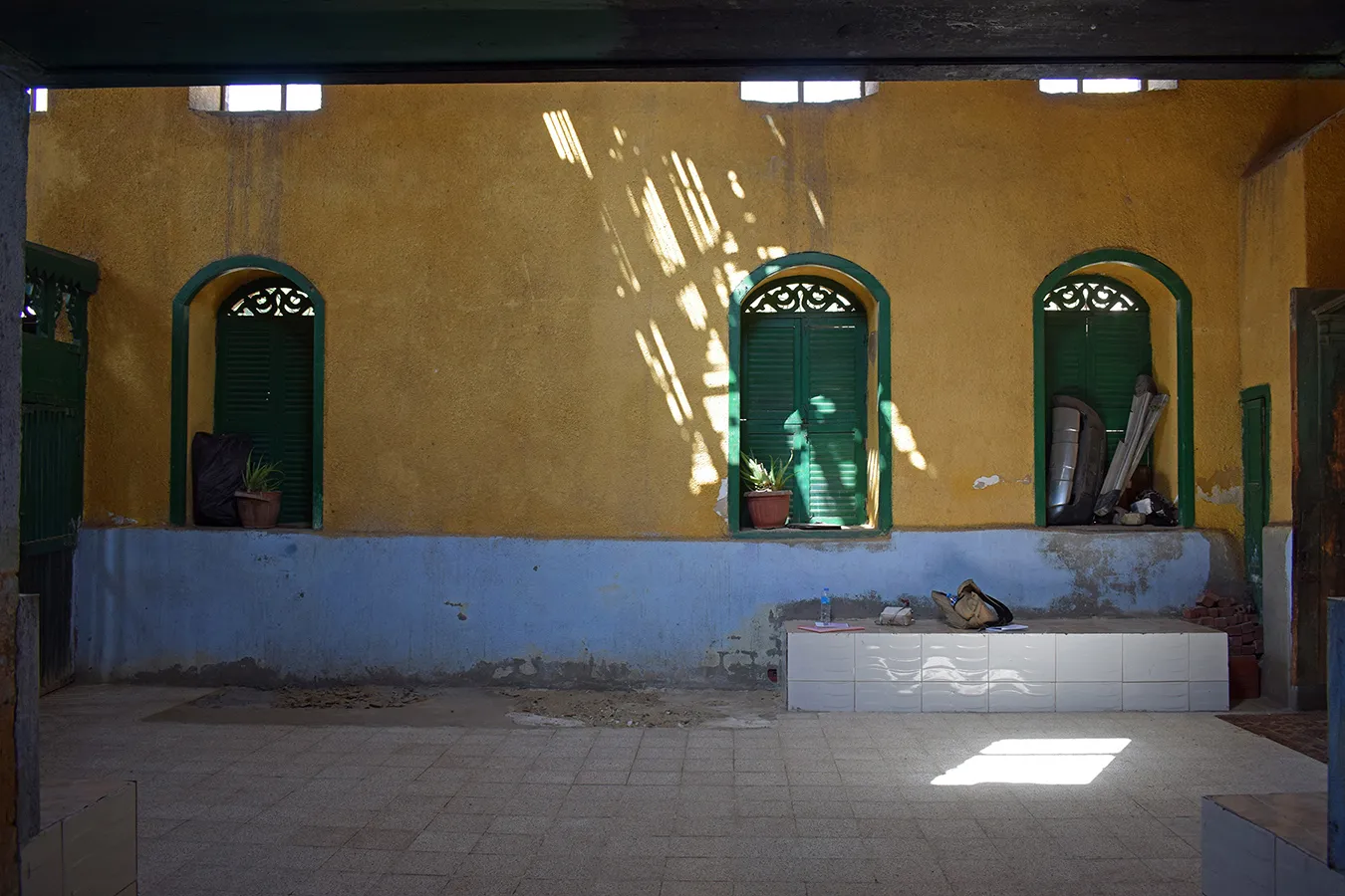 In the southern interior wall of the burial space, a wide rectangular opening leads into a lobby of the residential section and an adjoining room. The lobby leads into a small courtyard, including 2 kitchen spaces on the western perimeter of the enclosure, a shared toilet on the south-eastern corner, and two bedrooms on the south side, where one of the bedrooms is accessed from a corridor that also leads to a staircase leading into 4 bedrooms and a lobby on the upper floor, with one of the rooms overlooking the double-height burial space.