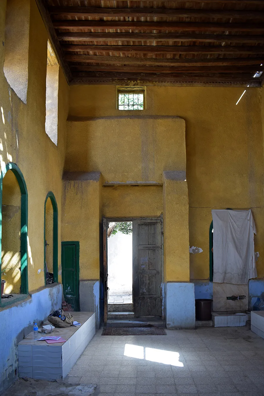 The shrine is a free-standing, U-shaped structure with the double-height shrine chamber in the northern part and two-storied residential unit with a small courtyard to the south of it. The lower storey is built of irregular coursed stone masonry with corners, base course, cornice, and the entrance porch built of ashlar stone, while the upper floor is entirely built of rubble stone and plastered. The entrance in the shorter wall of the rectangular shrine is from the east. The recessed entrance is topped by a simple, undecorated trefoil arch. There is a segmental relieving arch over the stone lintel of the main door, above which the name of the shaykh buried in the shrine and a date of his death have been recently rather crudely painted. The wooden door leaves have a simple decoration based on Classical motifs. The doorway leads into a double-height spacious burial chamber with windows in two levels (the lower-level ones cowered with semicircular arches and the large upper-level windows rectangular.) An uninscribed wooden tomb marker covered in green cloth is placed at the fat end of the hall behind a simple wooden screen with openwork wooden ornaments in the upper section. Similar ornaments are placed in the arches of the lower-level windows, over the louvre window shutters.