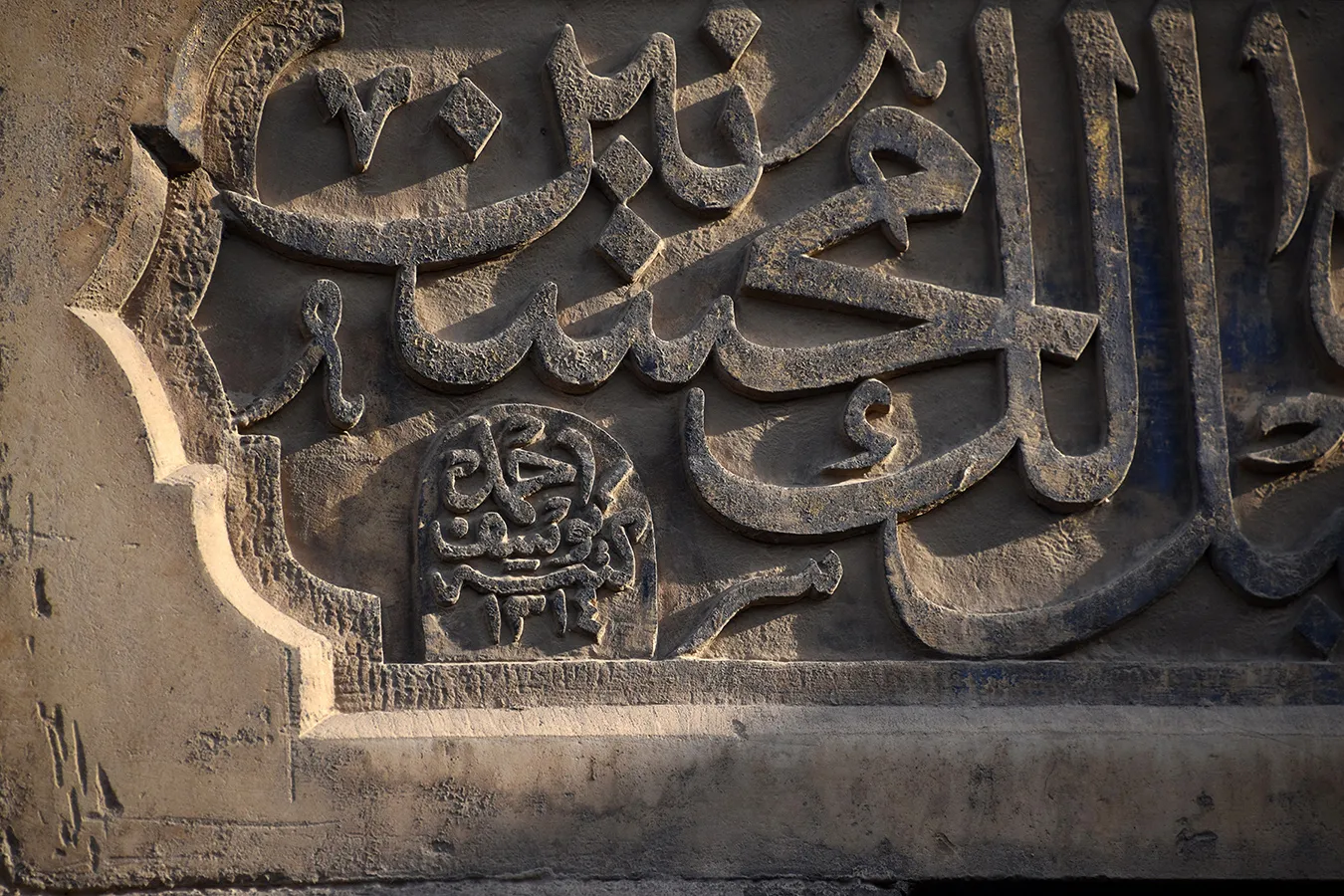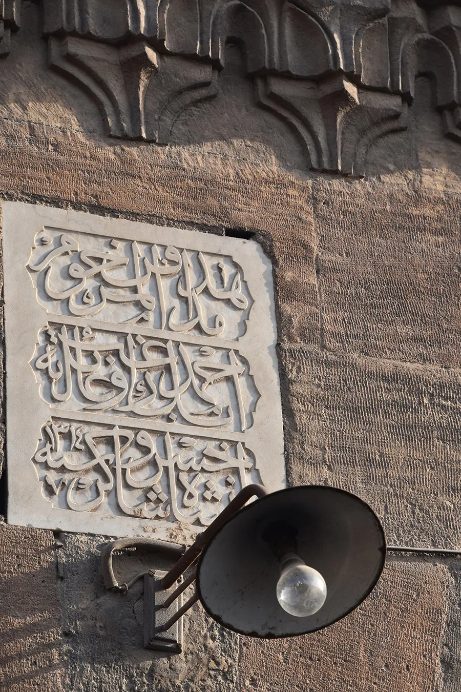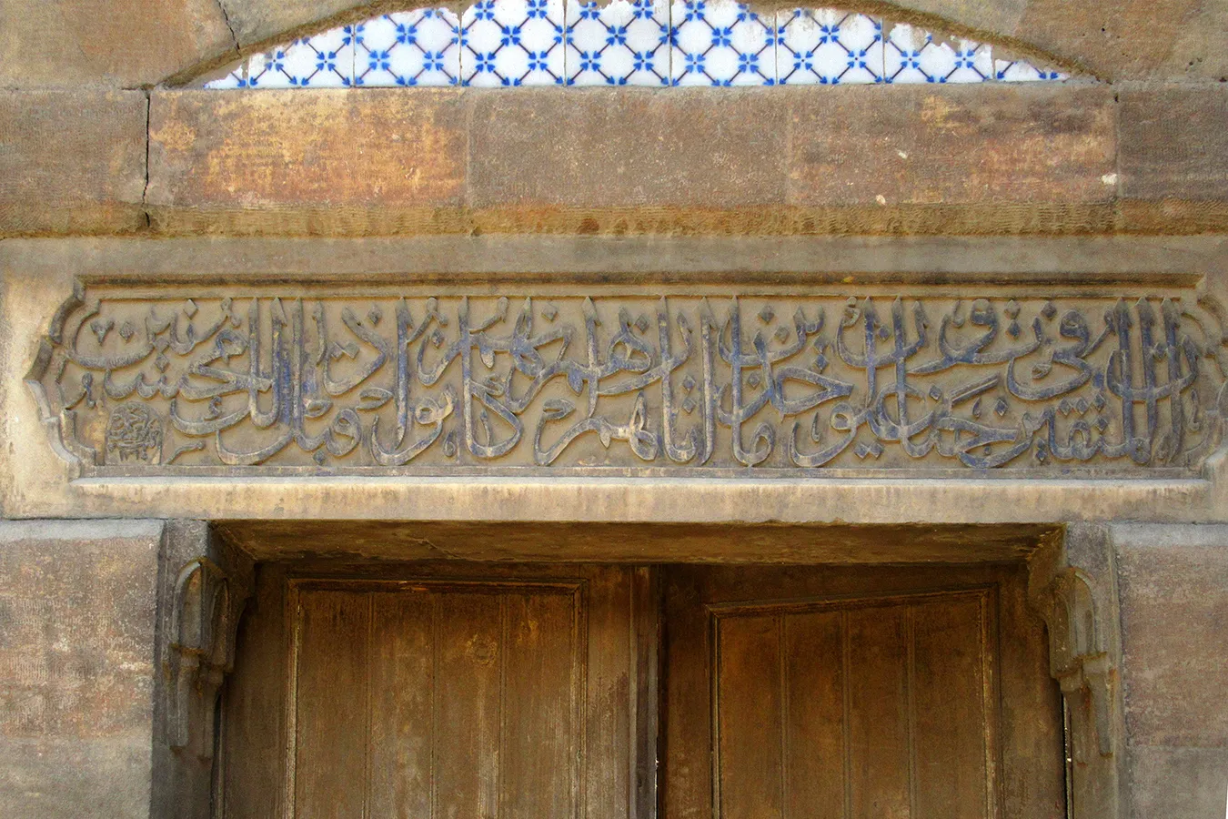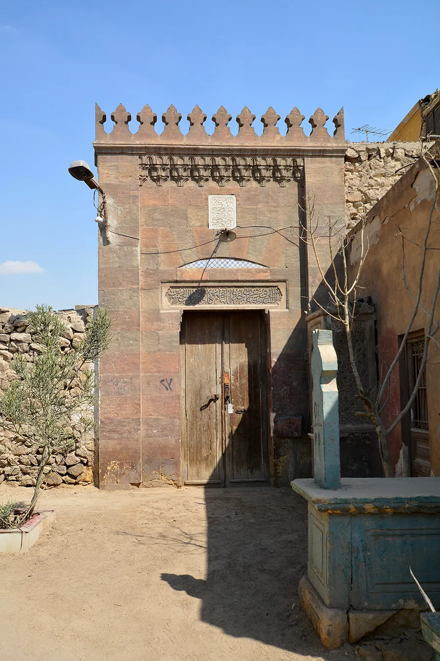 The neo-Mamluk entrance portal of finely dressed ashlar stone is in the north-western corner of the enclosure, the rest of the eastern wall being blocked by the neighbouring funerary enclosure. The rectangular entrance door is set in a shallow full-height recess topped with a three-tiered muqanas frieze. The door lintel is a monolithic block of marble with an inscription panel in fine calligraphic script, signed by the calligrapher Ahmad Yusuf and dated AH 1314. Over the door is a segmental relieving arch with white-and-blue ceramic tiles in its lunette, and above it, a rectangular panel with the foundation inscription. The Mamluk-style fleur-de-lys crenellation over the portal does not continue over the perimeter wall built of rough stone.