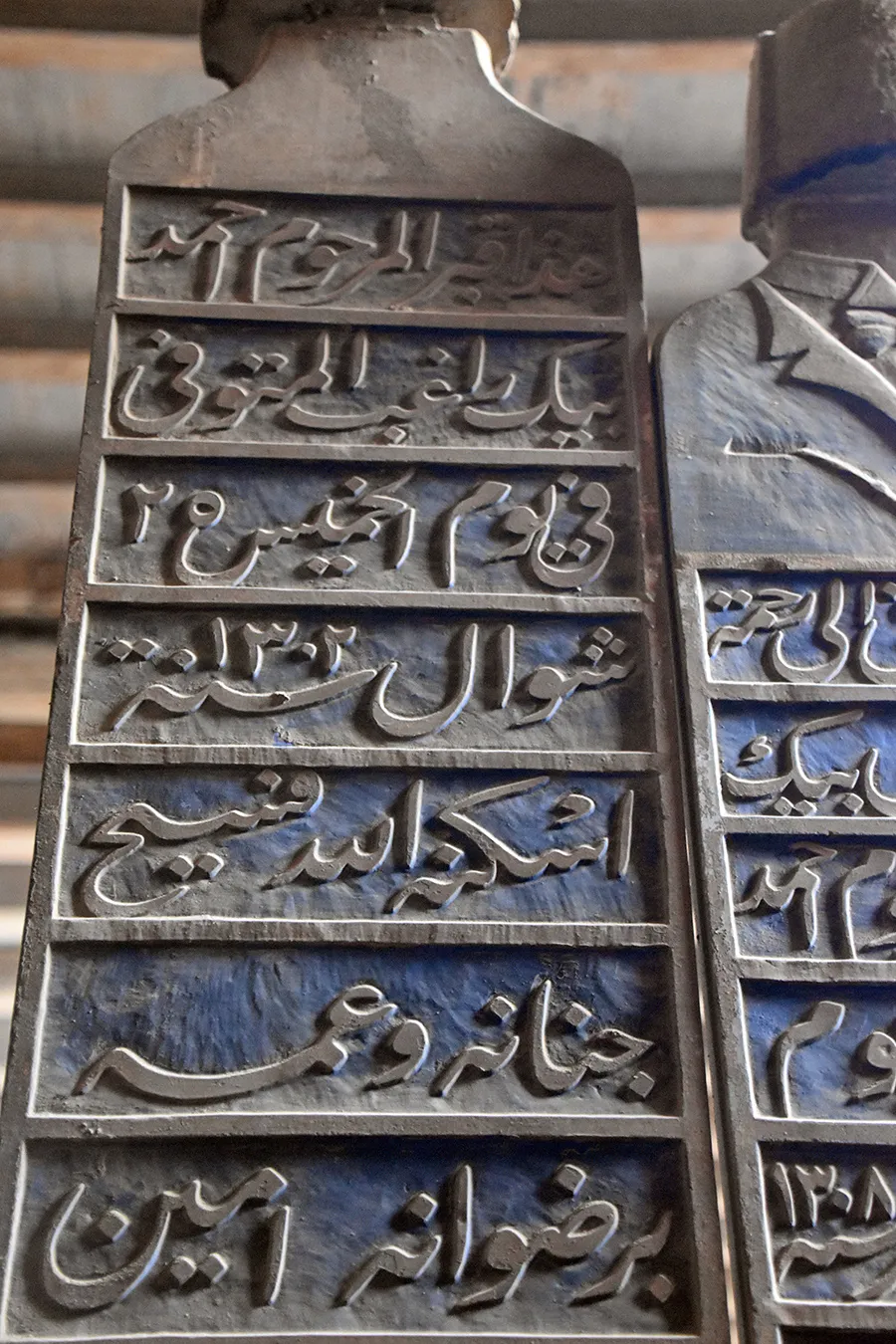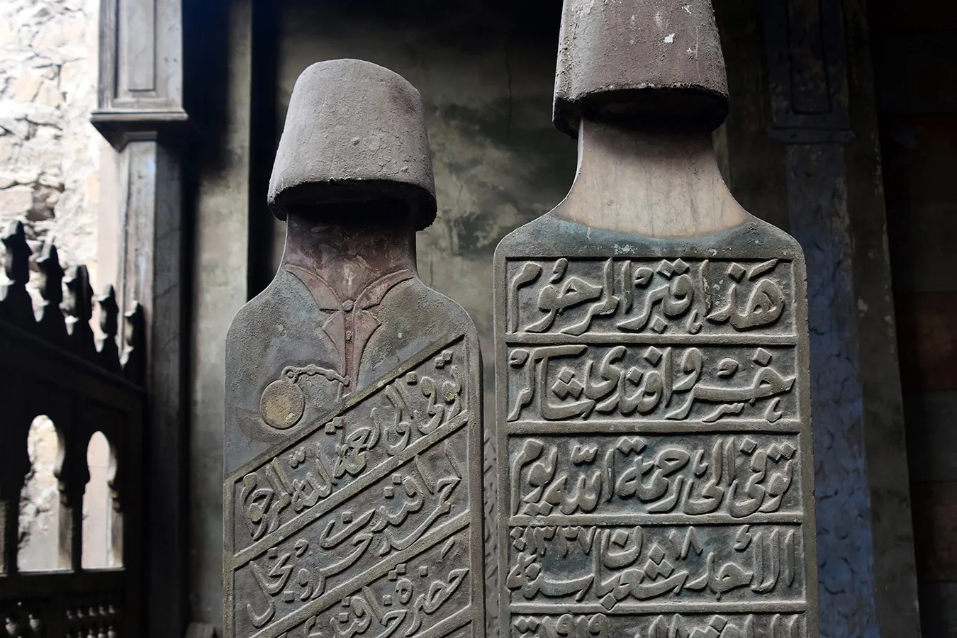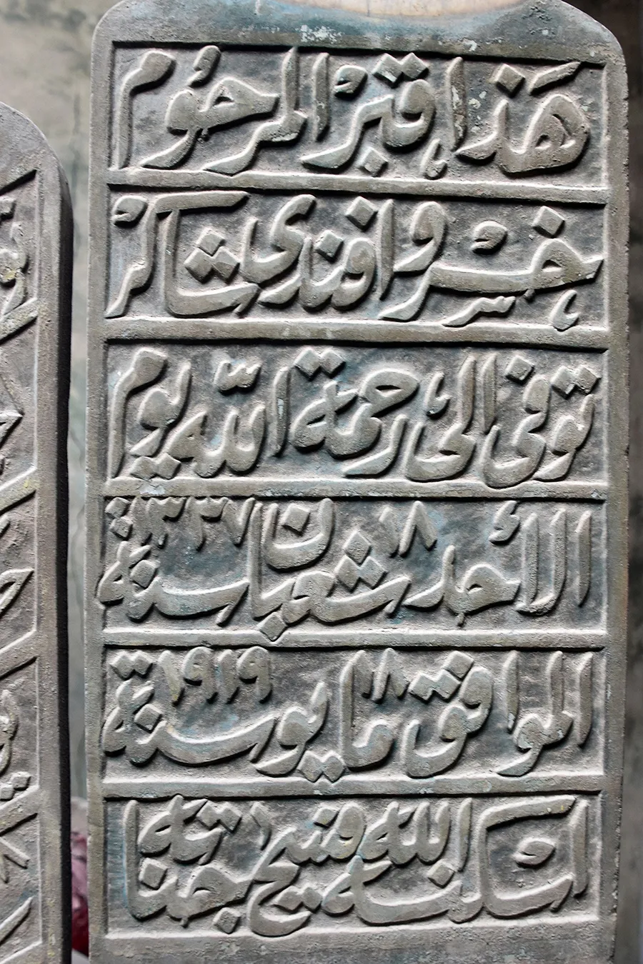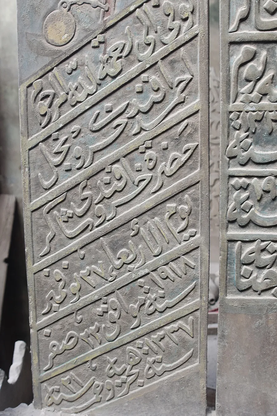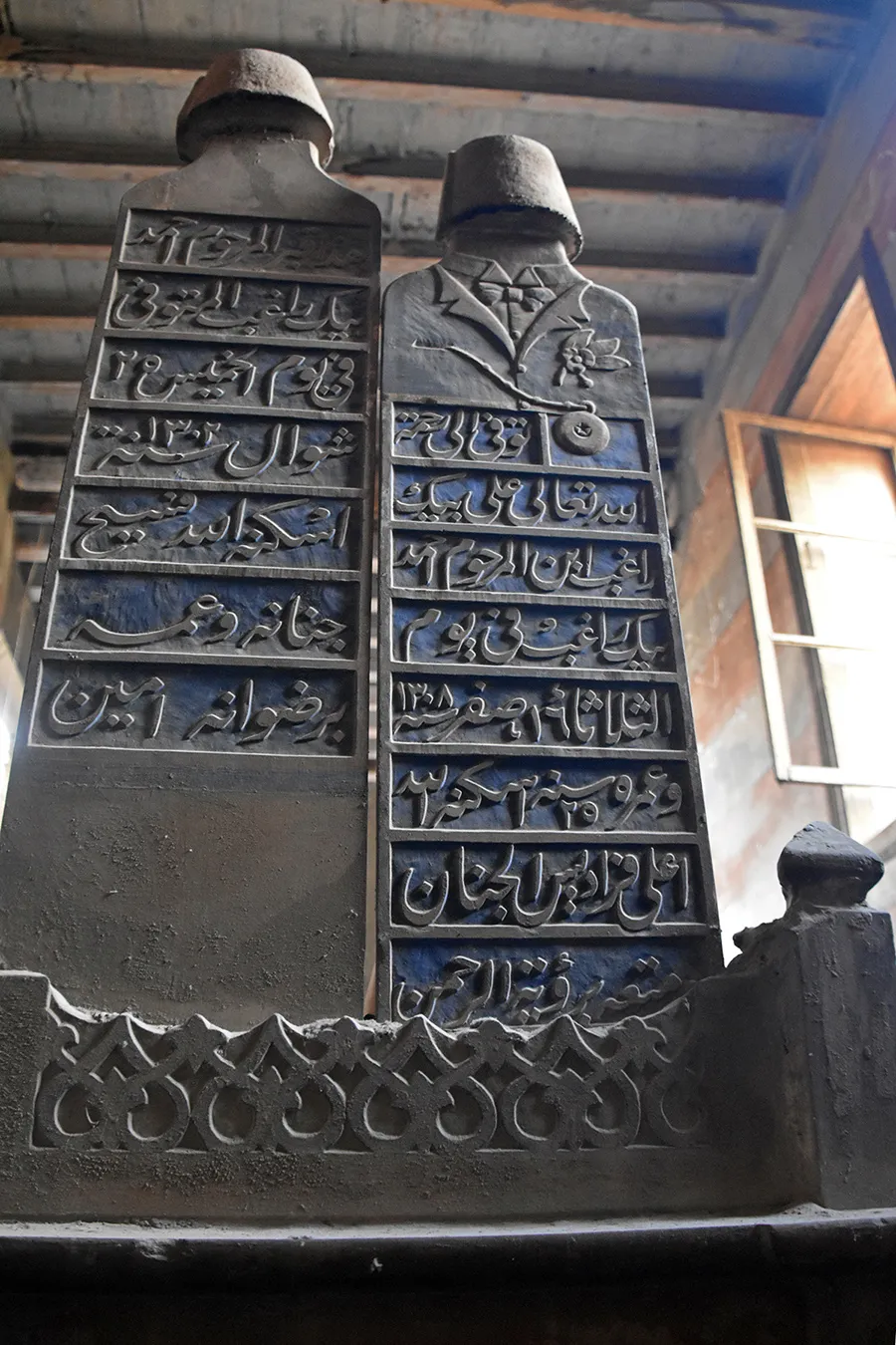 In the shaded burial area are six carved marble cenotaphs, some with multiple shahid stelae. The earliest date is this of Ahmad Bey Raghib’s death: 25 Shawwal 1302 AH [corresponding to 6 August AD 1885]. Other dates are mostly from the 1910s, the latest is 1925. Some of the shahid stelae are highly unusual in representing men’s torsos in naturalistically depicted clothing, complete with lapels, bowties and pocket watches on watch chains. There is also one uninscribed limestone cenotaph inside the courtyard.