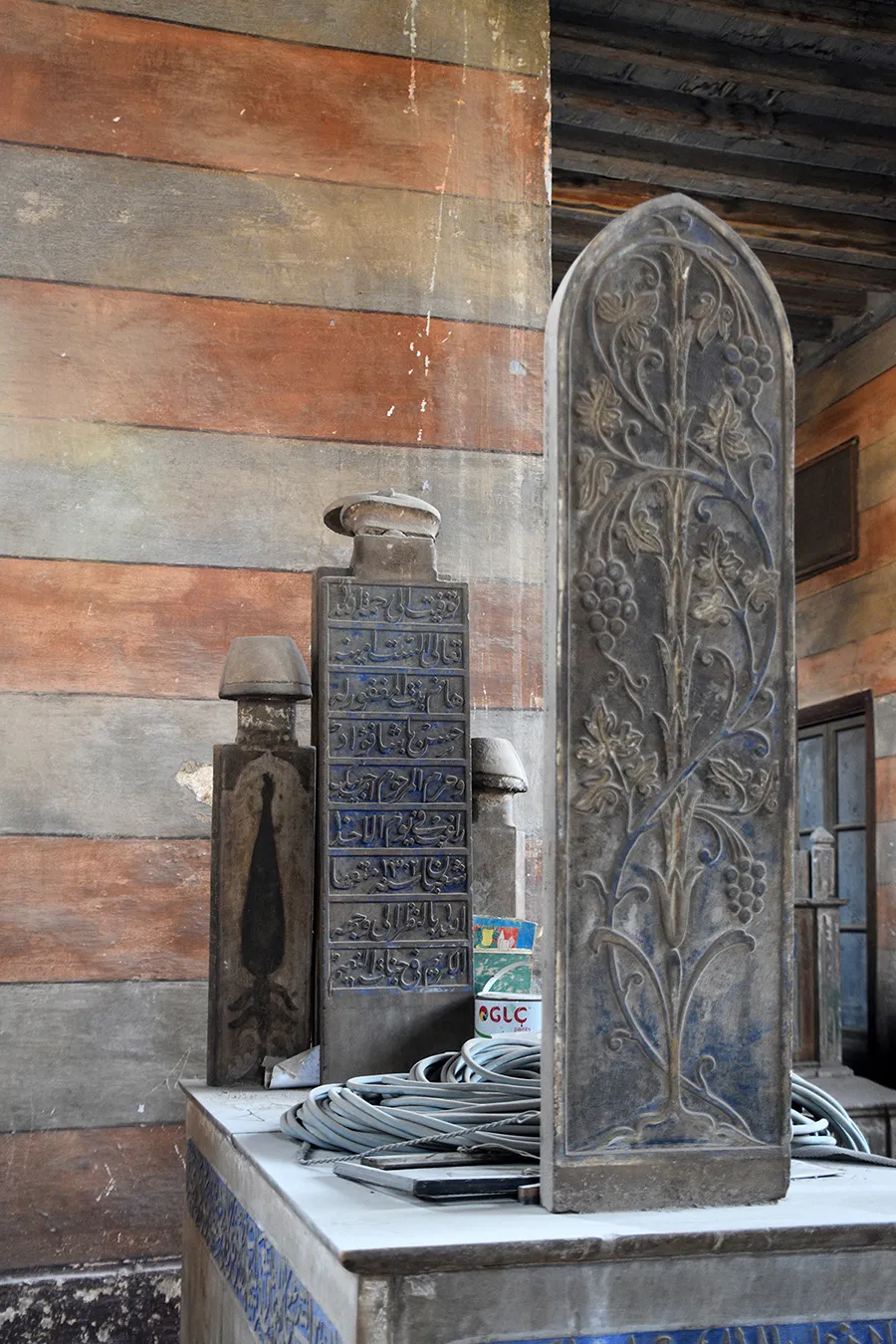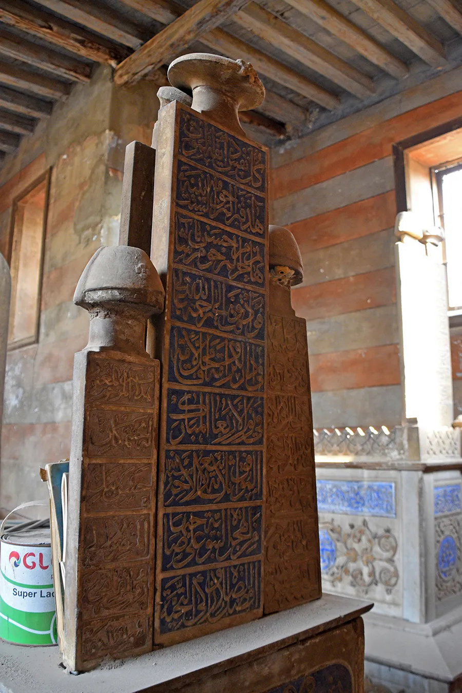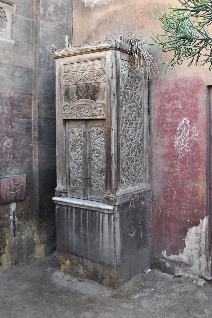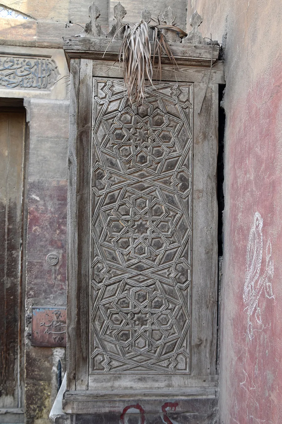 In front of the gate and against the wall of the neighbouring enclosure stands a sabil, which is a wooden cupboard-like structure on a simple marble base. The walls of the sabil are geometric panels of very high quality of design and of joinery. Over the door is an imitation in wooden panels of a relieving arch of joggled voissoirs. The inscription panel over the sabil door is dated AH 1347 [corresponds to AD 1928).