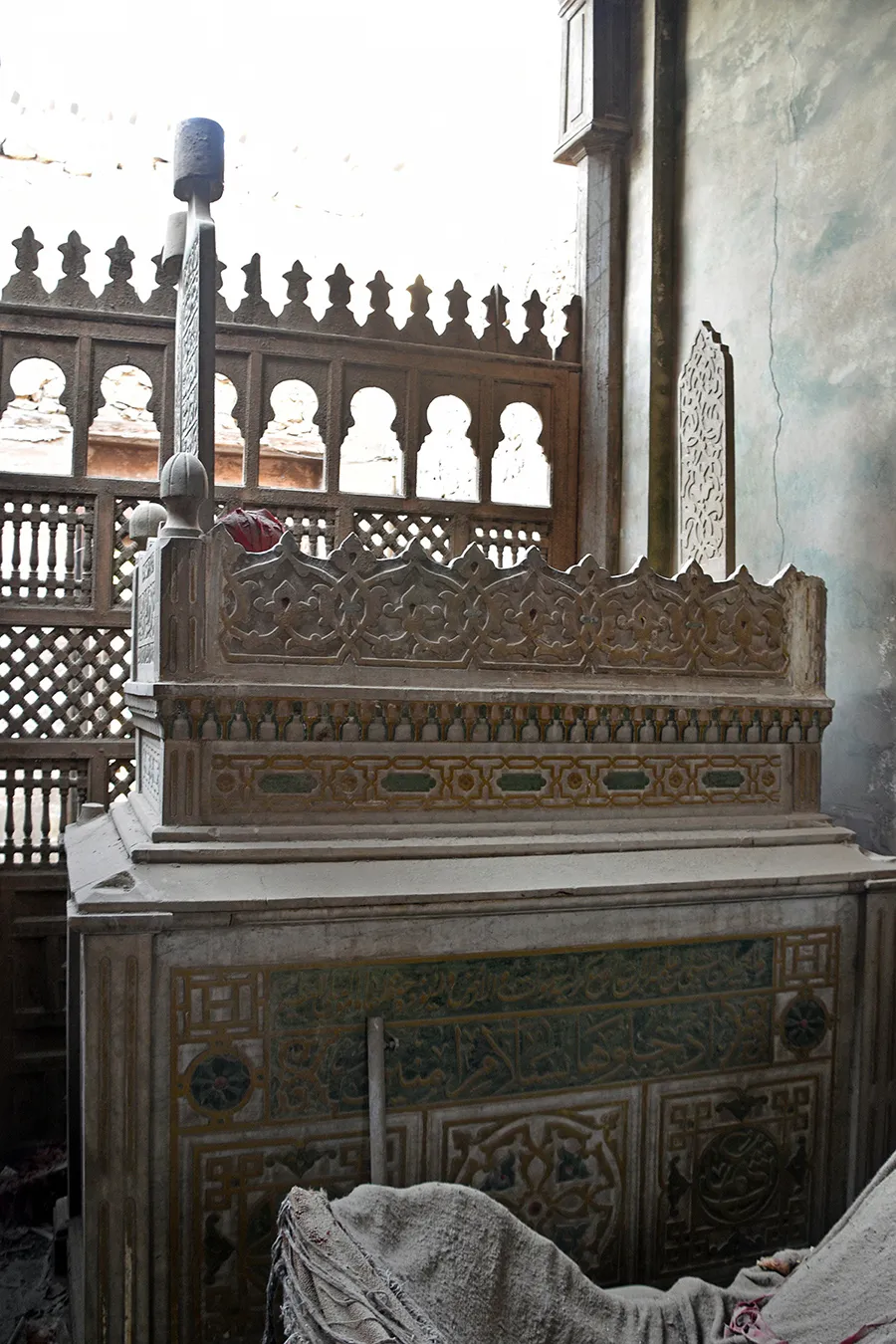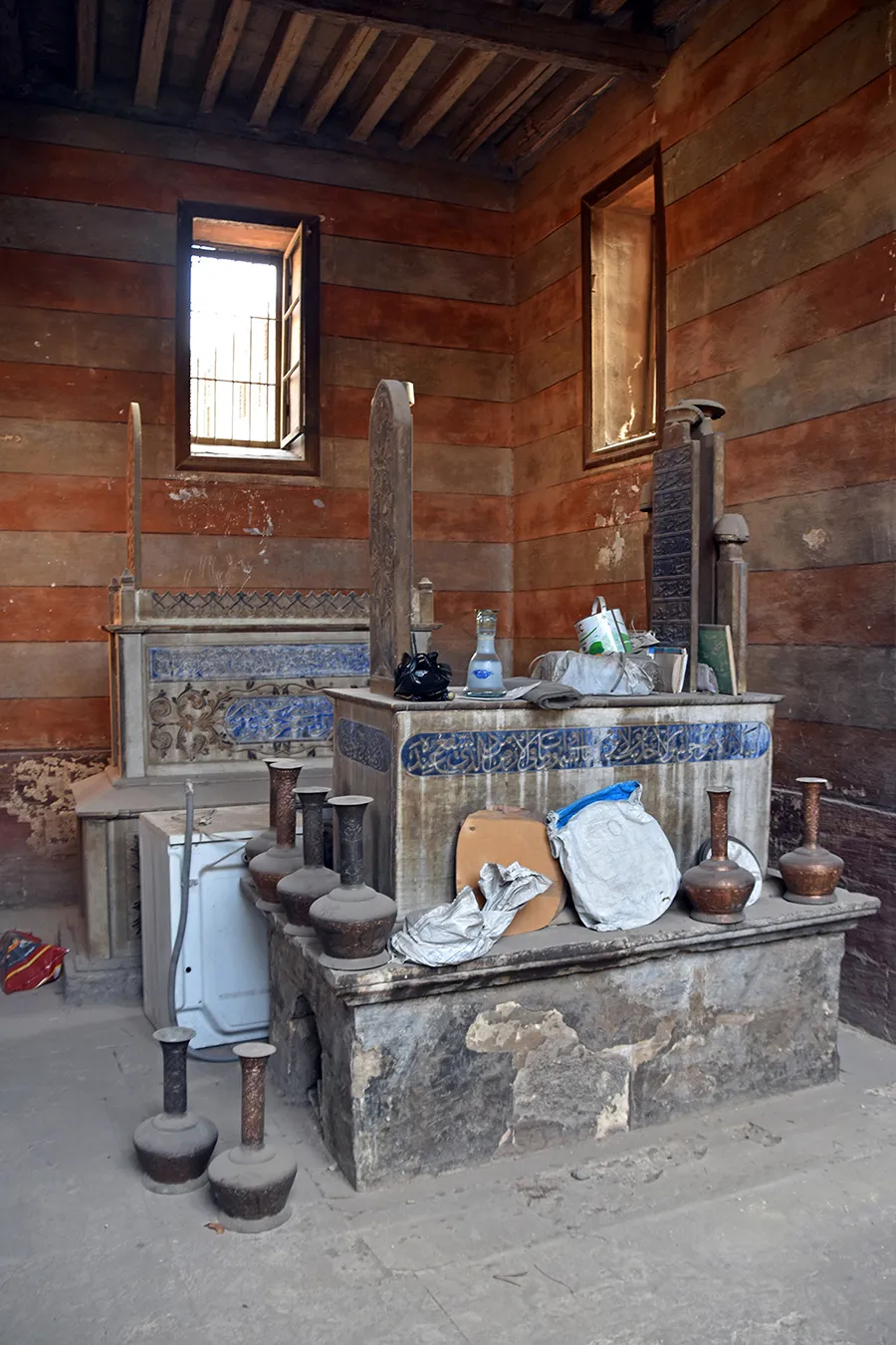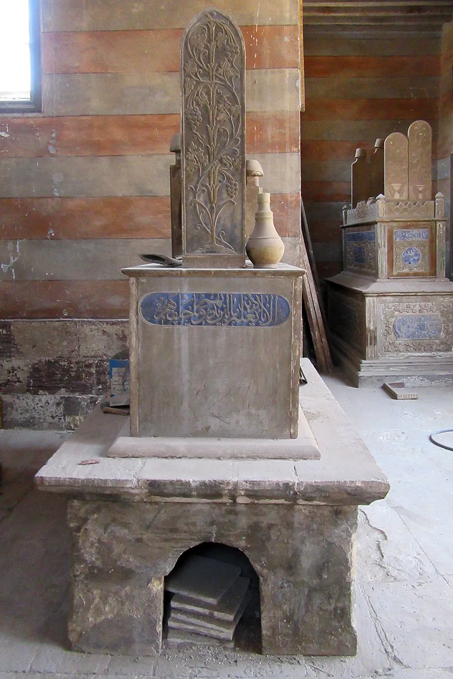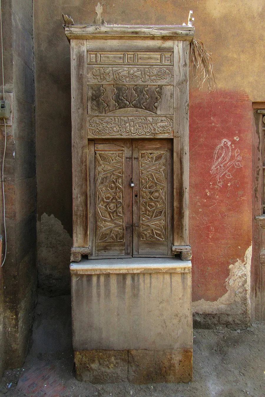 In front of the gate and against the wall of the neighbouring enclosure stands a sabil, which is a wooden cupboard-like structure on a simple marble base. The walls of the sabil are geometric panels of very high quality of design and of joinery. Over the door is an imitation in wooden panels of a relieving arch of joggled voissoirs. The inscription panel over the sabil door is dated AH 1347 [corresponds to AD 1928).