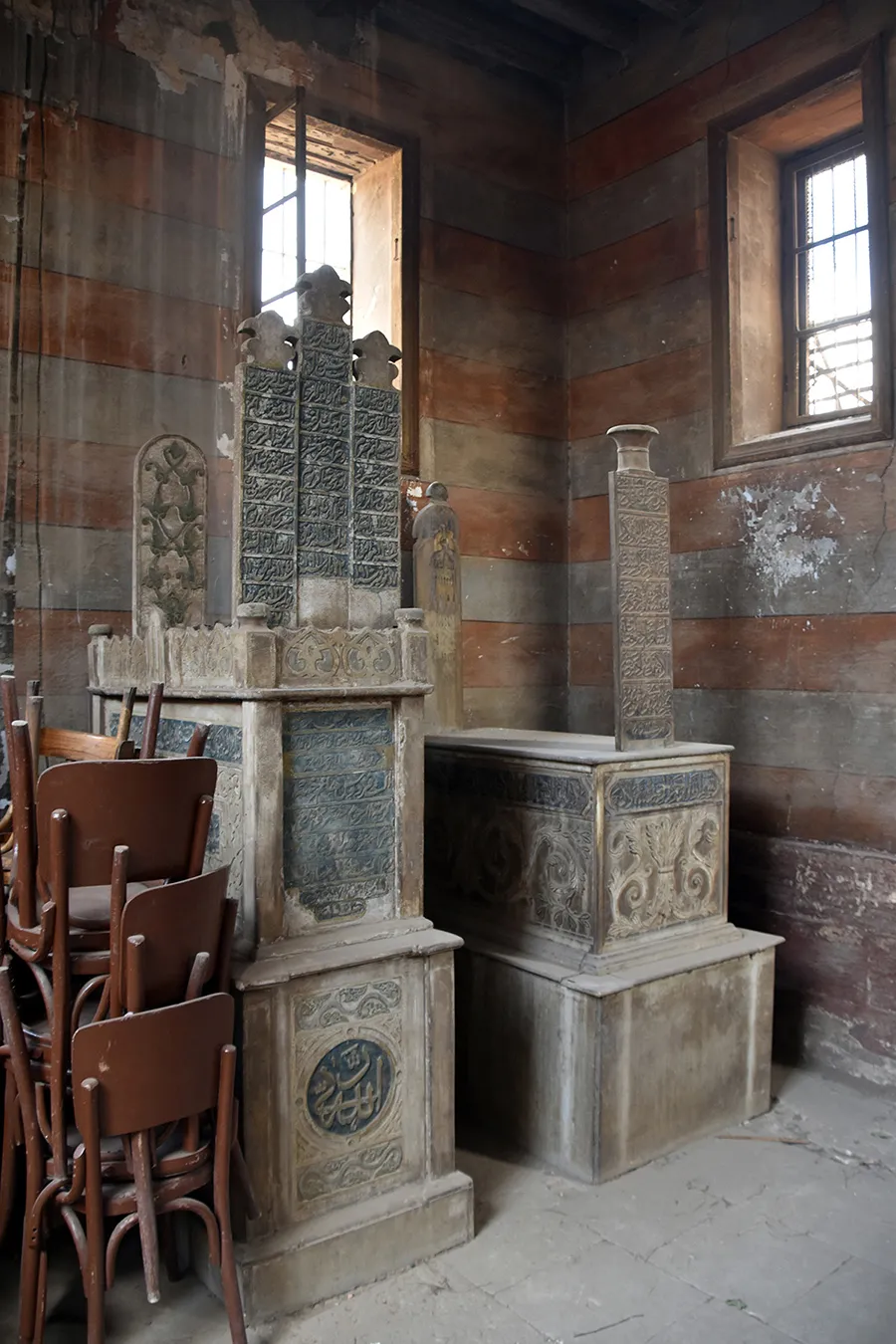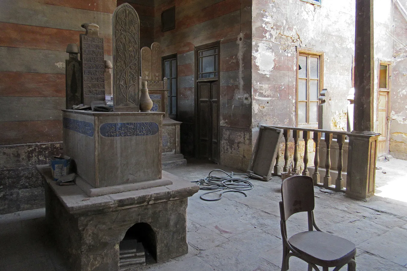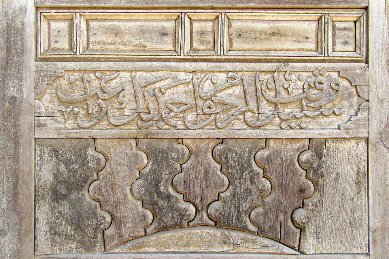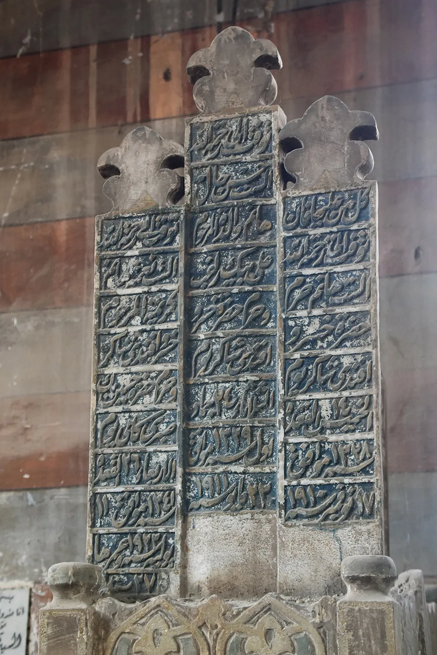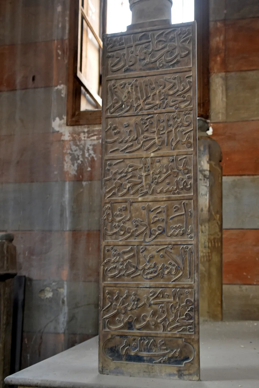 In front of the gate and against the wall of the neighbouring enclosure stands a sabil, which is a wooden cupboard-like structure on a simple marble base. The walls of the sabil are geometric panels of very high quality of design and of joinery. Over the door is an imitation in wooden panels of a relieving arch of joggled voissoirs. The inscription panel over the sabil door is dated AH 1347 [corresponds to AD 1928).