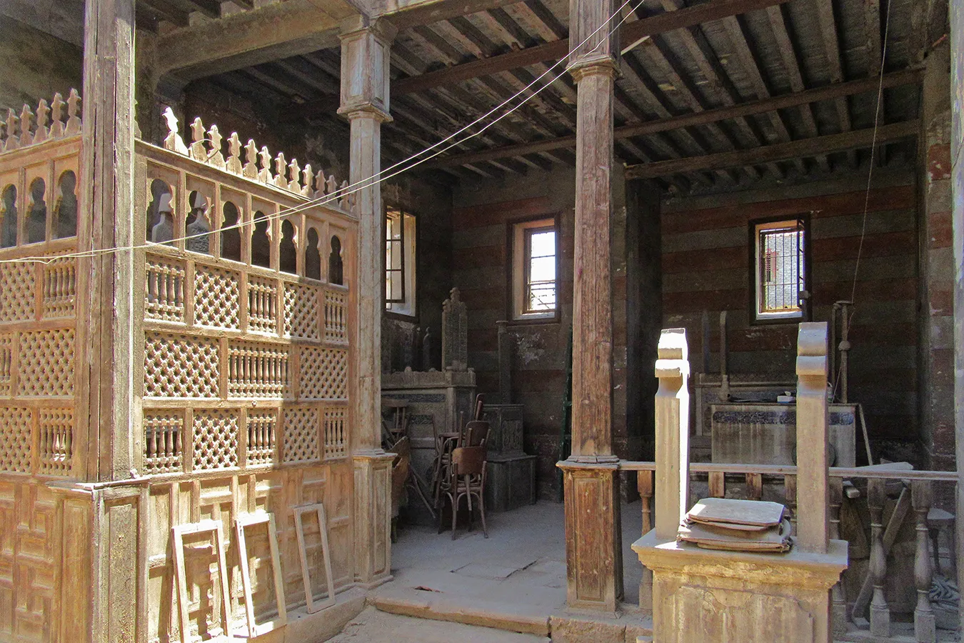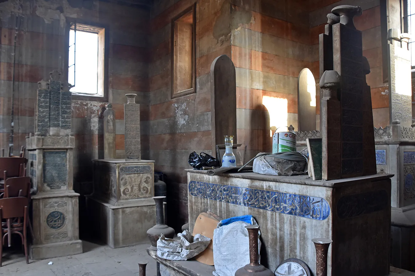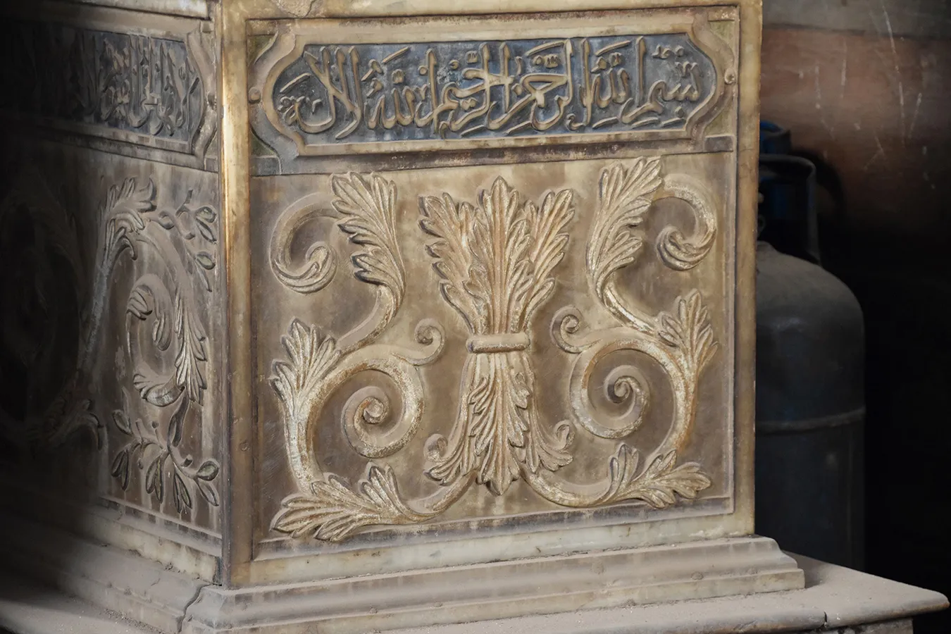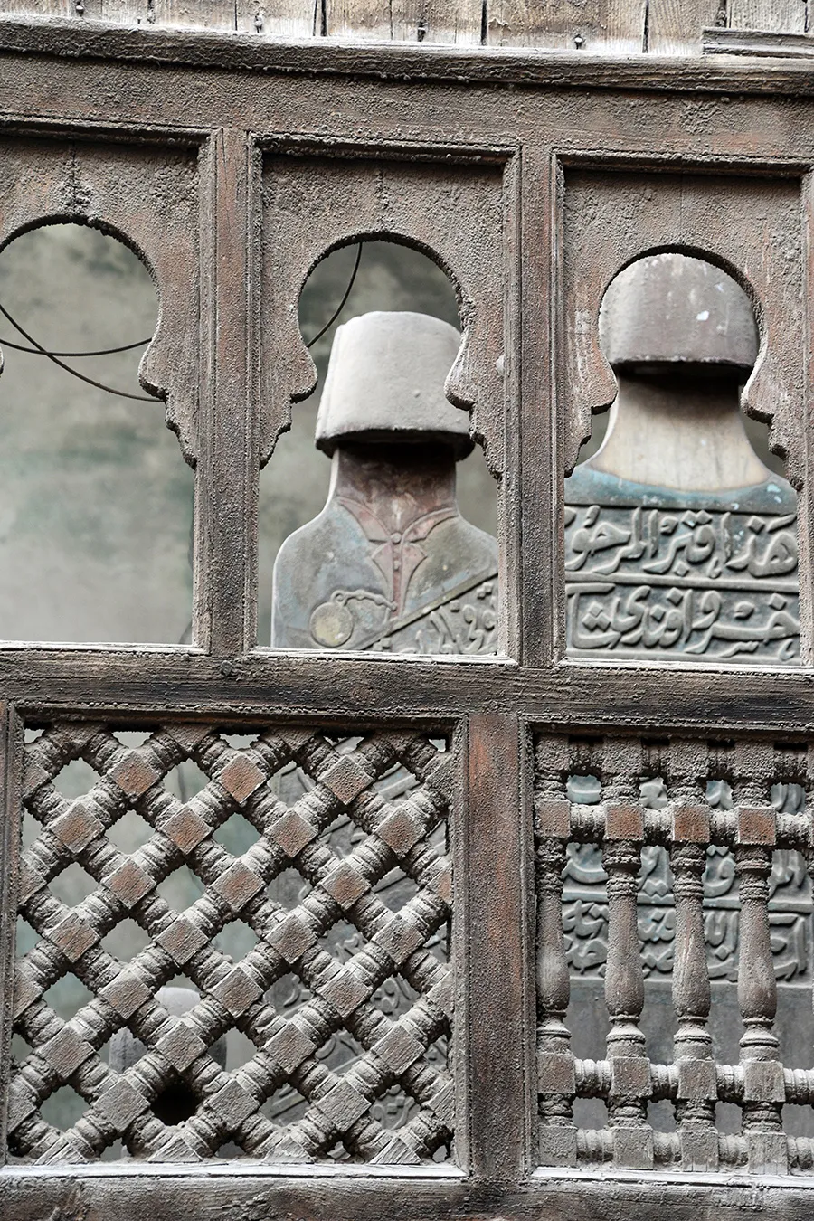 In front of the gate and against the wall of the neighbouring enclosure stands a sabil, which is a wooden cupboard-like structure on a simple marble base. The walls of the sabil are geometric panels of very high quality of design and of joinery. Over the door is an imitation in wooden panels of a relieving arch of joggled voissoirs. The inscription panel over the sabil door is dated AH 1347 [corresponds to AD 1928).