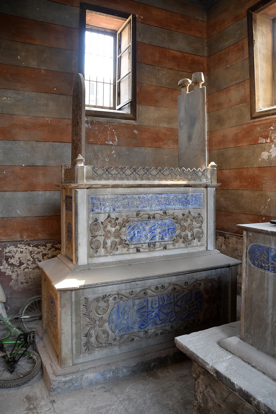A roughly square enclosure measuring ca. 11.5 x 13 m, with the entrance gate in the northern end of the eastern wall and with a two-storey building occupying the southern side of the enclosure. Of the remaining northern part of the enclosure, the western half is a courtyard, surrounded by a tall wall, to which the entrance gate leads. The northern part is a roofed, open-fronted burial area raised by one step, with the roof supported on two wooden pillars. Another identical pillar supports the roof of an open canopy with mashrabiya wooden screens on two sides that is an extension of the burial area into the north-eastern corner of the courtyard.