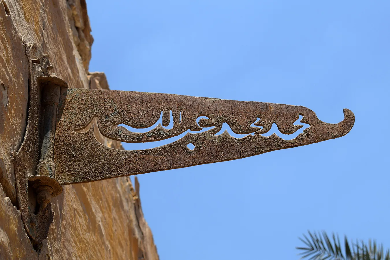A hinged iron bracket over the entrance door (apparently for hanging a lamp) with a pierced name of the founder