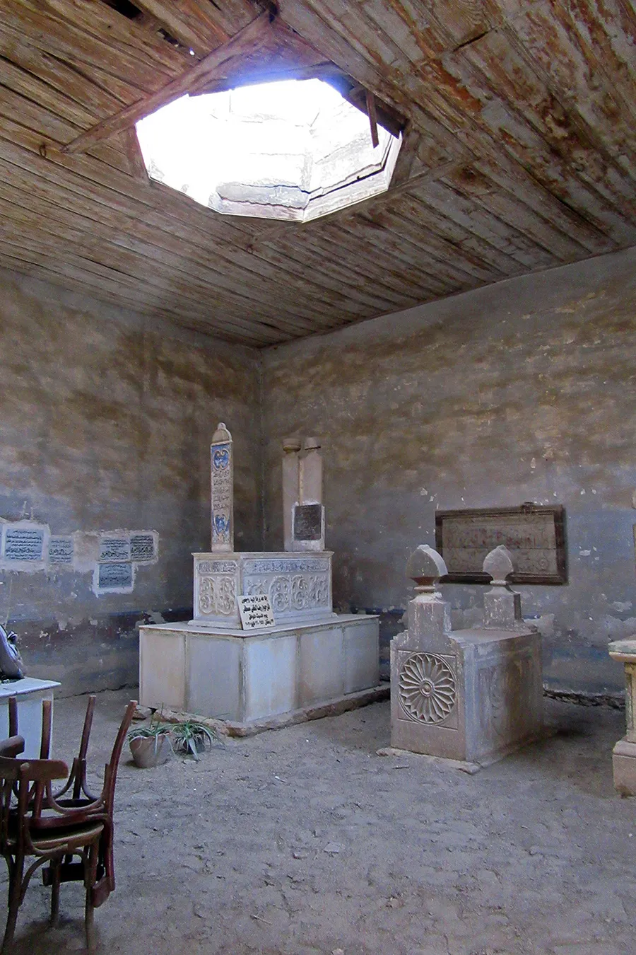 A sizeable funerary enclosure consisting of an irregular conglomeration of single-storey buildings and courtyards stretching for about 45 metres north to south and about 15 metres east to west. It is hemmed in between neighbouring enclosures, with access only from narrow pedestrian streets. There are 13 rooms by the perimeter walls, taking up most of the lot. The earliest part of the complex appears to be the enclosure in its northern part, measuring approximately 22 x 15 m in plan, with rooms grouped in a U-shape around the courtyard by the eastern wall, with a small secondary courtyard by the western wall in the southern tract of the rooms. The main entrance is in the northern façade, which is built of rubble stone and plastered, and is undecorated save the huge cavetto cornice at the top of the wall, which transitions in a smooth curve from the taller eastern section and the lower western section. There are five undecorated rectangular windows in the façade, with simple iron grilles and simple wooden panelled shutters. The gate topped with a semi-circular arch is built of ashlar stone and undecorated. It leads to a hallway in a residential section with two rooms currently occupied by the keepers. The hallway leads to a courtyard (now used for raising poultry), from which a large square burial chamber on the southern side of the courtyard is accessed. It has an octagonal wooden lantern in its plain, undecorated ceiling, and contains two decorated marble cenotaphs and two decorated limestone tomb markers. Another burial room in this zone has a partially broken ceiling and includes a richly decorated marble cenotaph. There is a small courtyard south of the main burial chamber, and west of it, a plain room which according to a panel on the wall is a shrine to Muhammad Abdelghani, the Shaykh of the Sufi group al-Bayyumiya. The Shaykh’s wooden cenotaph covered with cloth stands inside an extremely simple wooden enclosure. Further south, around two tiny courtyards, are six more plain and undecorated burial rooms, which are in very poor condition, some of them inaccessible due to collapsed rooves.