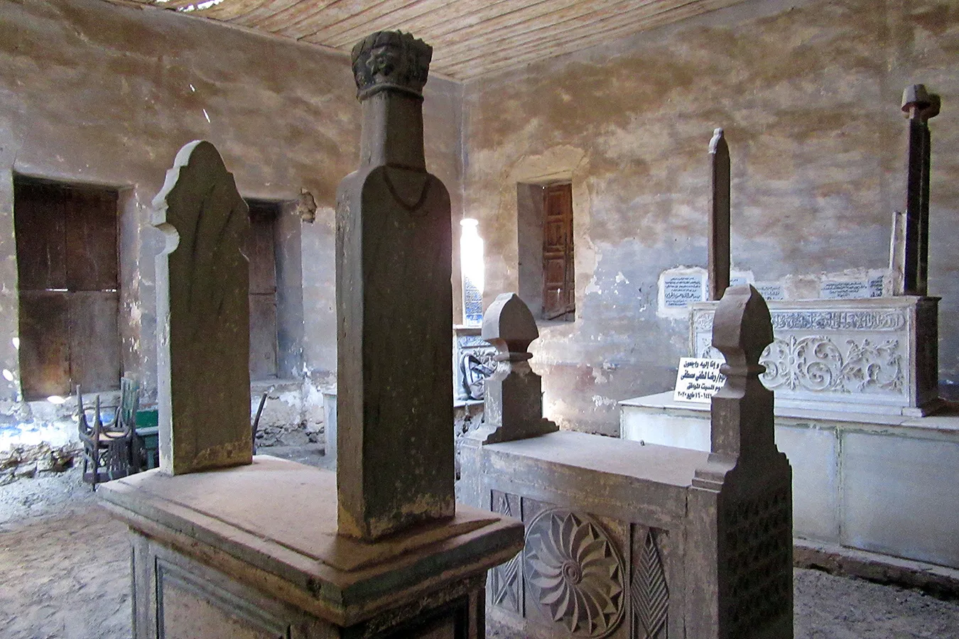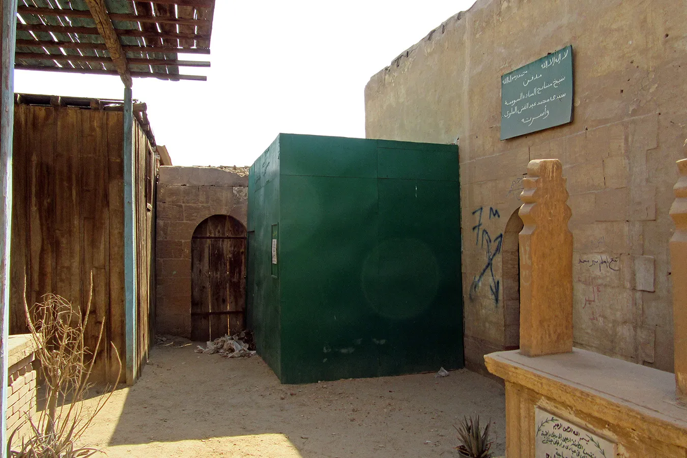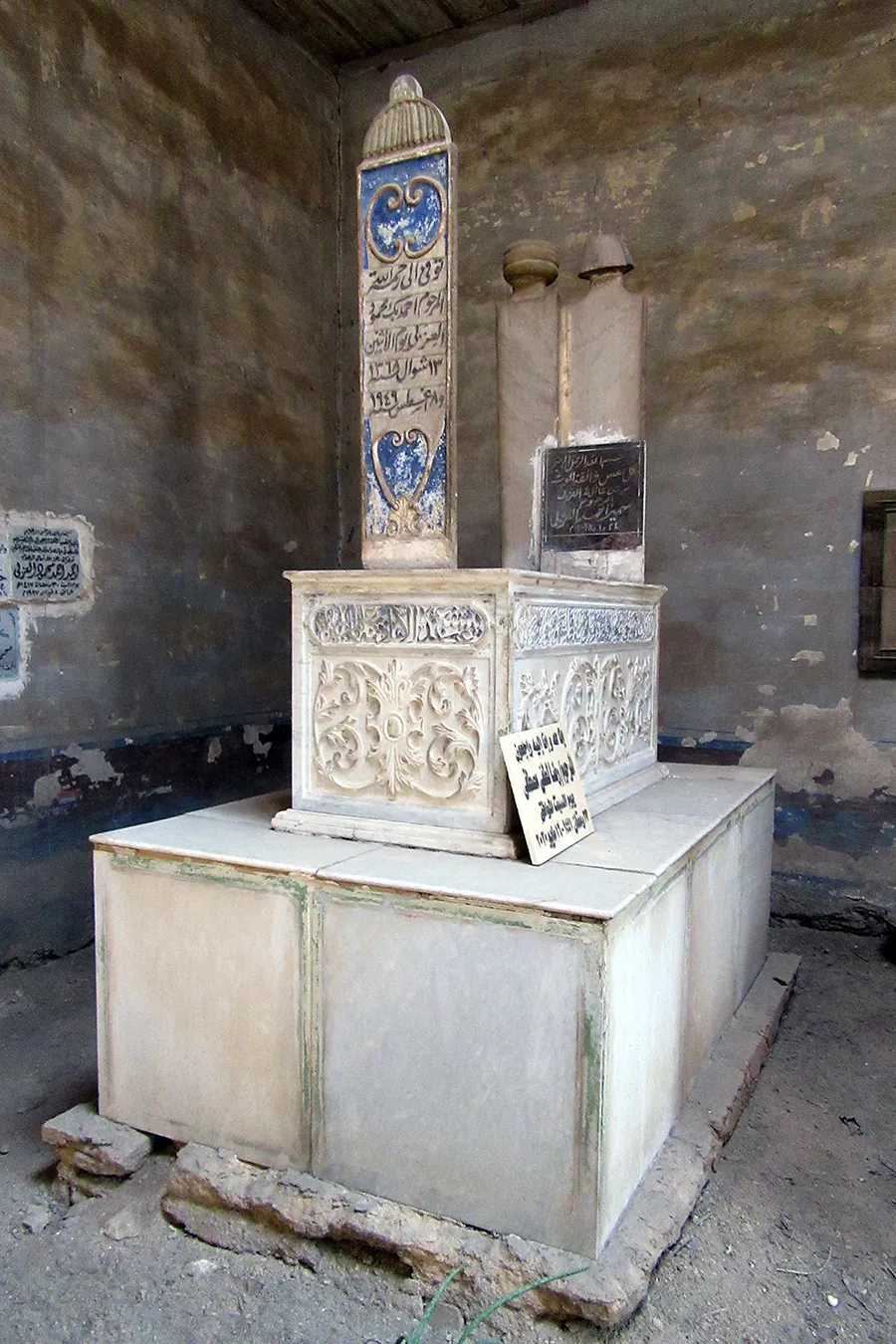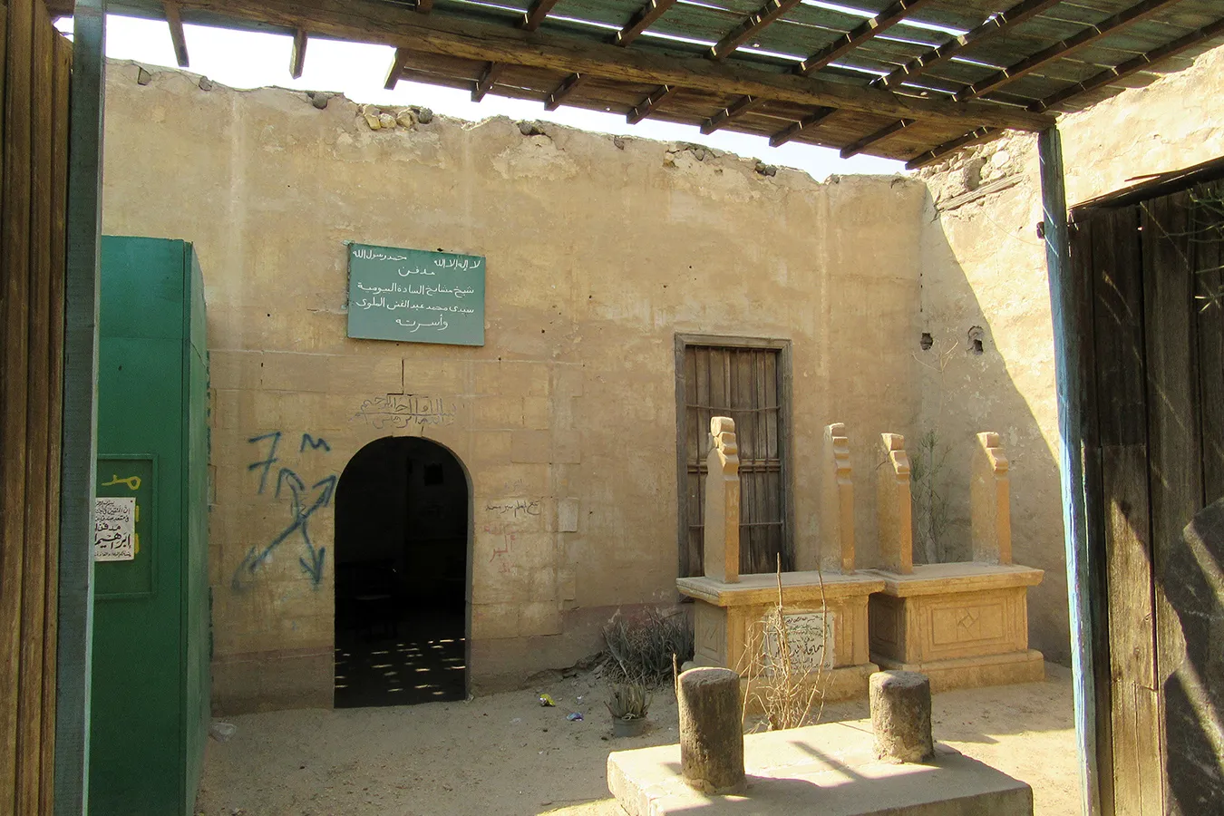 A sizeable funerary enclosure consisting of an irregular conglomeration of single-storey buildings and courtyards stretching for about 45 metres north to south and about 15 metres east to west. It is hemmed in between neighbouring enclosures, with access only from narrow pedestrian streets. There are 13 rooms by the perimeter walls, taking up most of the lot. The earliest part of the complex appears to be the enclosure in its northern part, measuring approximately 22 x 15 m in plan, with rooms grouped in a U-shape around the courtyard by the eastern wall, with a small secondary courtyard by the western wall in the southern tract of the rooms. The main entrance is in the northern façade, which is built of rubble stone and plastered, and is undecorated save the huge cavetto cornice at the top of the wall, which transitions in a smooth curve from the taller eastern section and the lower western section. There are five undecorated rectangular windows in the façade, with simple iron grilles and simple wooden panelled shutters. The gate topped with a semi-circular arch is built of ashlar stone and undecorated. It leads to a hallway in a residential section with two rooms currently occupied by the keepers. The hallway leads to a courtyard (now used for raising poultry), from which a large square burial chamber on the southern side of the courtyard is accessed. It has an octagonal wooden lantern in its plain, undecorated ceiling, and contains two decorated marble cenotaphs and two decorated limestone tomb markers. Another burial room in this zone has a partially broken ceiling and includes a richly decorated marble cenotaph. There is a small courtyard south of the main burial chamber, and west of it, a plain room which according to a panel on the wall is a shrine to Muhammad Abdelghani, the Shaykh of the Sufi group al-Bayyumiya. The Shaykh’s wooden cenotaph covered with cloth stands inside an extremely simple wooden enclosure. Further south, around two tiny courtyards, are six more plain and undecorated burial rooms, which are in very poor condition, some of them inaccessible due to collapsed rooves.