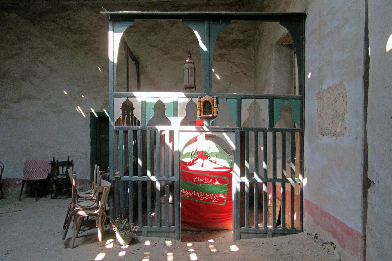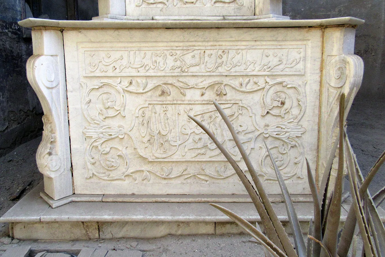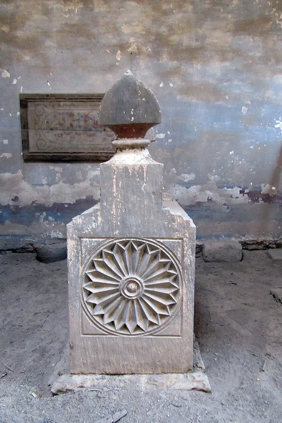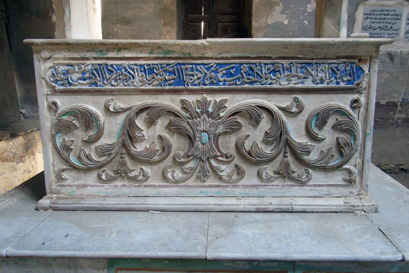A sizeable funerary enclosure consisting of an irregular conglomeration of single-storey buildings and courtyards stretching for about 45 metres north to south and about 15 metres east to west. It is hemmed in between neighbouring enclosures, with access only from narrow pedestrian streets. There are 13 rooms by the perimeter walls, taking up most of the lot. The earliest part of the complex appears to be the enclosure in its northern part, measuring approximately 22 x 15 m in plan, with rooms grouped in a U-shape around the courtyard by the eastern wall, with a small secondary courtyard by the western wall in the southern tract of the rooms. The main entrance is in the northern façade, which is built of rubble stone and plastered, and is undecorated save the huge cavetto cornice at the top of the wall, which transitions in a smooth curve from the taller eastern section and the lower western section. There are five undecorated rectangular windows in the façade, with simple iron grilles and simple wooden panelled shutters. The gate topped with a semi-circular arch is built of ashlar stone and undecorated. It leads to a hallway in a residential section with two rooms currently occupied by the keepers. The hallway leads to a courtyard (now used for raising poultry), from which a large square burial chamber on the southern side of the courtyard is accessed. It has an octagonal wooden lantern in its plain, undecorated ceiling, and contains two decorated marble cenotaphs and two decorated limestone tomb markers. Another burial room in this zone has a partially broken ceiling and includes a richly decorated marble cenotaph. There is a small courtyard south of the main burial chamber, and west of it, a plain room which according to a panel on the wall is a shrine to Muhammad Abdelghani, the Shaykh of the Sufi group al-Bayyumiya. The Shaykh’s wooden cenotaph covered with cloth stands inside an extremely simple wooden enclosure. Further south, around two tiny courtyards, are six more plain and undecorated burial rooms, which are in very poor condition, some of them inaccessible due to collapsed rooves.