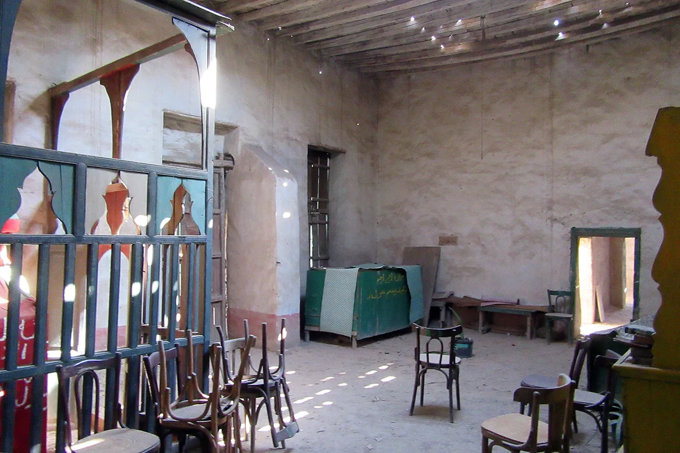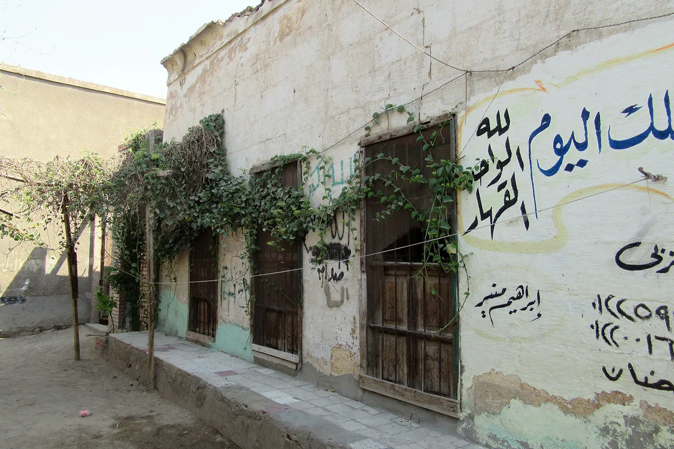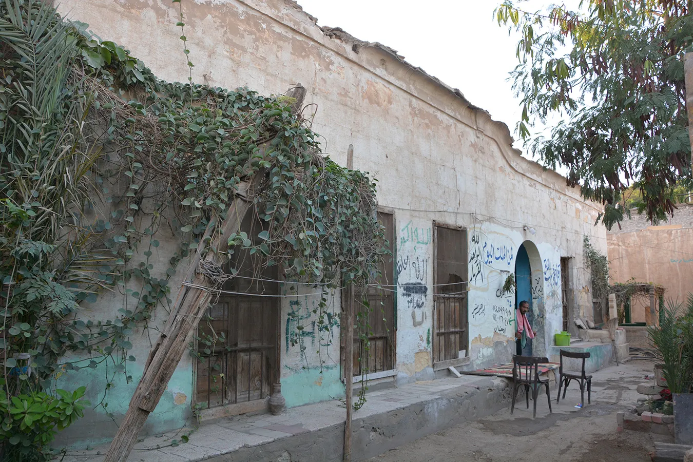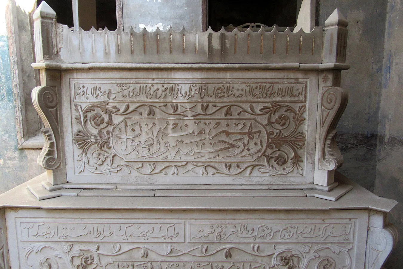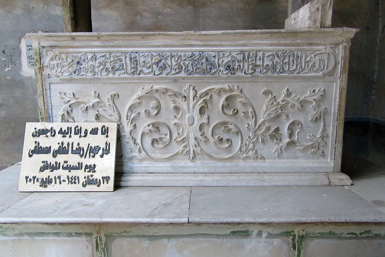 A sizeable funerary enclosure consisting of an irregular conglomeration of single-storey buildings and courtyards stretching for about 45 metres north to south and about 15 metres east to west. It is hemmed in between neighbouring enclosures, with access only from narrow pedestrian streets. There are 13 rooms by the perimeter walls, taking up most of the lot. The earliest part of the complex appears to be the enclosure in its northern part, measuring approximately 22 x 15 m in plan, with rooms grouped in a U-shape around the courtyard by the eastern wall, with a small secondary courtyard by the western wall in the southern tract of the rooms. The main entrance is in the northern façade, which is built of rubble stone and plastered, and is undecorated save the huge cavetto cornice at the top of the wall, which transitions in a smooth curve from the taller eastern section and the lower western section. There are five undecorated rectangular windows in the façade, with simple iron grilles and simple wooden panelled shutters. The gate topped with a semi-circular arch is built of ashlar stone and undecorated. It leads to a hallway in a residential section with two rooms currently occupied by the keepers. The hallway leads to a courtyard (now used for raising poultry), from which a large square burial chamber on the southern side of the courtyard is accessed. It has an octagonal wooden lantern in its plain, undecorated ceiling, and contains two decorated marble cenotaphs and two decorated limestone tomb markers. Another burial room in this zone has a partially broken ceiling and includes a richly decorated marble cenotaph. There is a small courtyard south of the main burial chamber, and west of it, a plain room which according to a panel on the wall is a shrine to Muhammad Abdelghani, the Shaykh of the Sufi group al-Bayyumiya. The Shaykh’s wooden cenotaph covered with cloth stands inside an extremely simple wooden enclosure. Further south, around two tiny courtyards, are six more plain and undecorated burial rooms, which are in very poor condition, some of them inaccessible due to collapsed rooves.