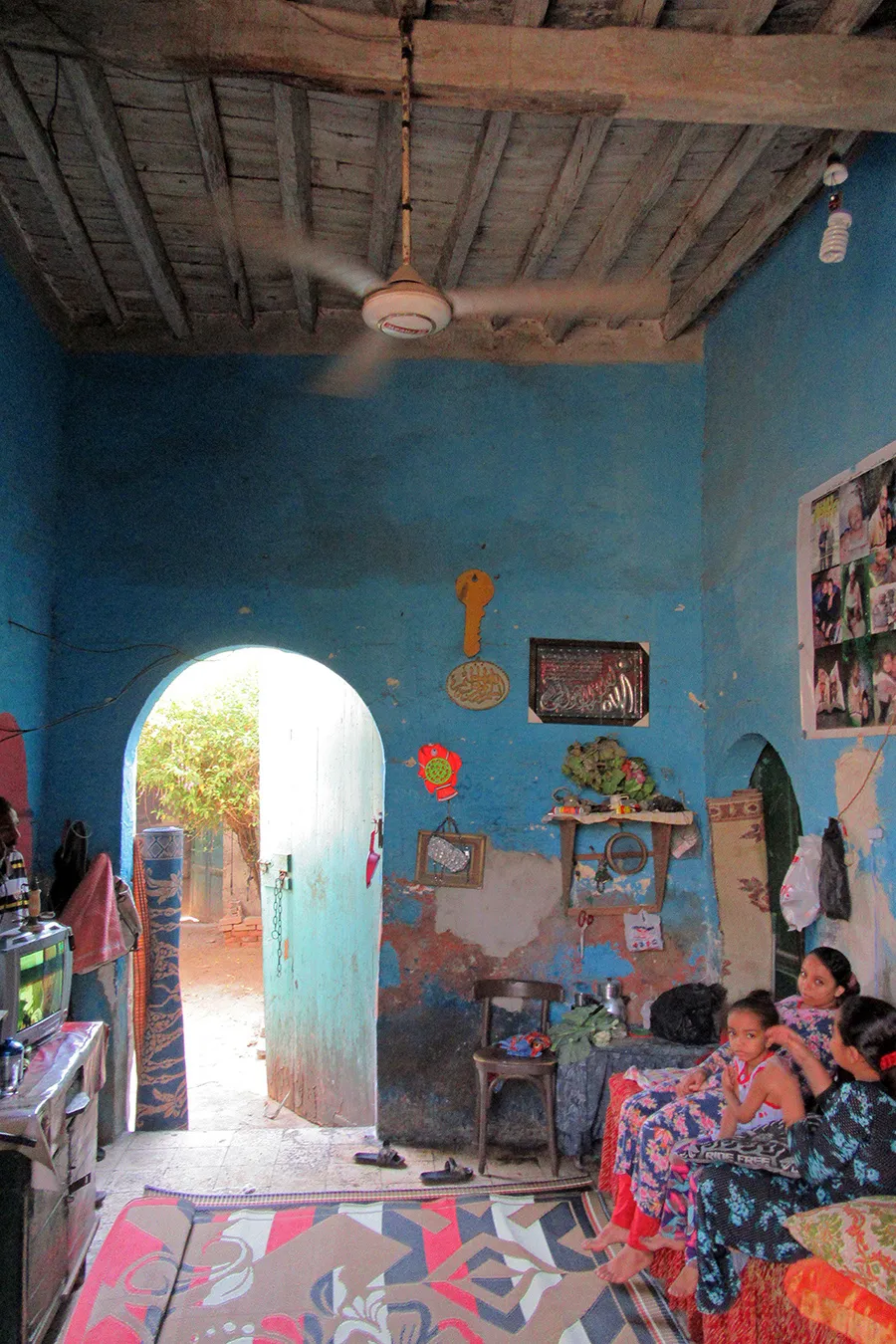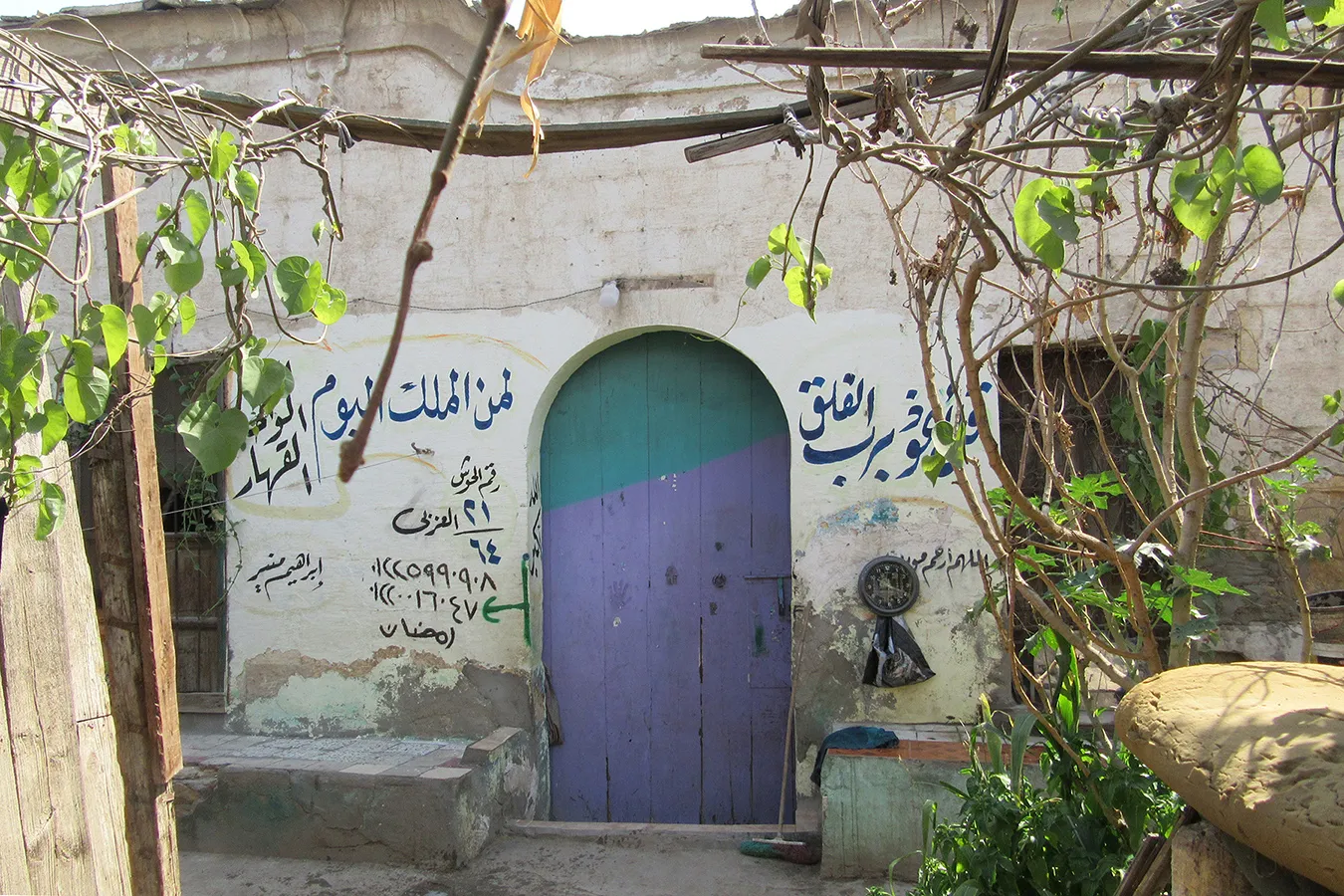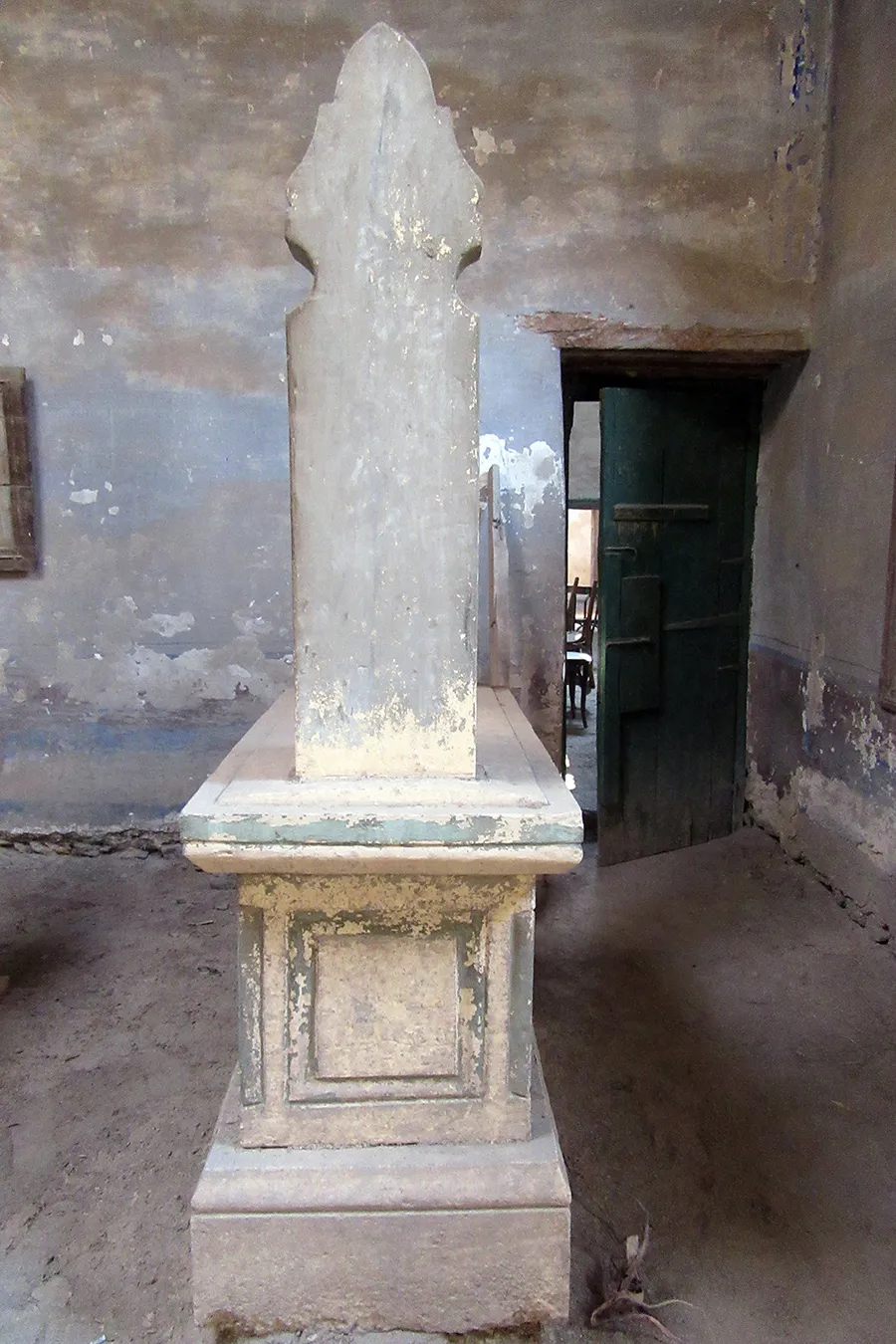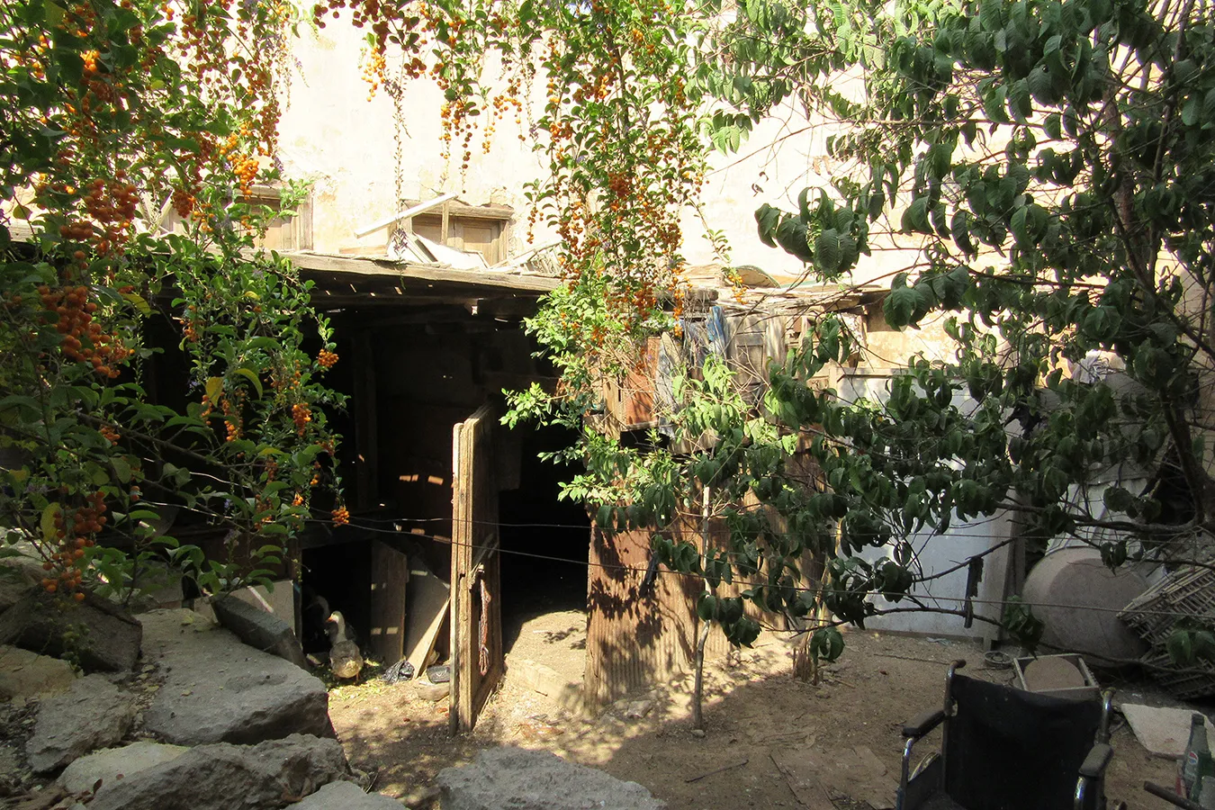 A sizeable funerary enclosure consisting of an irregular conglomeration of single-storey buildings and courtyards stretching for about 45 metres north to south and about 15 metres east to west. It is hemmed in between neighbouring enclosures, with access only from narrow pedestrian streets. There are 13 rooms by the perimeter walls, taking up most of the lot. The earliest part of the complex appears to be the enclosure in its northern part, measuring approximately 22 x 15 m in plan, with rooms grouped in a U-shape around the courtyard by the eastern wall, with a small secondary courtyard by the western wall in the southern tract of the rooms. The main entrance is in the northern façade, which is built of rubble stone and plastered, and is undecorated save the huge cavetto cornice at the top of the wall, which transitions in a smooth curve from the taller eastern section and the lower western section. There are five undecorated rectangular windows in the façade, with simple iron grilles and simple wooden panelled shutters. The gate topped with a semi-circular arch is built of ashlar stone and undecorated. It leads to a hallway in a residential section with two rooms currently occupied by the keepers. The hallway leads to a courtyard (now used for raising poultry), from which a large square burial chamber on the southern side of the courtyard is accessed. It has an octagonal wooden lantern in its plain, undecorated ceiling, and contains two decorated marble cenotaphs and two decorated limestone tomb markers. Another burial room in this zone has a partially broken ceiling and includes a richly decorated marble cenotaph. There is a small courtyard south of the main burial chamber, and west of it, a plain room which according to a panel on the wall is a shrine to Muhammad Abdelghani, the Shaykh of the Sufi group al-Bayyumiya. The Shaykh’s wooden cenotaph covered with cloth stands inside an extremely simple wooden enclosure. Further south, around two tiny courtyards, are six more plain and undecorated burial rooms, which are in very poor condition, some of them inaccessible due to collapsed rooves.