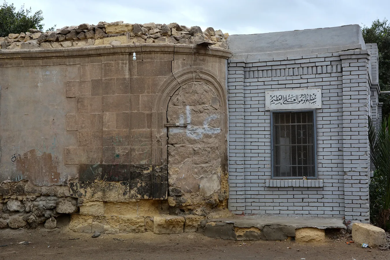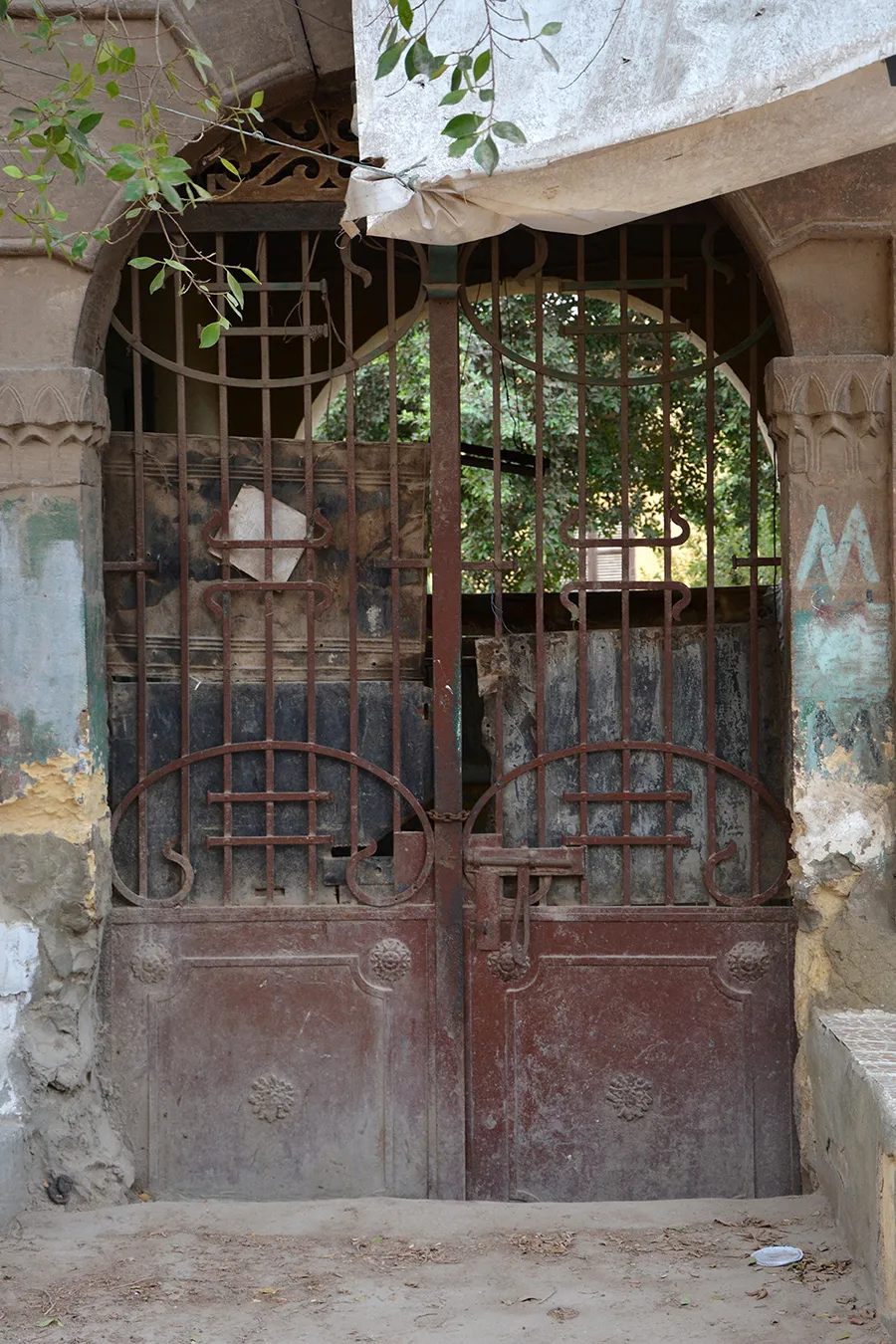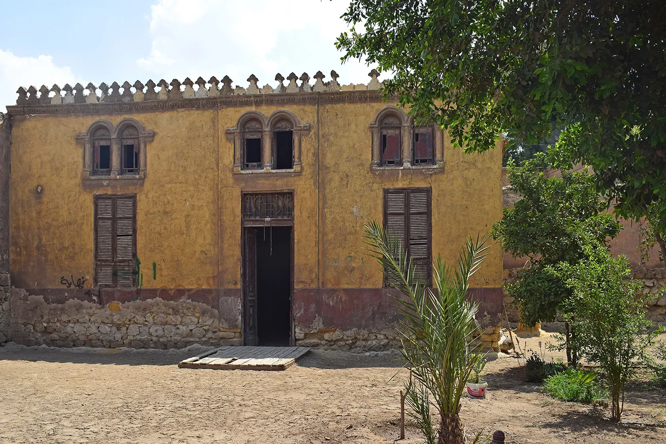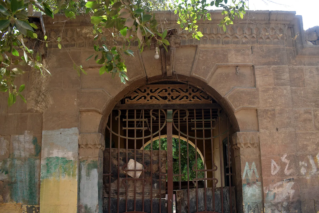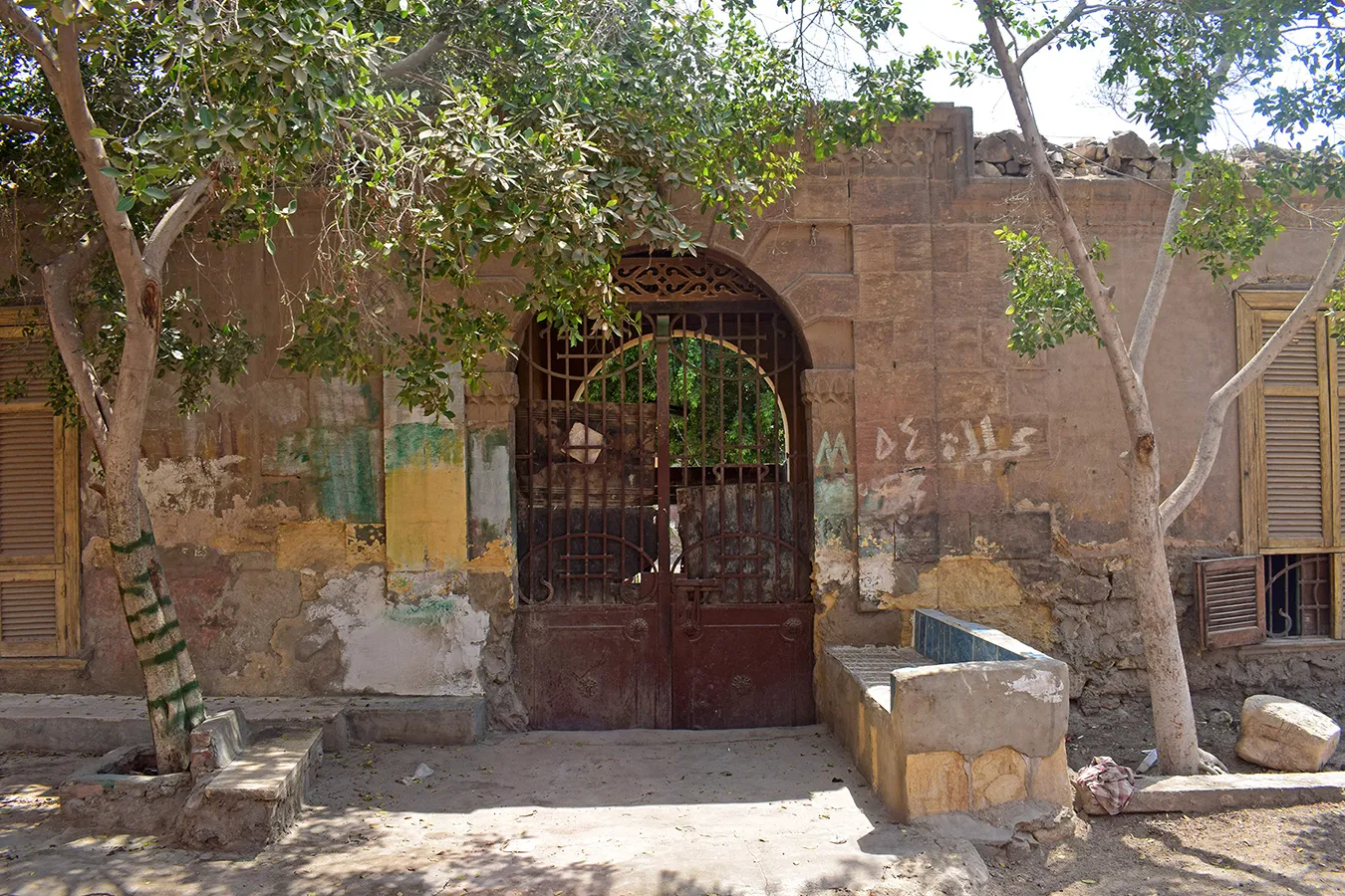 A sizeable irregular quadrangular enclosure measuring approximately 24×30 metres, with streets to the northern, western and southern sides and a narrow alley along the eastern wall leading to an adjoining enclosure. The corners, entrances, and the cornice of the enclosure are built of dressed stone, and the rest of the walls are of rough stone and plastered. There is a residential wing along the northern wall and the northern part of the western wall, and a burial chamber in the south-eastern corner of the courtyard. The entrance in the middle of the northern façade leads to a gateway opening on the courtyard with an arched opening. On its both sides are residential units. The Northern portal is a simple rusticate Classical-style gate topped with rounded arch and flanked by pilasters. However, the capitals of the pillars under the arch and the frieze above are of muqarnases. The door leaves are of simple wrought iron grilles of Art Nouveau motifs. A simple rectangular door placed in flat undecorated projection of the wall leads to the courtyard from the alley by the eastern wall. Another gate to the courtyard is placed in the middle of the western façade. It is also placed in a shallow projection in the wall, and is covered with a flat arch of joggled stone voussoirs. There are trees, including palm trees, planted in the courtyard, but not any formal garden layout. The north-western corner of the enclosure is rounded, and pierced with a large sabil window (now crudely walled up) topped with a semi-circular arch, with the opening surrounded with an angular knotted moulding.
