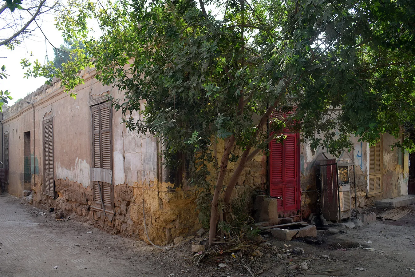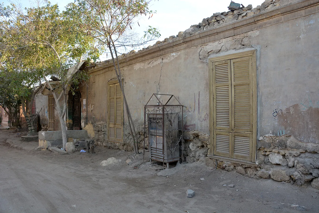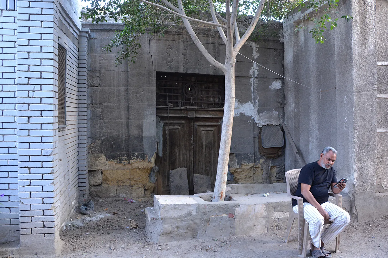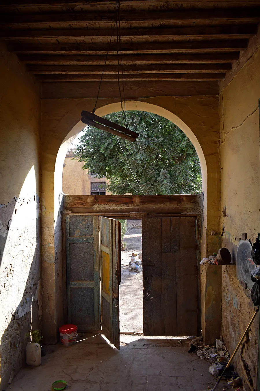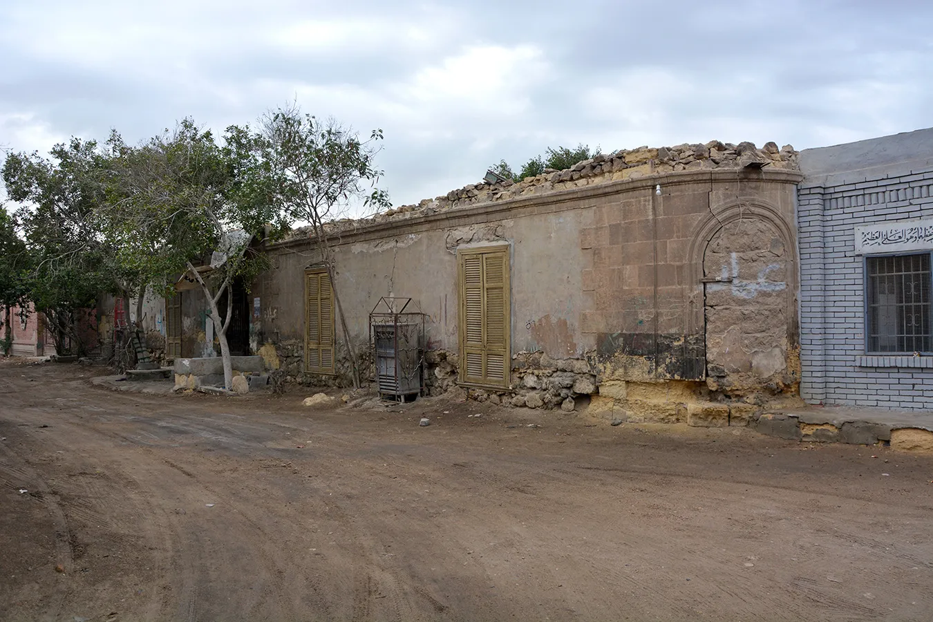 A sizeable irregular quadrangular enclosure measuring approximately 24×30 metres, with streets to the northern, western and southern sides and a narrow alley along the eastern wall leading to an adjoining enclosure. The corners, entrances, and the cornice of the enclosure are built of dressed stone, and the rest of the walls are of rough stone and plastered. There is a residential wing along the northern wall and the northern part of the western wall, and a burial chamber in the south-eastern corner of the courtyard. The entrance in the middle of the northern façade leads to a gateway opening on the courtyard with an arched opening. On its both sides are residential units. The Northern portal is a simple rusticate Classical-style gate topped with rounded arch and flanked by pilasters. However, the capitals of the pillars under the arch and the frieze above are of muqarnases. The door leaves are of simple wrought iron grilles of Art Nouveau motifs. A simple rectangular door placed in flat undecorated projection of the wall leads to the courtyard from the alley by the eastern wall. Another gate to the courtyard is placed in the middle of the western façade. It is also placed in a shallow projection in the wall, and is covered with a flat arch of joggled stone voussoirs. There are trees, including palm trees, planted in the courtyard, but not any formal garden layout. The north-western corner of the enclosure is rounded, and pierced with a large sabil window (now crudely walled up) topped with a semi-circular arch, with the opening surrounded with an angular knotted moulding.