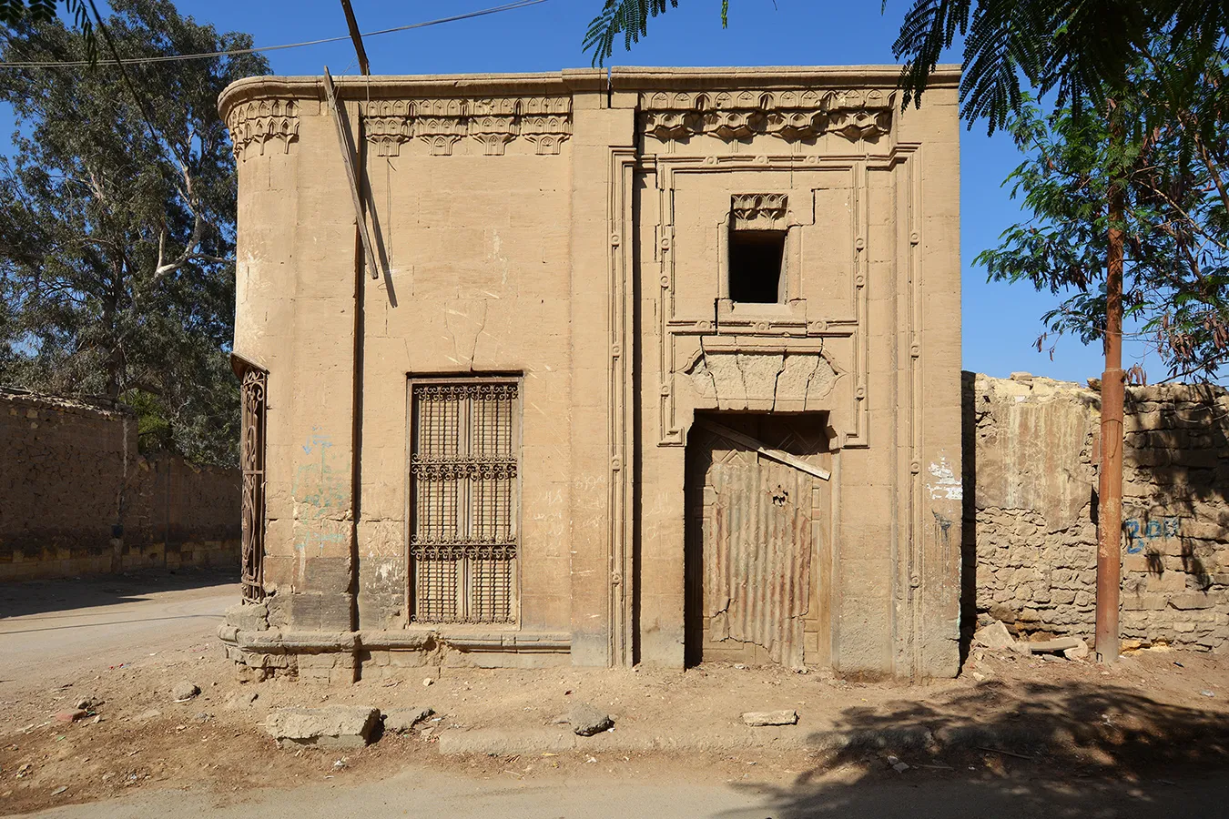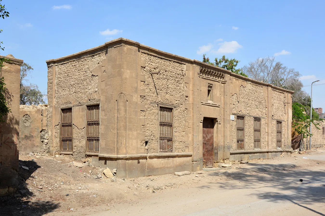 A small rectangular enclosure measuring approximately 6×18 metres. The eastern and southern facades face streets, the western façade is on a small blind alley, and a neighbouring enclosure adjoins to the north. The complex consists of a set of rooms on the western side accessible from a gate in the southern façade, a room on the northern side that contains a sabil in the rounded south-eastern corner and is accessible from a gate in the eastern façade, and a small square courtyard between them. There are remnants of a wooden roof with a skylight over the courtyard that serves as a burial ground and contains a carved marble cenotaph. The eastern façade is built entirely of ashlar stone. In the southern and western façades the base courses, the cornice, the flat pilasters, and the south-western corner are built of ashlar stone, while the rest of the walls are built of rough stone and plastered. In the eastern façade, the entrance portal placed to the right (north) is placed in a shallow recess topped with an elaborate muqarnas frieze and framed in knotted mouldings. The rectangular door is covered with a lintel formed by a flat arch of step-joggled voussoirs with a placement for an inscription panel (now empty) framed in moulding. Over the door is a small rectangular window flanked with colonnettes, with a muqarnas frieze carved in its lintel. The window and the lintel of the door are framed in knotted mouldings. Left of the portal is a shallow recess topped with an elaborate muqarnas frieze, with a single large rectangular window. The southern façade is divided into four sections of unequal width. The eastern and western sections each contain a single rectangular window. The second section from west is built entirely of ashlar stone and is a portal similar to this in the eastern façade, only without a placement of an inscription panel over the door. The portal leads to an entrance hall from which the western room and the burial chamber are accessed. The middle section right of the portal contains two windows corresponding to the burial chamber (now a roofless courtyard.) The western façade has two identical windows. All windows are plain, and witted with simple decorative wrought iron grilles and simple wooden louvre shutters. The doors (now blocked with metal sheets) originally had simple decorative panelling with mafruka motifs. In the rounded south-eastern corner is a sabil window with a ledge supported on a muqarnas corbel. The sabil window covered with an arch with no surrounding framing is set in a corner recess between two pilasters that is topped by a muqarnas frieze. The wrought iron grille in the window displays distinctly Art Nouveau curvilinear motifs.