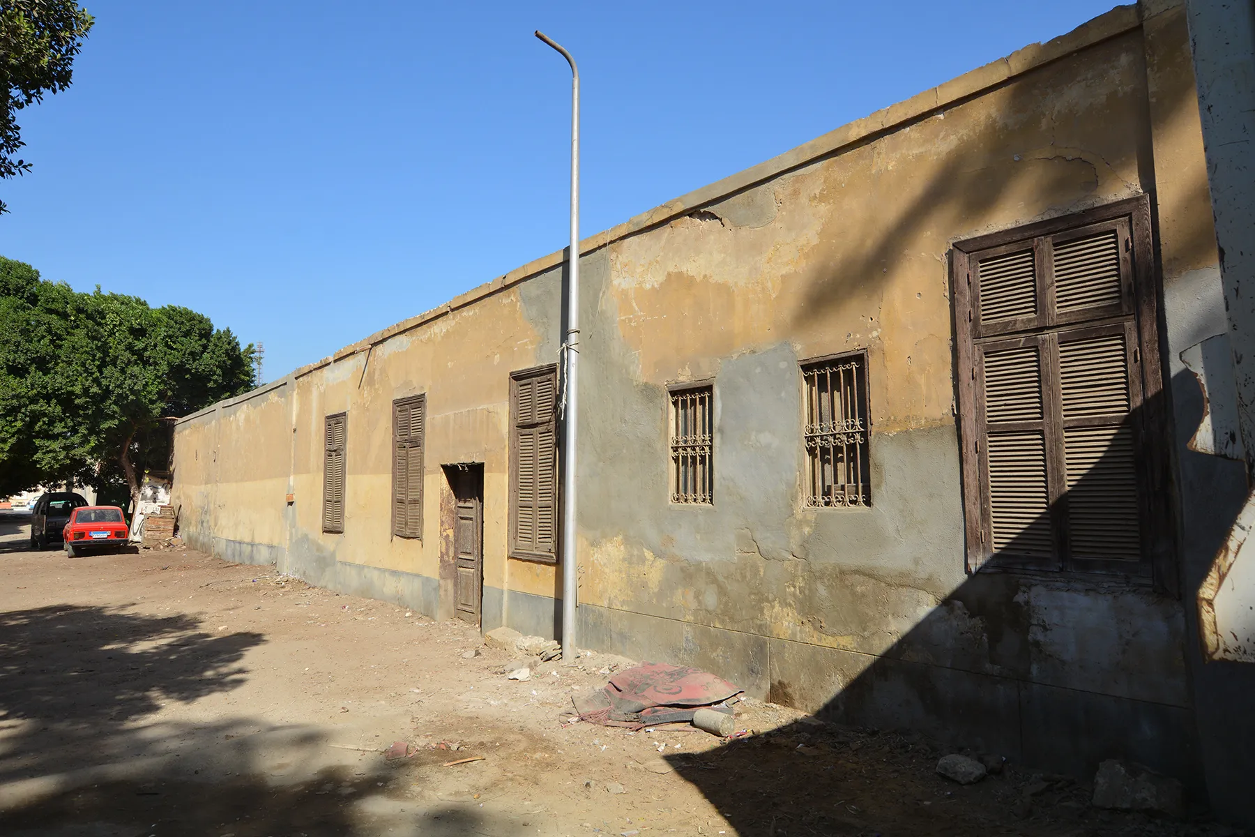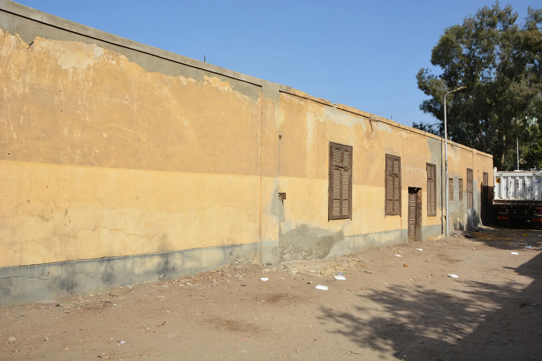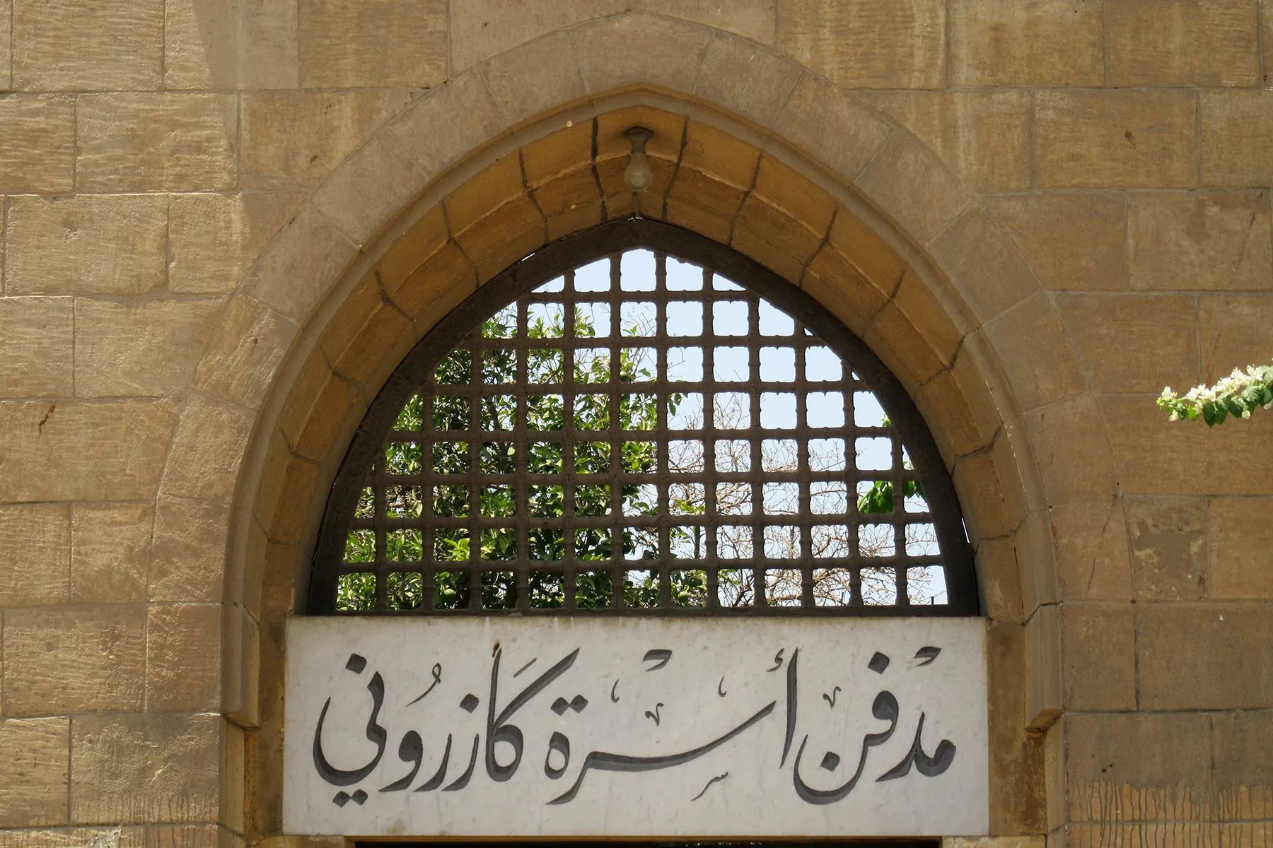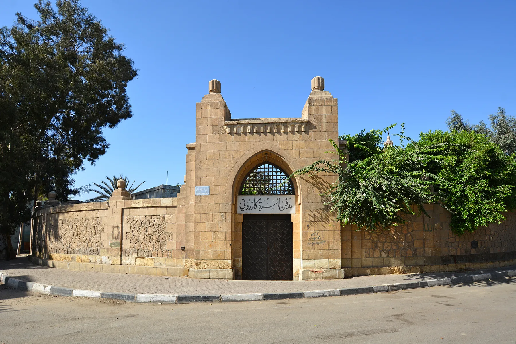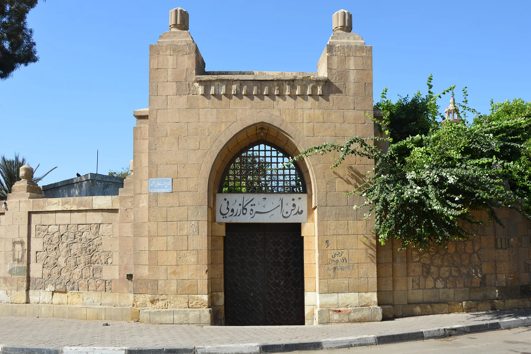 An irregular lot tapering towards west, with the perimeter wall forming a large quarter-circle in the north-eastern corner, with the entrance gate in the middle of the circle. By the southern wall stands an elongated, very simple building with no decoration, constructed of dressed stone in courses of uneven height and plastered. Its plain windows have simple decorative wrought-iron grilles. In the south-western corner of the lot is an enclosure with open arcade of pointed [? – interior inaccessible] arches to the northern side and a similar arch in the eastern wall where it protrudes in front of the abutting building. The eastern half of the enclosure is roofed, the western part is open to the sky and contains a single huge cenotaph. The perimeter wall (i.e., the northern wall with the circular north-eastern section, and the part of the western wall north of the enclosure in south-western corner) appears to be a remodelling that resulted from a change in street layout. This wall is built in sections separated by pillars of dressed stone topped with “pomegranate” bulbs. The base courses and the upper courses of the wall are also in well-dressed stone, while the sections between the pillars are panels of uncoursed masonry of huge irregularly polygonal rough stones with raised joints in cement mortar. The entrance gate is in neo-Mamluk forms extremely simplified into geometric “cubist” forms. It has an undecorated pointed arch filled with a ma’muni mashrabiya grille (i.e., composed of huge, thick simple turned-wood pieces in a square pattern) over the door lintel which is a huge monolithic block of marble and bears the Kazaruni family name in Persian-style calligraphy. The entrance door is decorated with a simple geometric mafruka-based pattern of lath nailed to a plywood board. There is a simple rectangular undecorated door in the western façade.