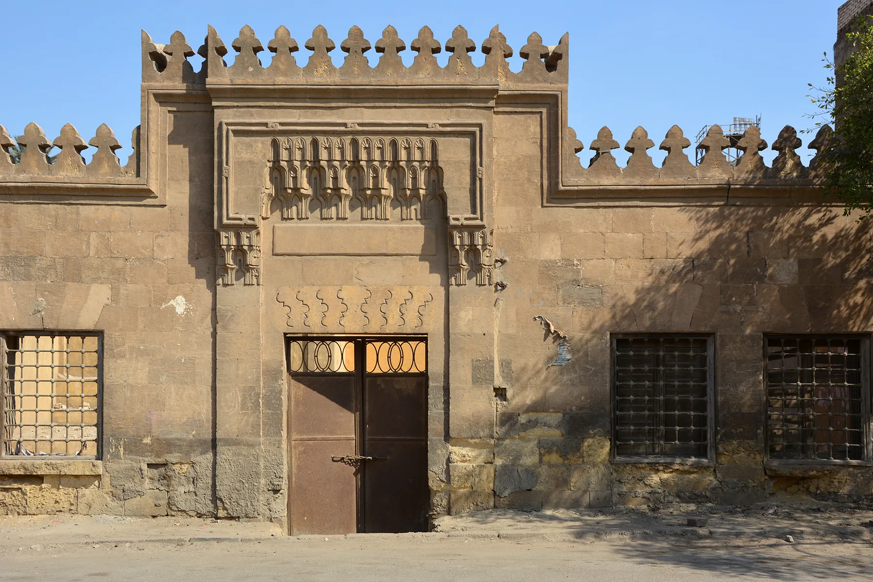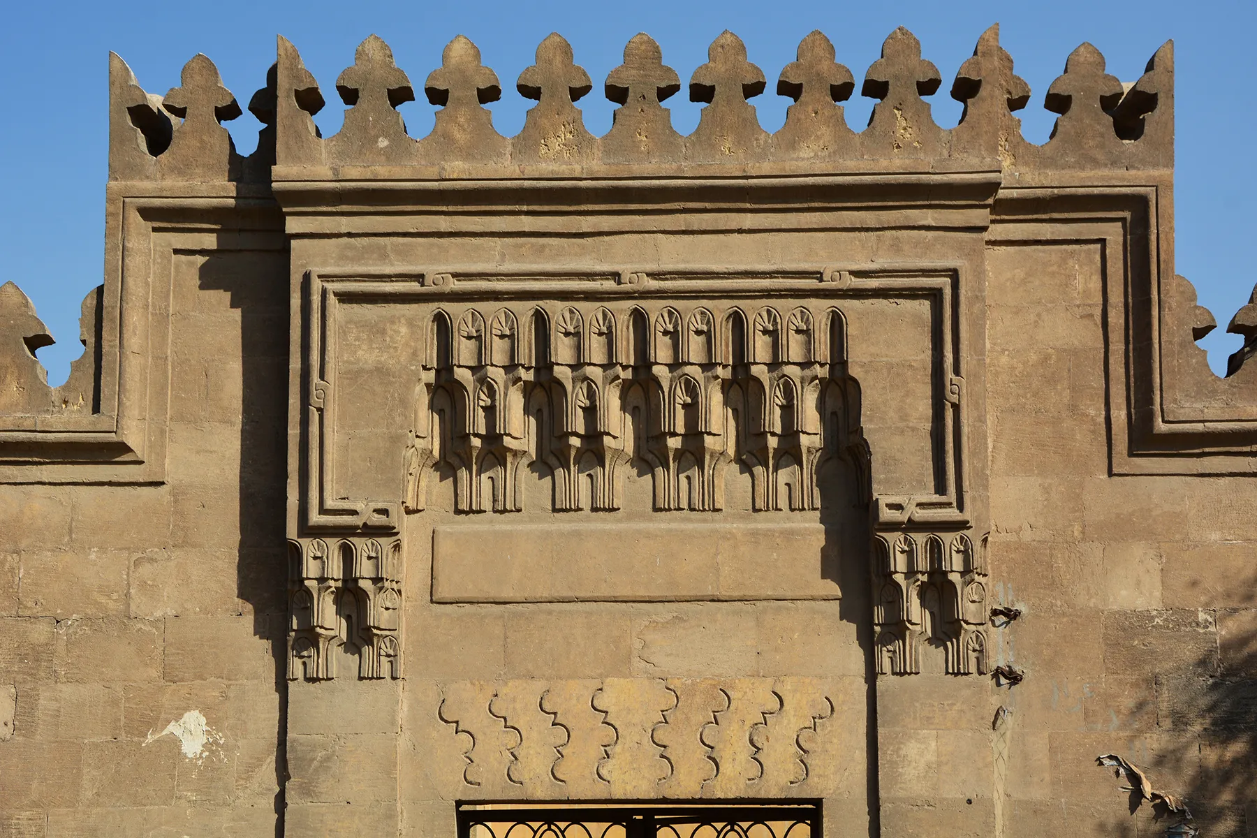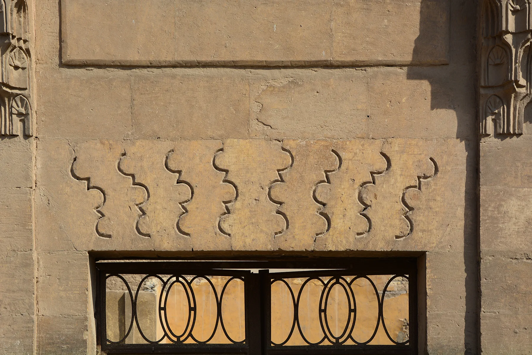 On each side of the gate are four undecorated rectangular windows grouped in pairs. Their lintels are flat arches with simple angular joggling. In the windows are simple iron grilles with spheres at the crossings of their rods, resembling Mamluk-period grilles. The façade is crowned with fleur-de-lys crenellations.