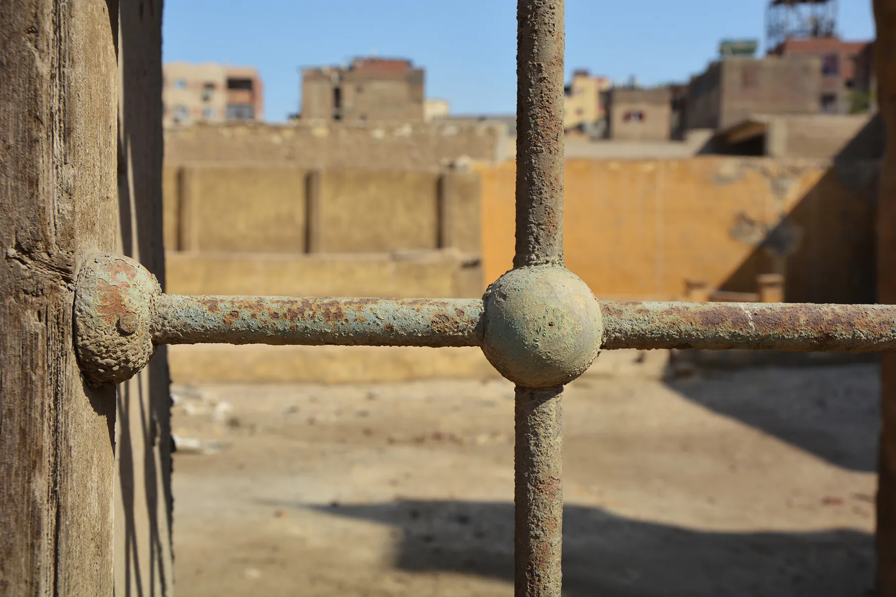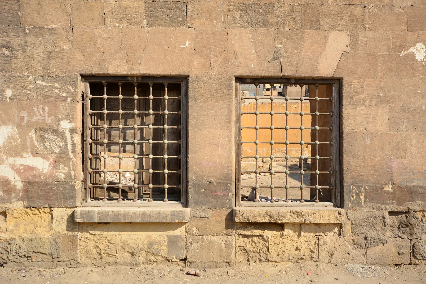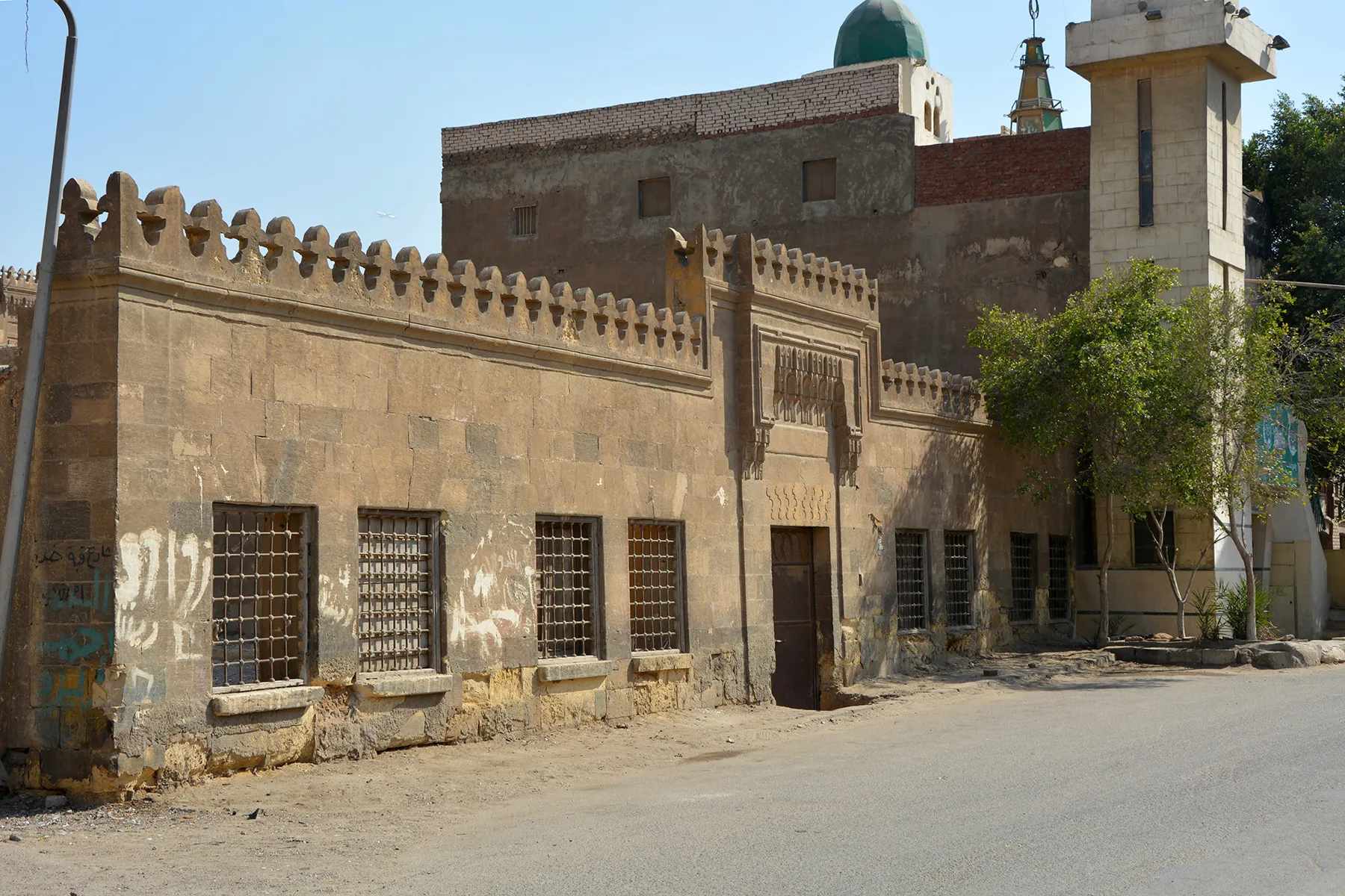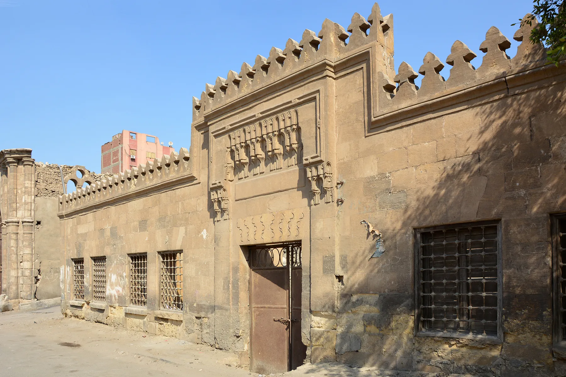 On each side of the gate are four undecorated rectangular windows grouped in pairs. Their lintels are flat arches with simple angular joggling. In the windows are simple iron grilles with spheres at the crossings of their rods, resembling Mamluk-period grilles. The façade is crowned with fleur-de-lys crenellations.
