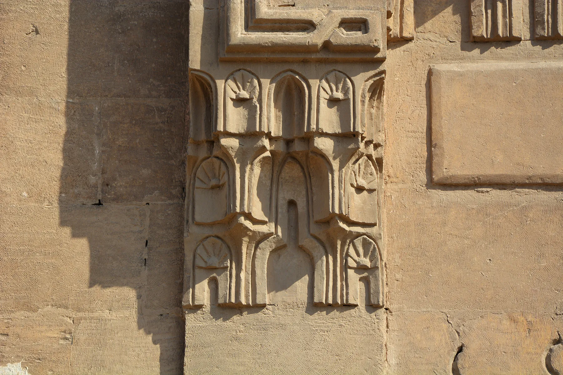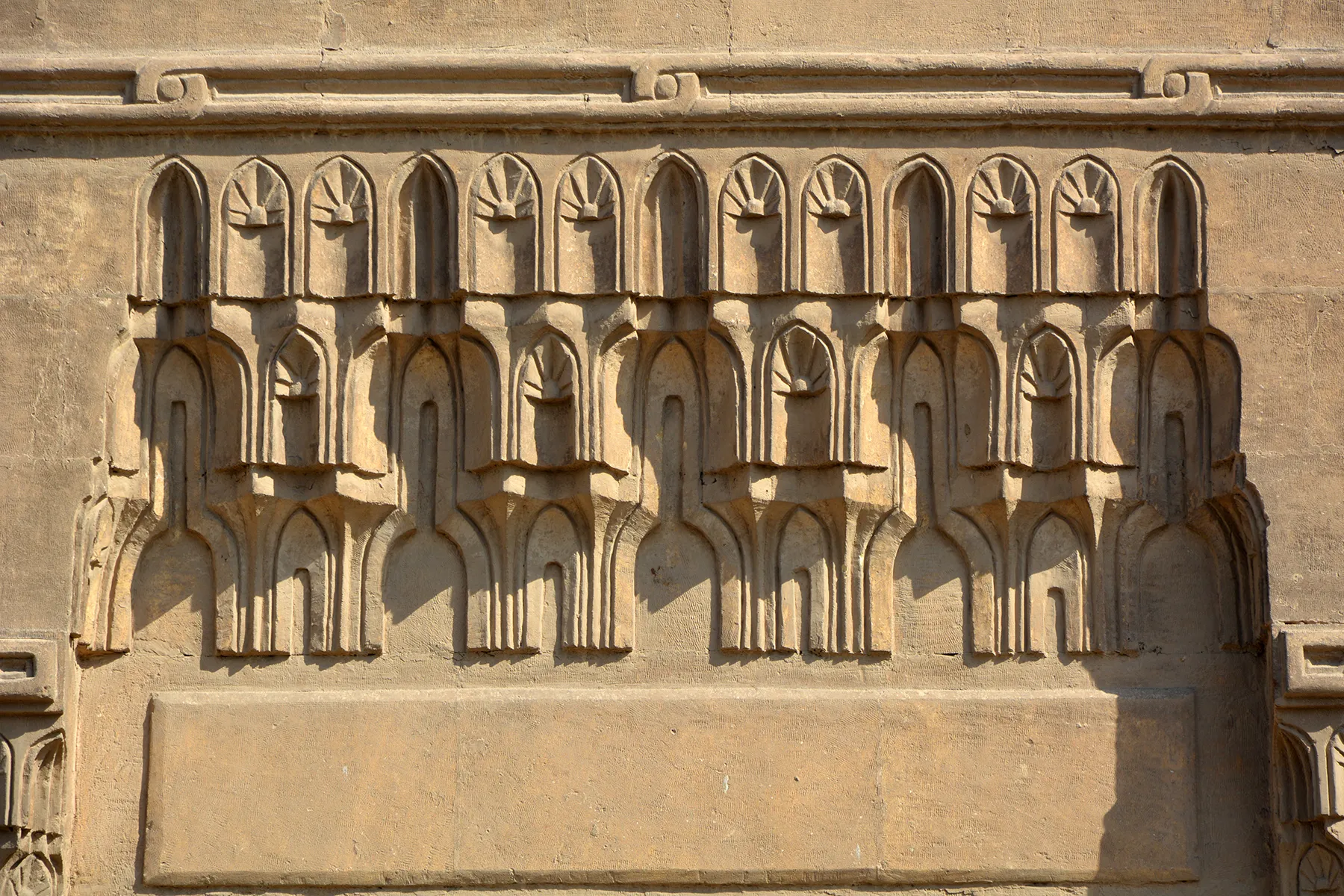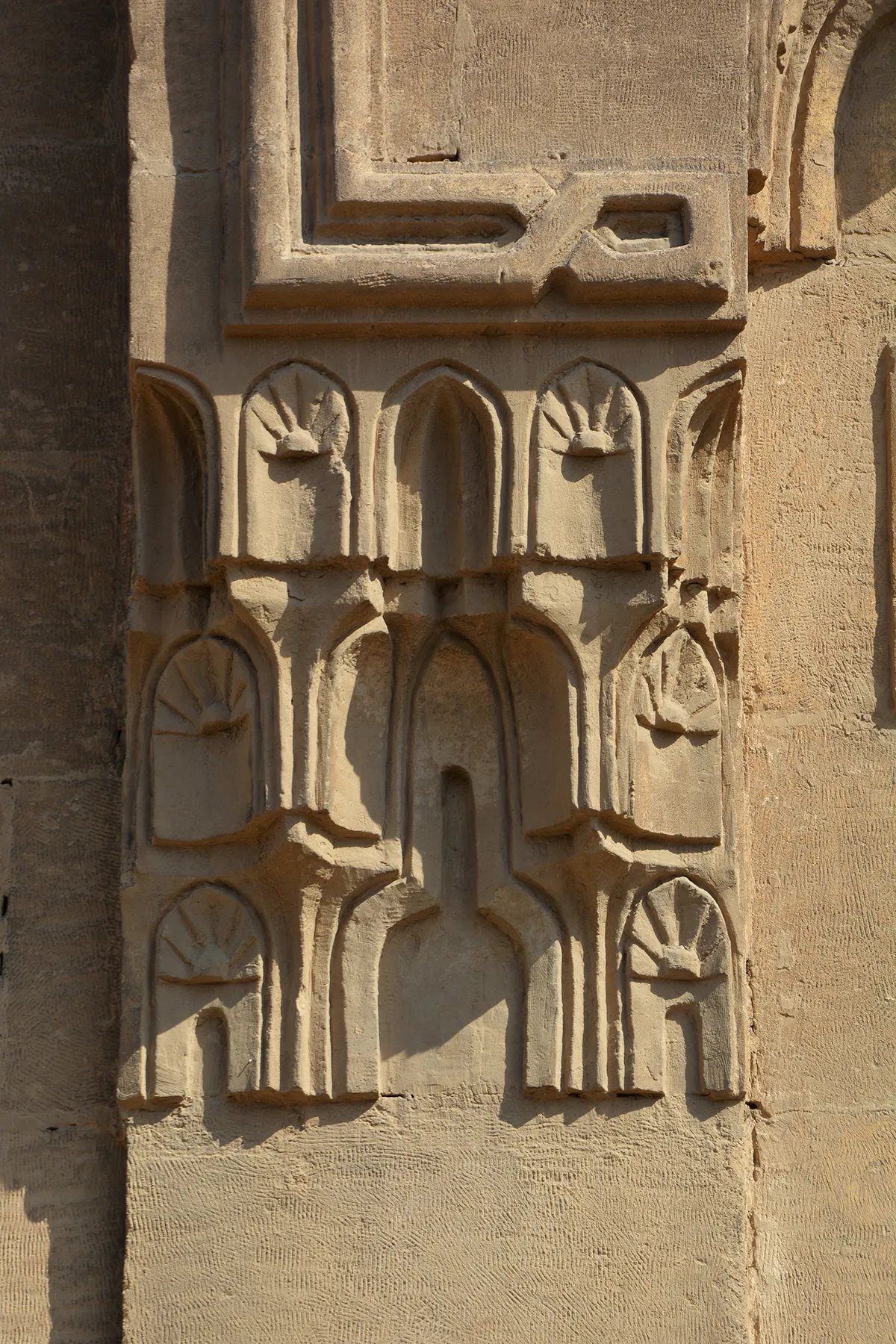 In the symmetrical front façade built of ashlar stone, the central section containing the entrance portal is a pishtaq taller than the rest of the wall. Within it, the entrance gate is flanked by flat pilasters, with muqarnas brackets that carry a protruding frame with knotted mouldings around the three-tiered muqarnas over the main gate. Below the muqarnas is a raised plain rectangular panel without any inscription. The lintel of the rectangular door is a flat arch of elaborate joggled voussoirs.