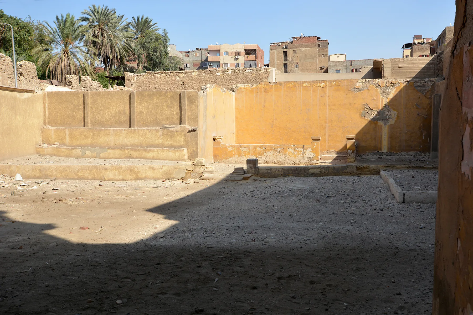 A rectangular walled enclosure measuring about 23 x 29 m, with the main (shorter) façade facing west and a secondary façade facing north, and abutting on adjacent structures to the S and E. There is a roofless square room in the NE corner of the enclosure. Sections of walls adjacent to the front and side walls suggest that there was a building along the western (front) wall that has either collapsed or was planned but never finished. The western section of the N wall has apparently been rebuilt after collapse.