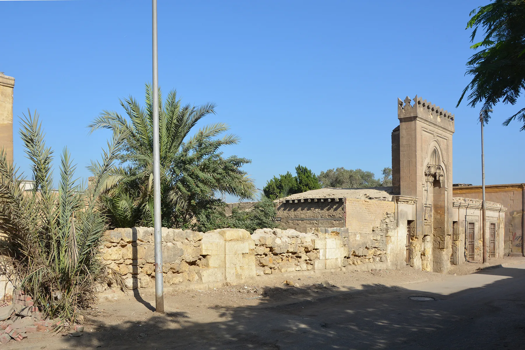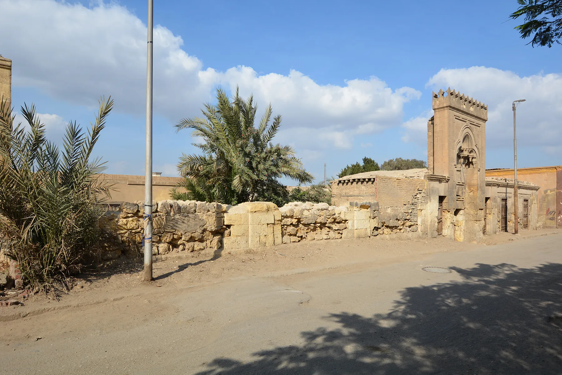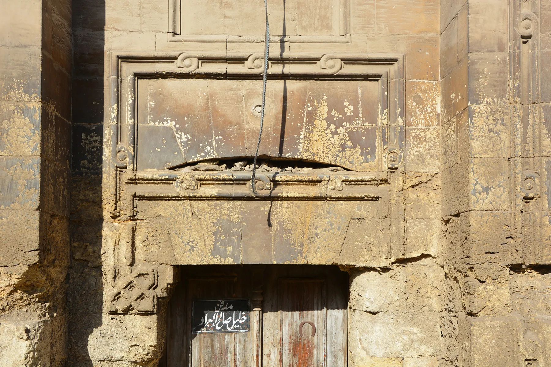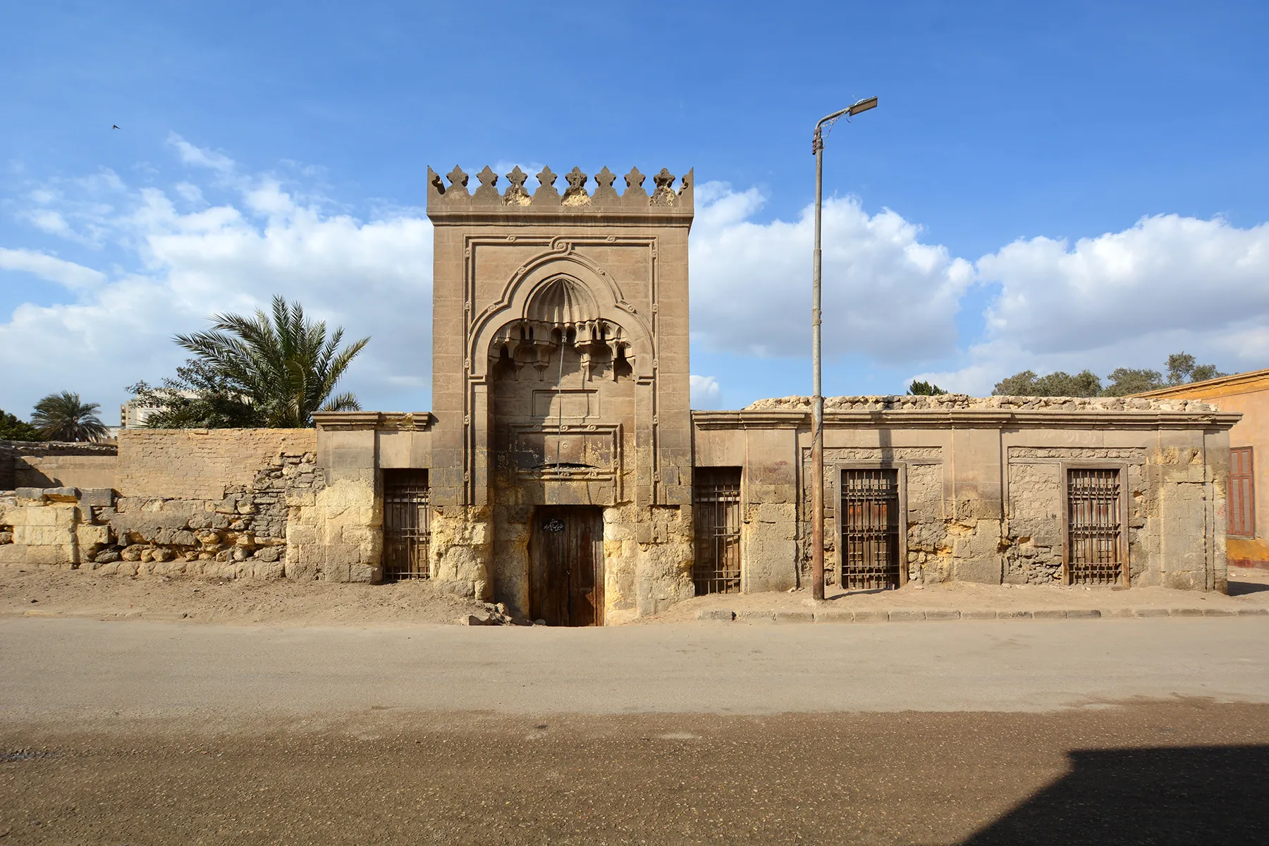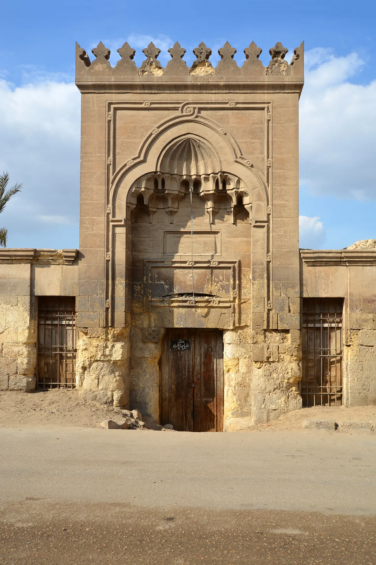 In the front façade, the main portal is asymmetrically placed closer to the northern end, and forms a pishtaq twice the height of the rest of the walls, topped with huge fleur-de-lys crenellations. The entrance is placed in a recess topped with a trefoil hood with a fluted semi-dome in the upper part resting on a very elaborate muqarnas frieze with “stalactite” muqarnases. The recess is framed in knotted mouldings. The composition follows very closely the forms of Mamluk-period architecture in Cairo. The rectangular entrance door has its lintel, which is a flat arch of limestone blocks, and a segmental relieving arch above it framed in knotted mouldings. Over the door is a rectangular recess in moulded frame, evidently intended for an inscription panel, but now empty. There are two narrow undecorated windows with flat-arch lintels flanking the portal, and two large, plain rectangular windows in the right (northern) section of the façade. The wider left section of the façade (now ruined) that formed the wall of the south-eastern courtyard apparently was blank, with no windows. There is a simple secondary gate in the northern façade with a rectangular undecorated door covered with a flat arch of limestone blocks. It leads to the building in the north-eastern corner of the enclosure. There are three windows to the left (east) of the gate and two windows to the right, identical with those in the front façade and irregularly placed.