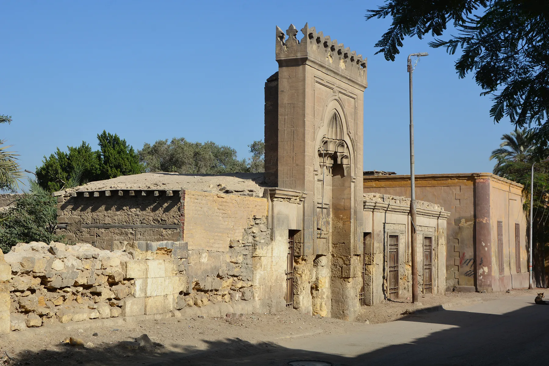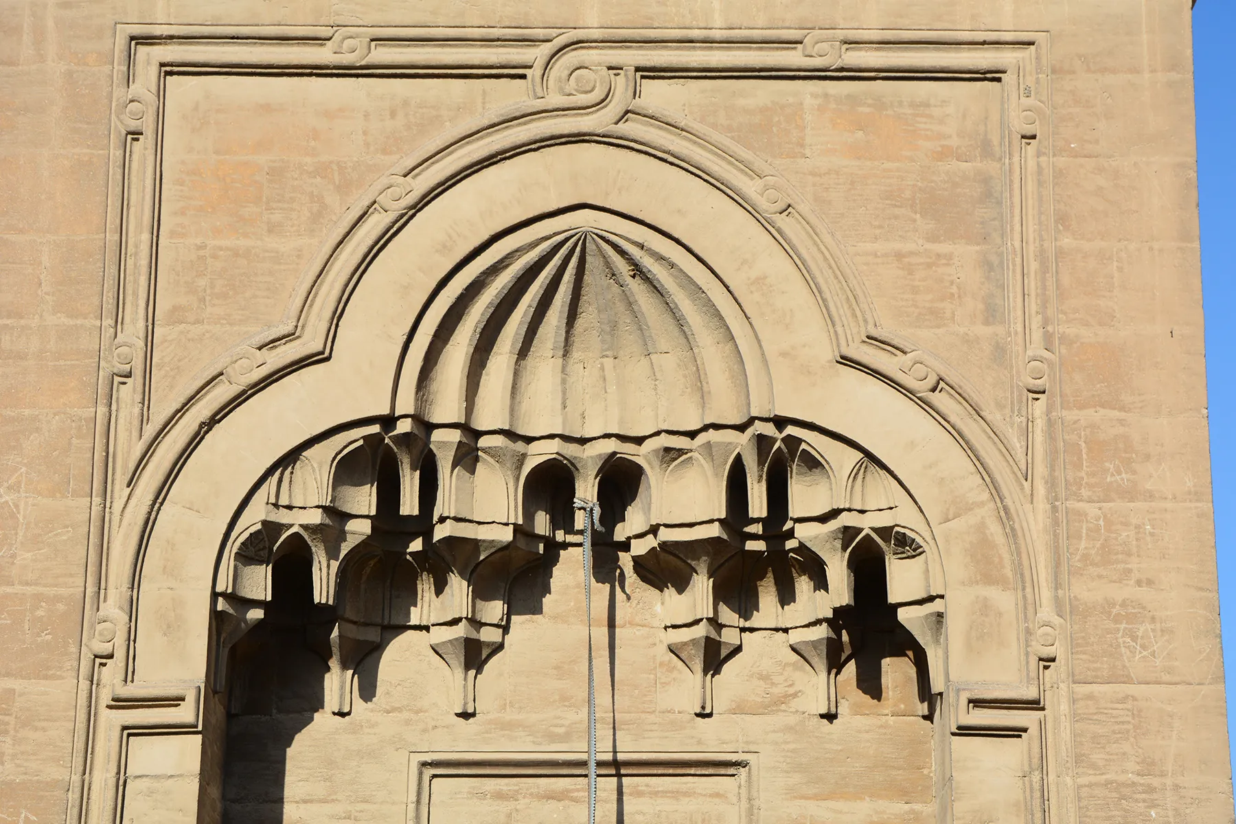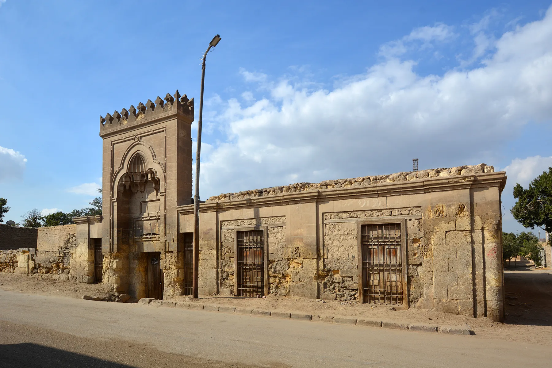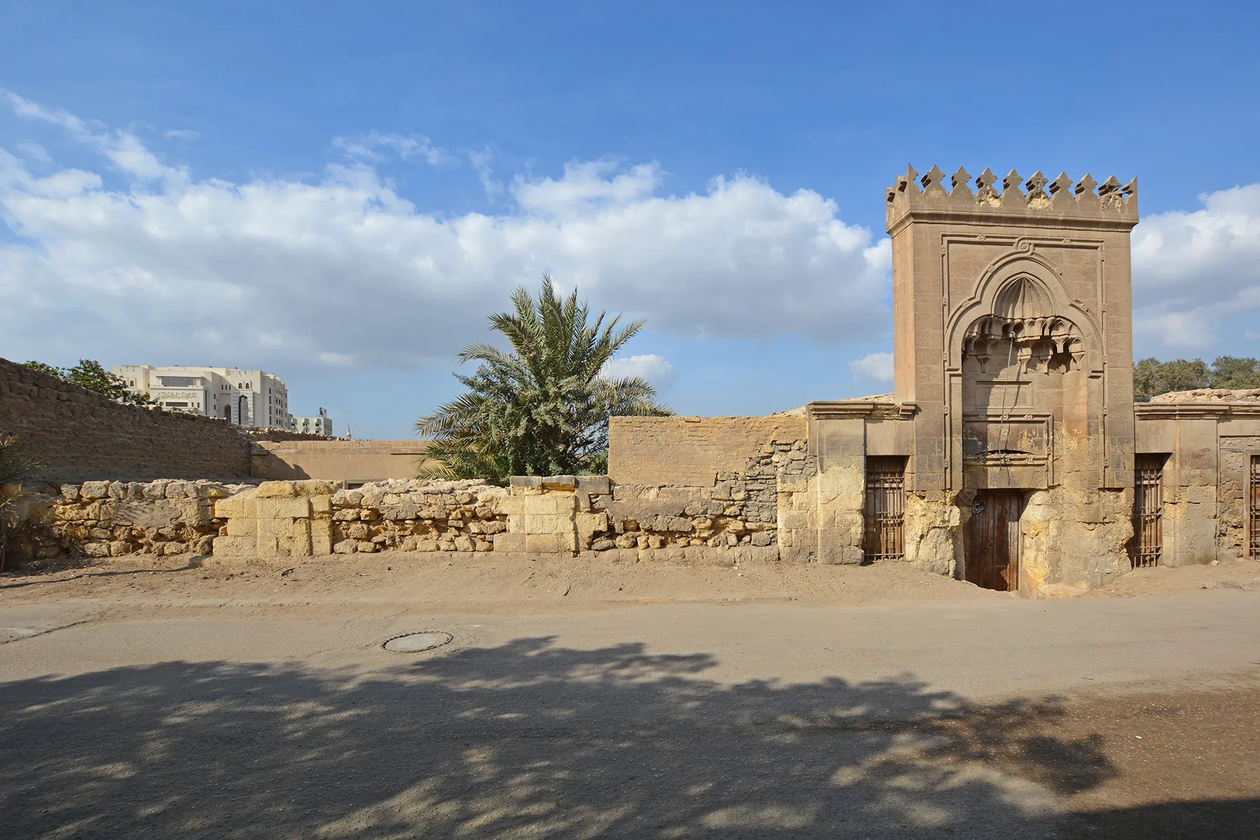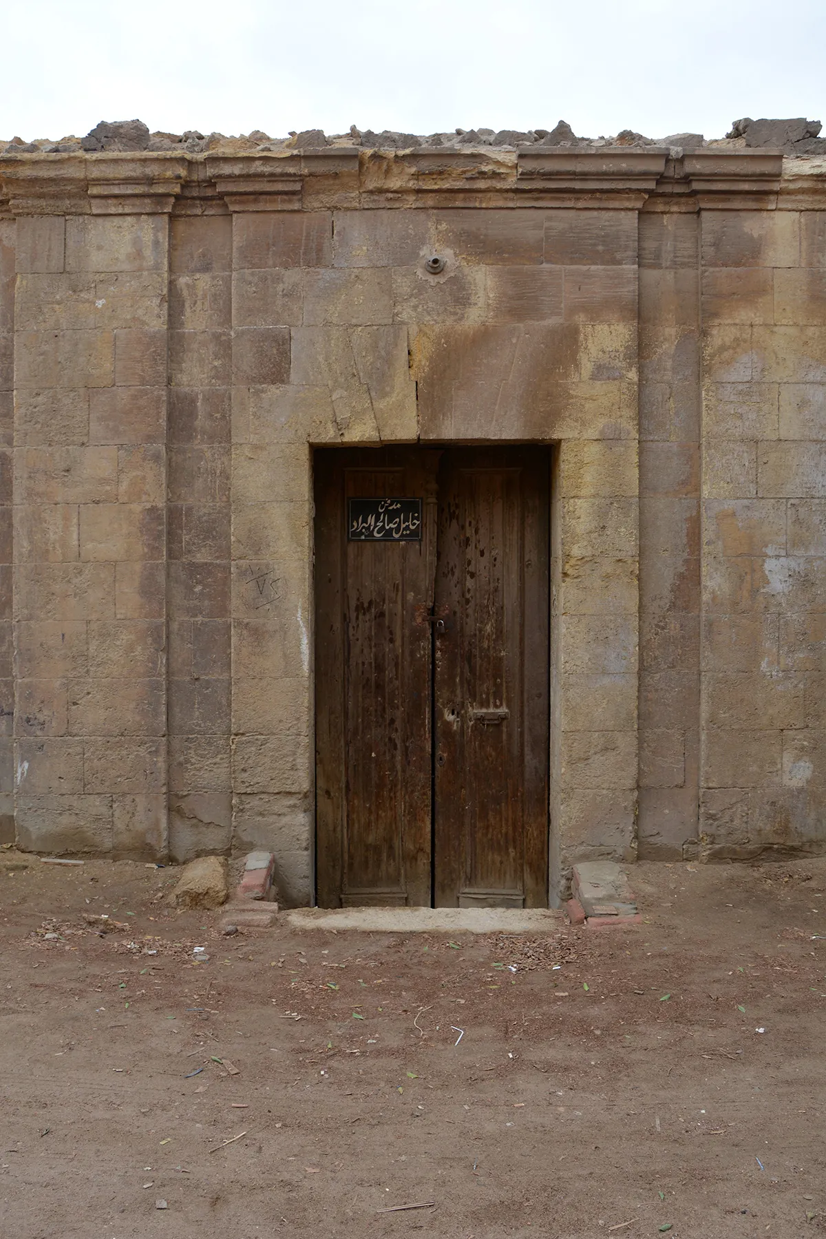 In the front façade, the main portal is asymmetrically placed closer to the northern end, and forms a pishtaq twice the height of the rest of the walls, topped with huge fleur-de-lys crenellations. The entrance is placed in a recess topped with a trefoil hood with a fluted semi-dome in the upper part resting on a very elaborate muqarnas frieze with “stalactite” muqarnases. The recess is framed in knotted mouldings. The composition follows very closely the forms of Mamluk-period architecture in Cairo. The rectangular entrance door has its lintel, which is a flat arch of limestone blocks, and a segmental relieving arch above it framed in knotted mouldings. Over the door is a rectangular recess in moulded frame, evidently intended for an inscription panel, but now empty. There are two narrow undecorated windows with flat-arch lintels flanking the portal, and two large, plain rectangular windows in the right (northern) section of the façade. The wider left section of the façade (now ruined) that formed the wall of the south-eastern courtyard apparently was blank, with no windows. There is a simple secondary gate in the northern façade with a rectangular undecorated door covered with a flat arch of limestone blocks. It leads to the building in the north-eastern corner of the enclosure. There are three windows to the left (east) of the gate and two windows to the right, identical with those in the front façade and irregularly placed.