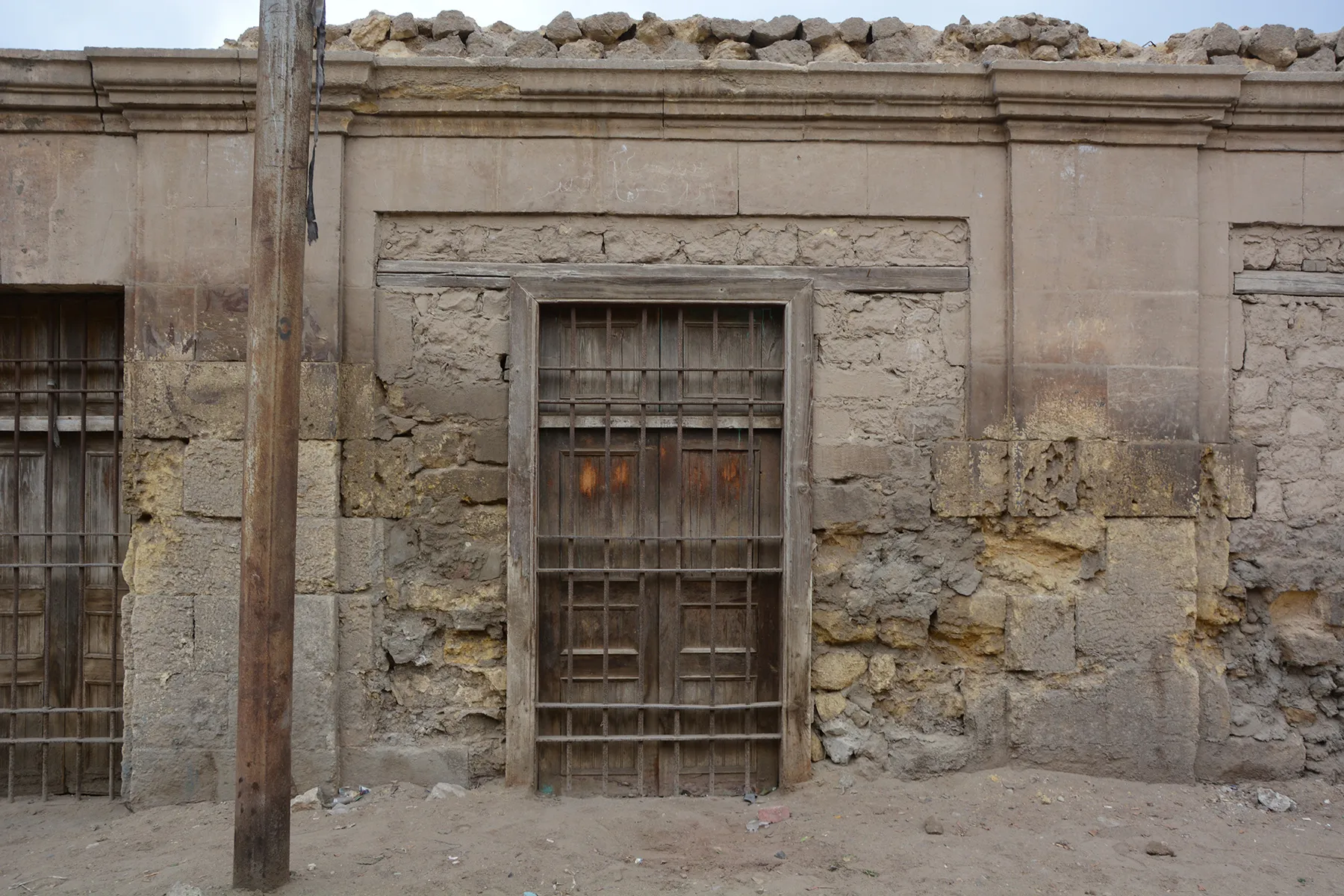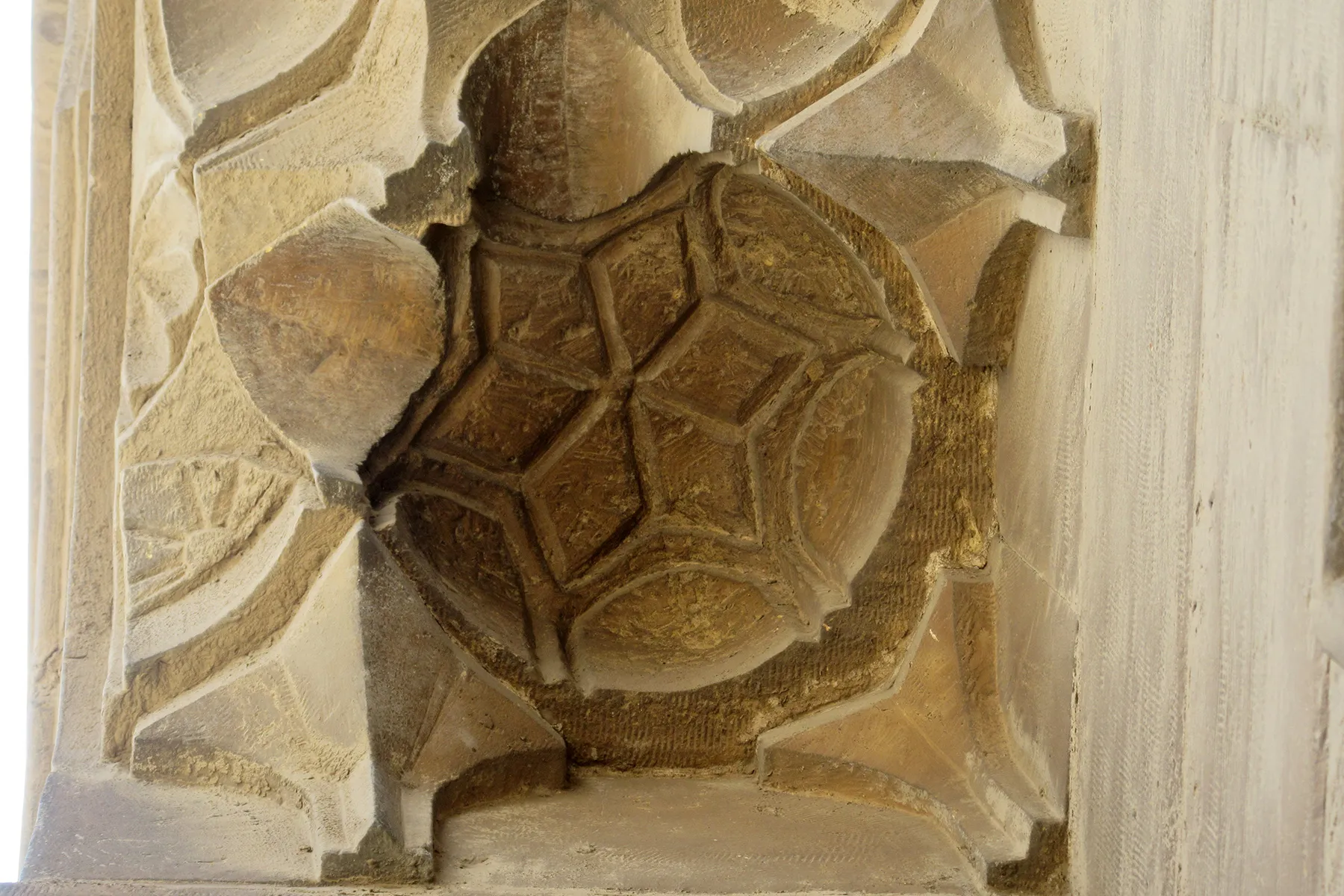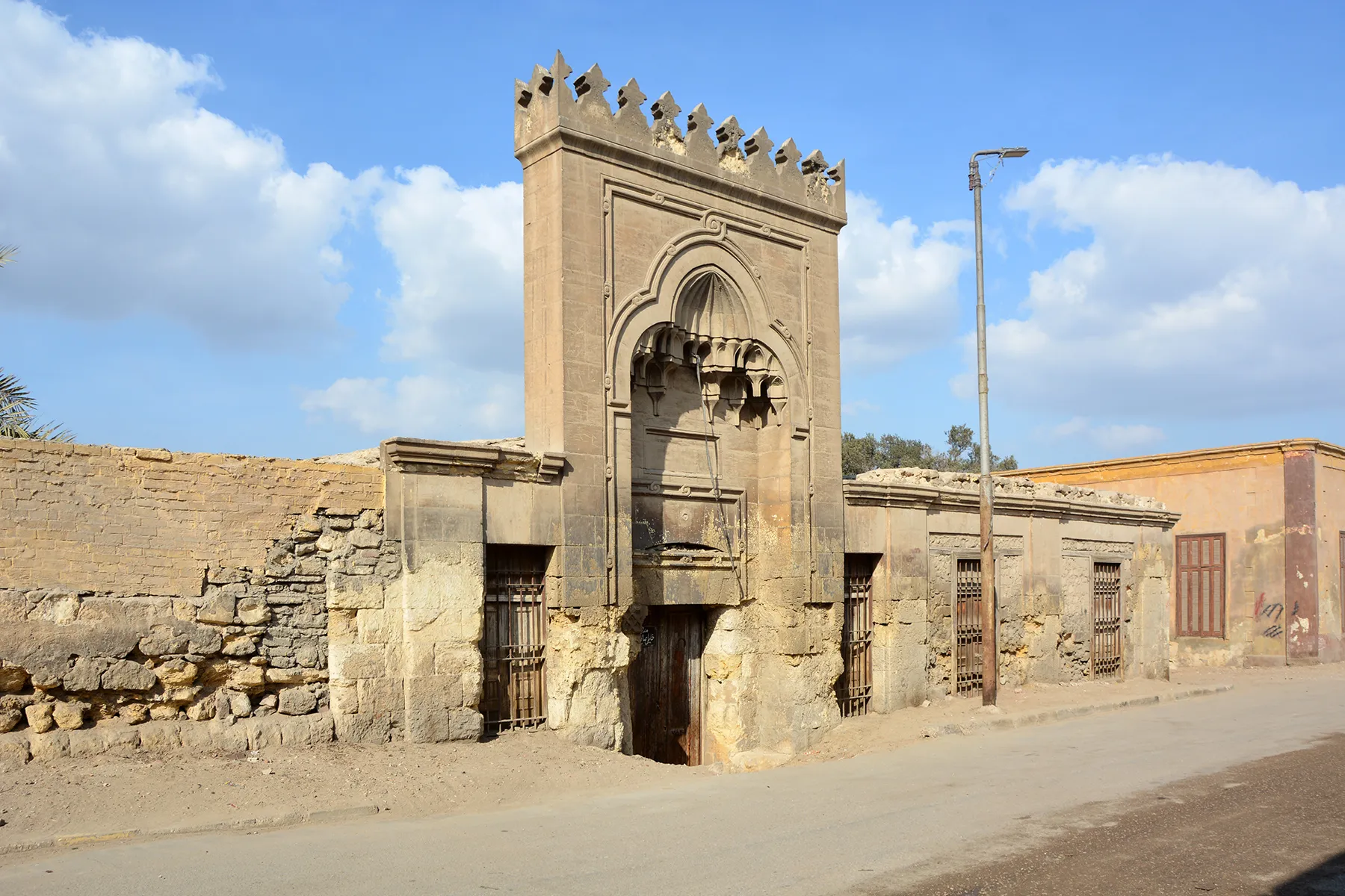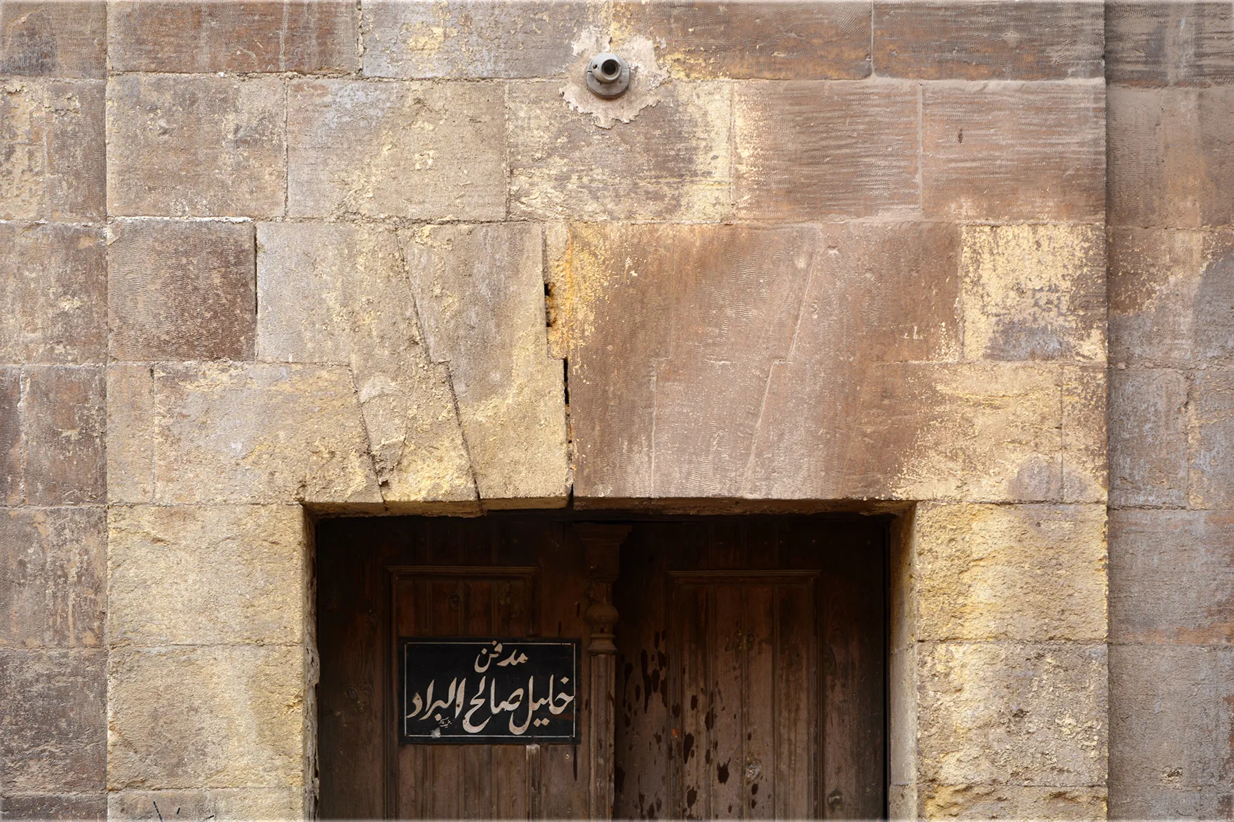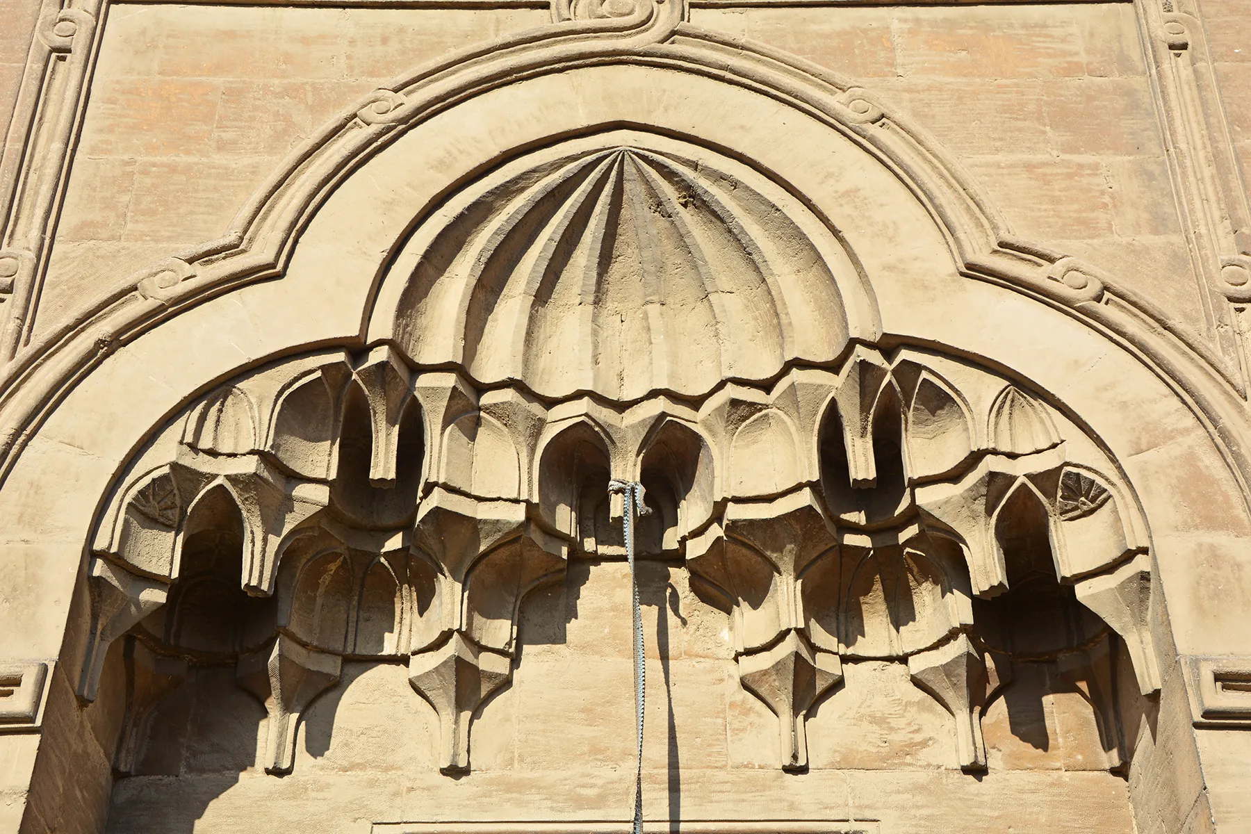 In the front façade, the main portal is asymmetrically placed closer to the northern end, and forms a pishtaq twice the height of the rest of the walls, topped with huge fleur-de-lys crenellations. The entrance is placed in a recess topped with a trefoil hood with a fluted semi-dome in the upper part resting on a very elaborate muqarnas frieze with “stalactite” muqarnases. The recess is framed in knotted mouldings. The composition follows very closely the forms of Mamluk-period architecture in Cairo. The rectangular entrance door has its lintel, which is a flat arch of limestone blocks, and a segmental relieving arch above it framed in knotted mouldings. Over the door is a rectangular recess in moulded frame, evidently intended for an inscription panel, but now empty. There are two narrow undecorated windows with flat-arch lintels flanking the portal, and two large, plain rectangular windows in the right (northern) section of the façade. The wider left section of the façade (now ruined) that formed the wall of the south-eastern courtyard apparently was blank, with no windows. There is a simple secondary gate in the northern façade with a rectangular undecorated door covered with a flat arch of limestone blocks. It leads to the building in the north-eastern corner of the enclosure. There are three windows to the left (east) of the gate and two windows to the right, identical with those in the front façade and irregularly placed.