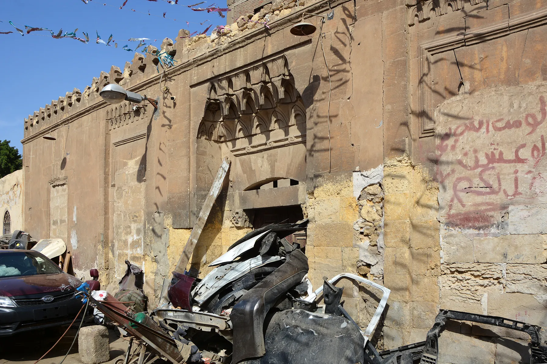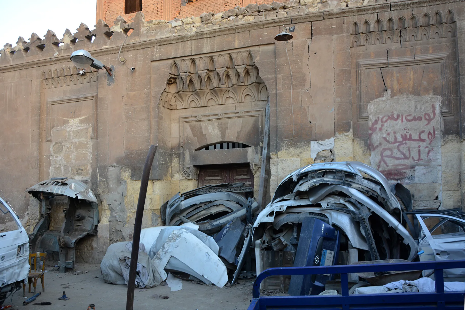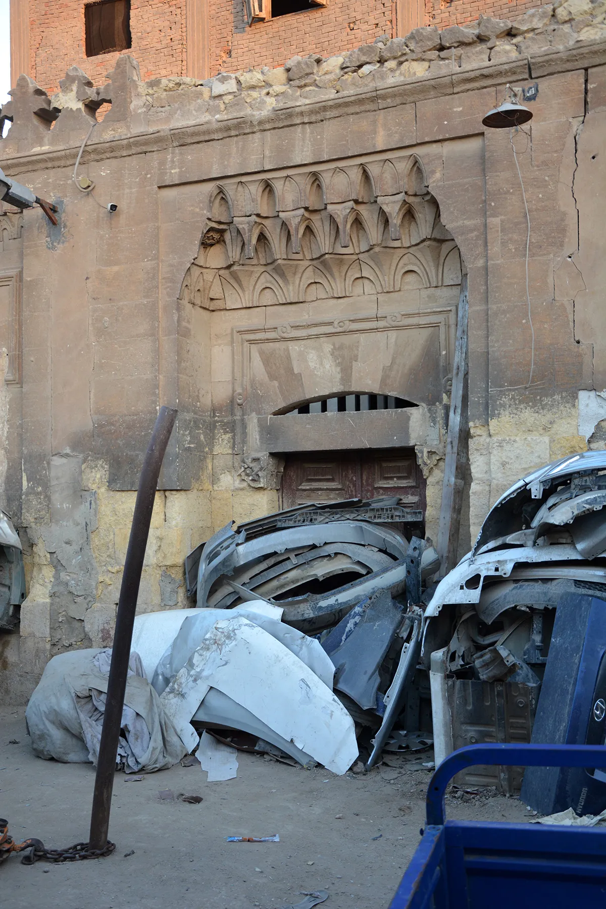 The space in front of the building is used as a car body repair shop, with the storage of car parts against the stone façade contributing to the damage.
