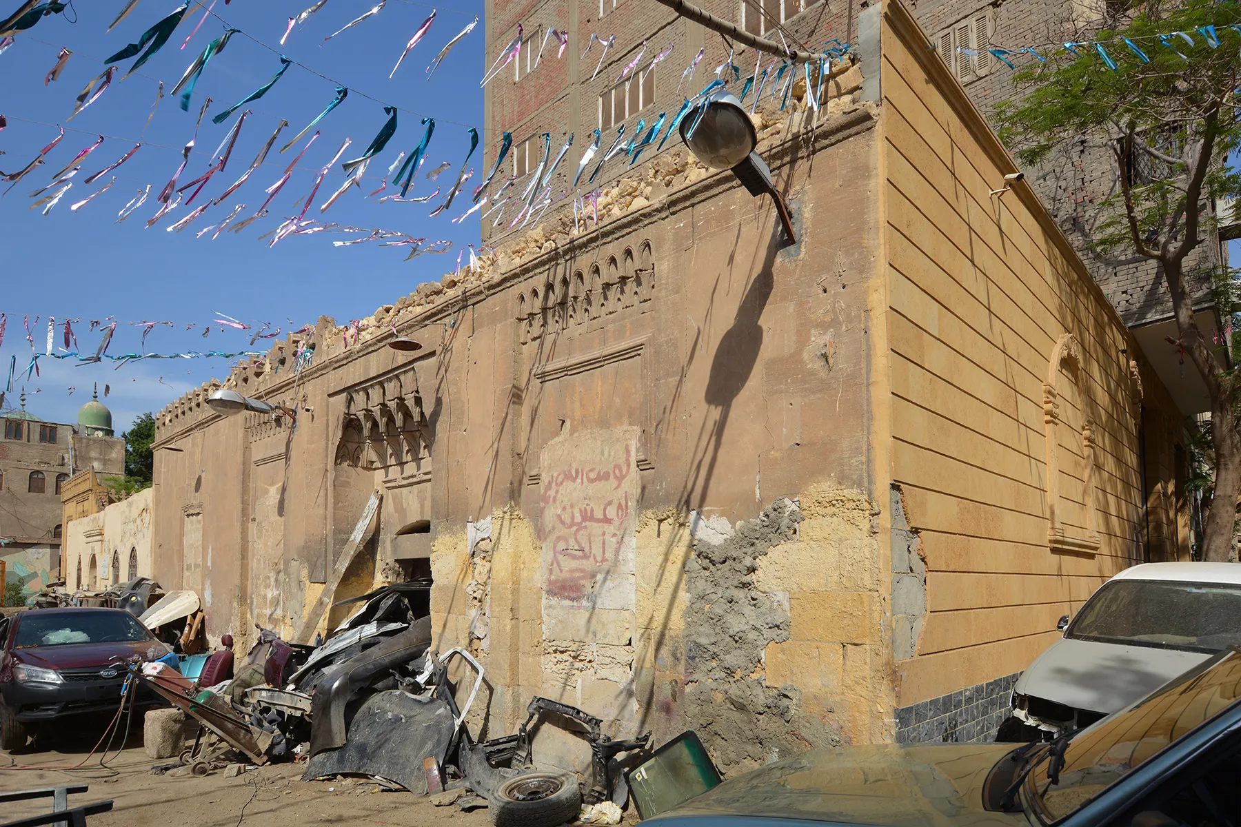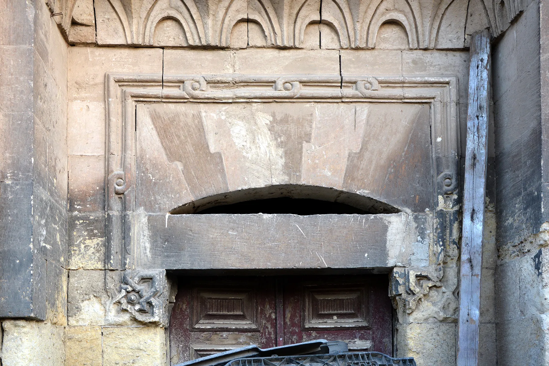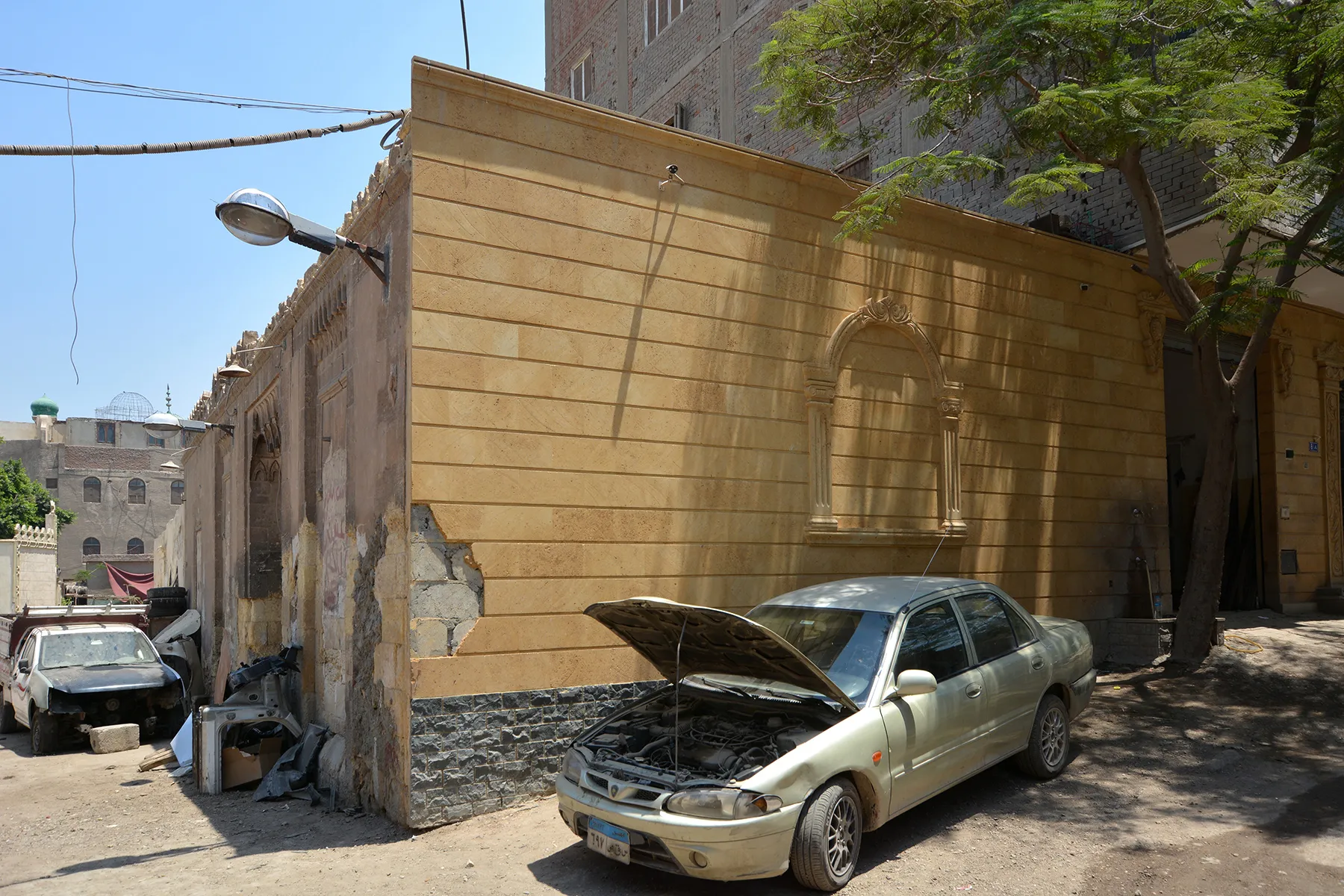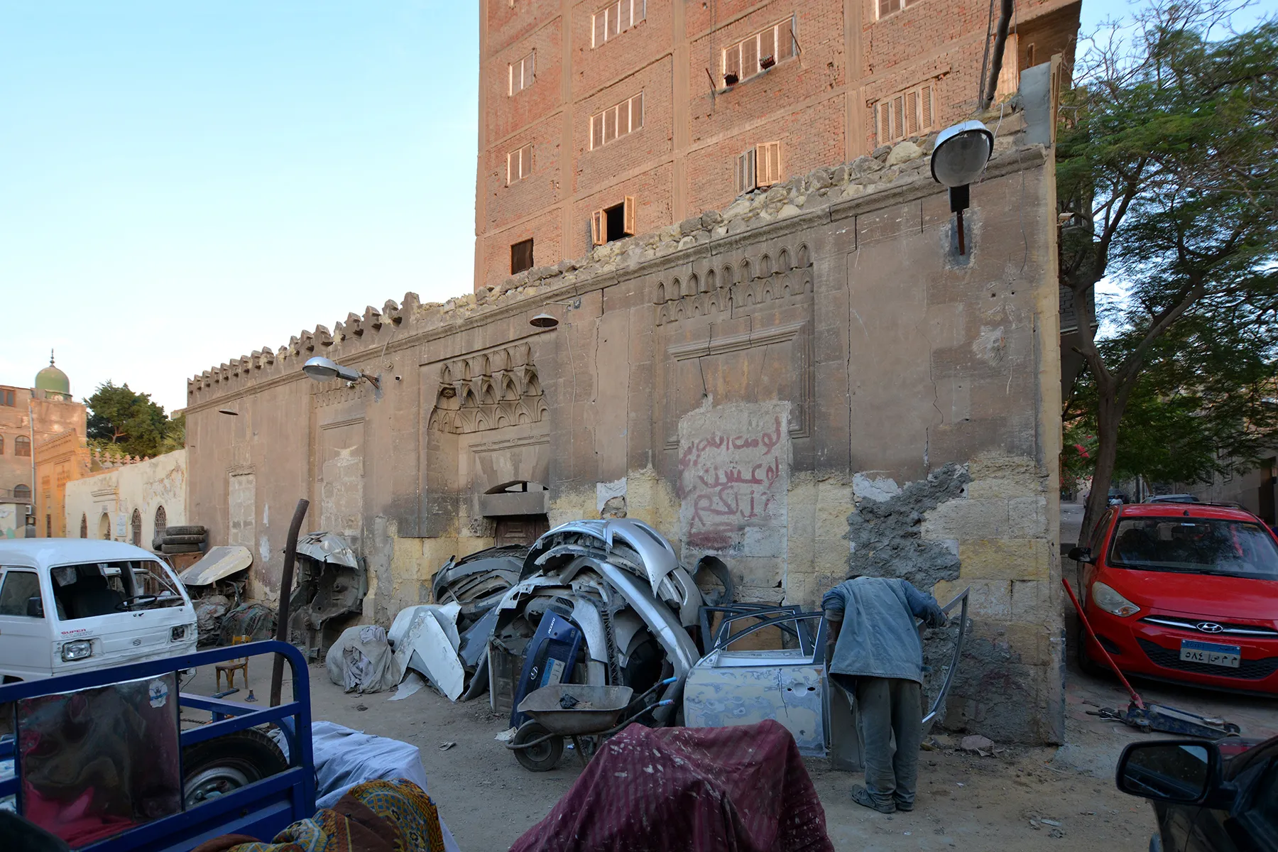 The space in front of the building is used as a car body repair shop, with the storage of car parts against the stone façade contributing to the damage.