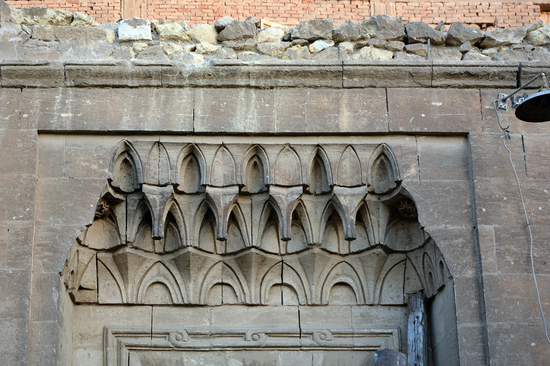 The unit comprises a small single storey building in the southern part, and an open courtyard that occupies the northern part of the site. The neo-Mamluk entrance façade is built of ashlar stone; the craftsmanship is of high quality. Its southern part is tripartite and strictly axial. In the middle is the entrance portal set in a recess covered with elaborate three-tiered muqarnas frieze with muqarnases of “stalactite” forms. In a typically Mamluk-style arrangement, the monolithic limestone lintel over the door and the relieving arch above it, which is built of simple step-joggled voussoirs, are framed in knotted mouldings. There is no room for a window or an inscription panel over the door and below the muqarnas frieze. The wooden door-leaves with decorative panelling do not relate to Islamic patterns. On either side of the portal is a shallow rectangular recess covered with a simple muqarnas frieze and containing a window with the lintel and the relieving arch above it framed in simple (not knotted) moulding of Mamluk-style profile. The portion of the façade north of the tripartite section is plain, pierced with a smaller, simple rectangular window with a simple moulding around it. The façade is topped with a simple, Mamluk-profile cornice and fleur-de-lys crenellations, which are preserved only in the northern part of the façade. The southern façade has recently been completely refaced with stone cladding that obscured the original engaged slender column in the south-western corner. The blind niche in the façade decorated in typically Egyptian 21st century style provides in comparison with the main façade an interesting example of the evolution of architectural taste and quality of craftsmanship in Egypt between the early 20th and early 21st centuries.