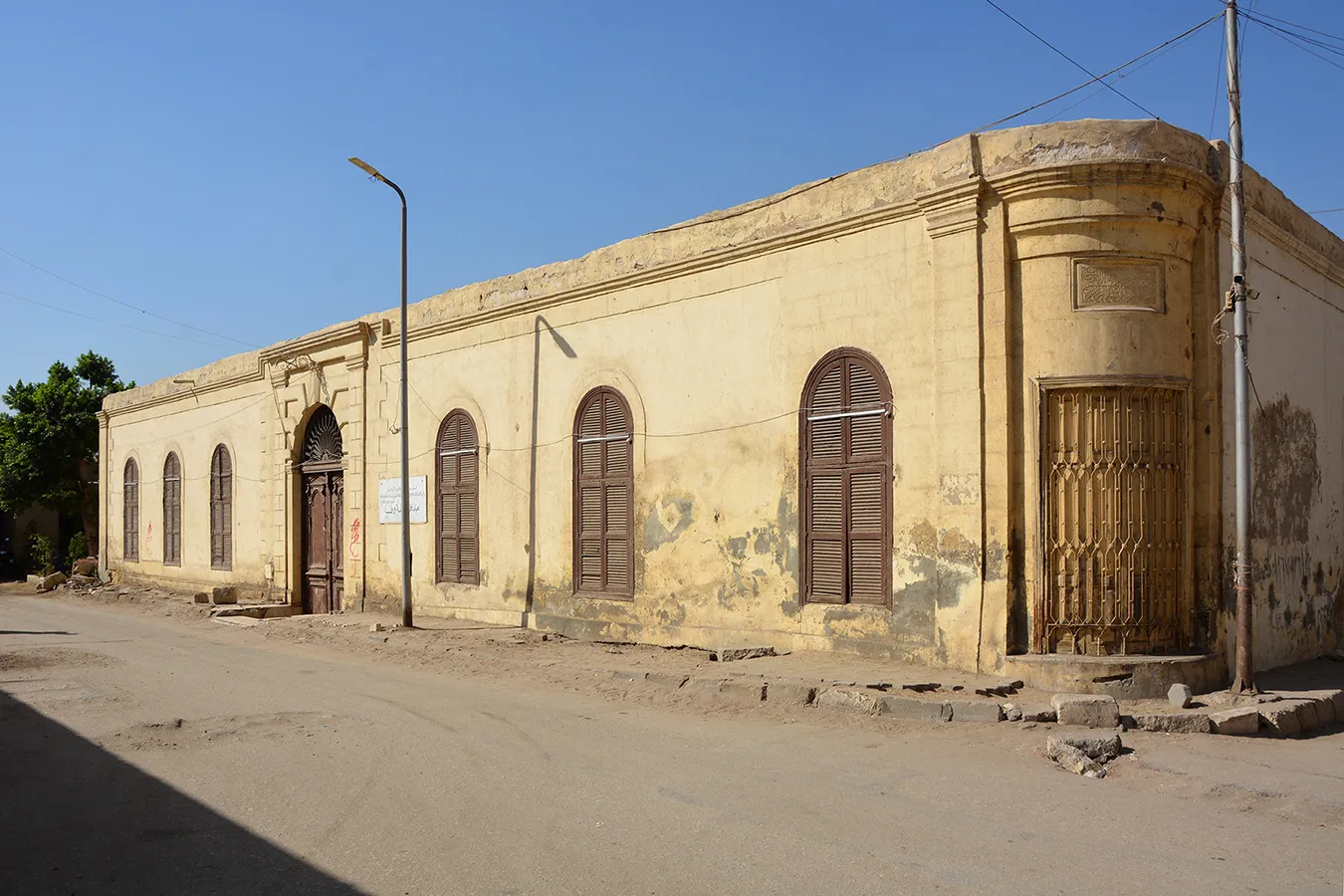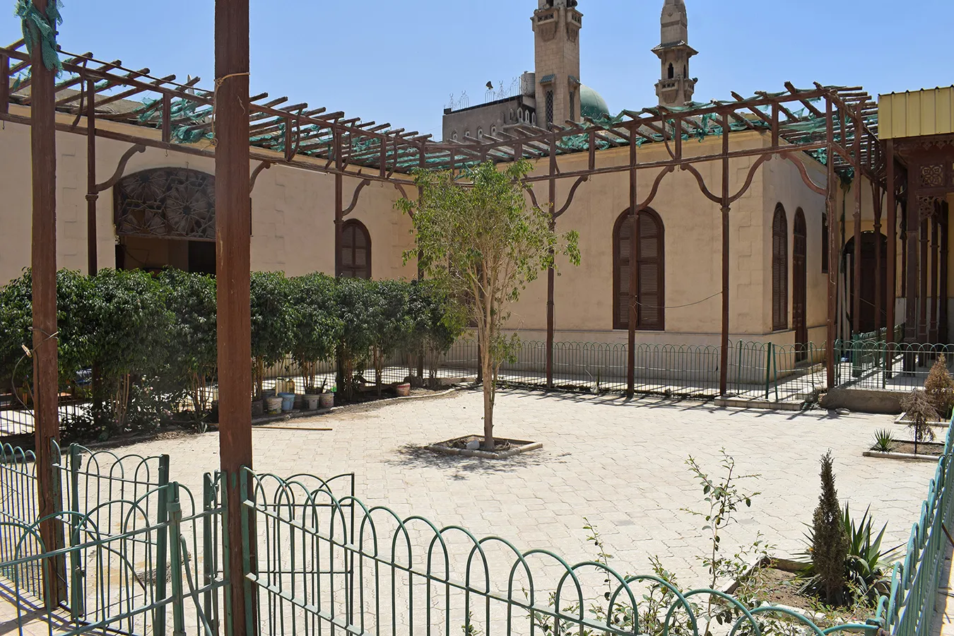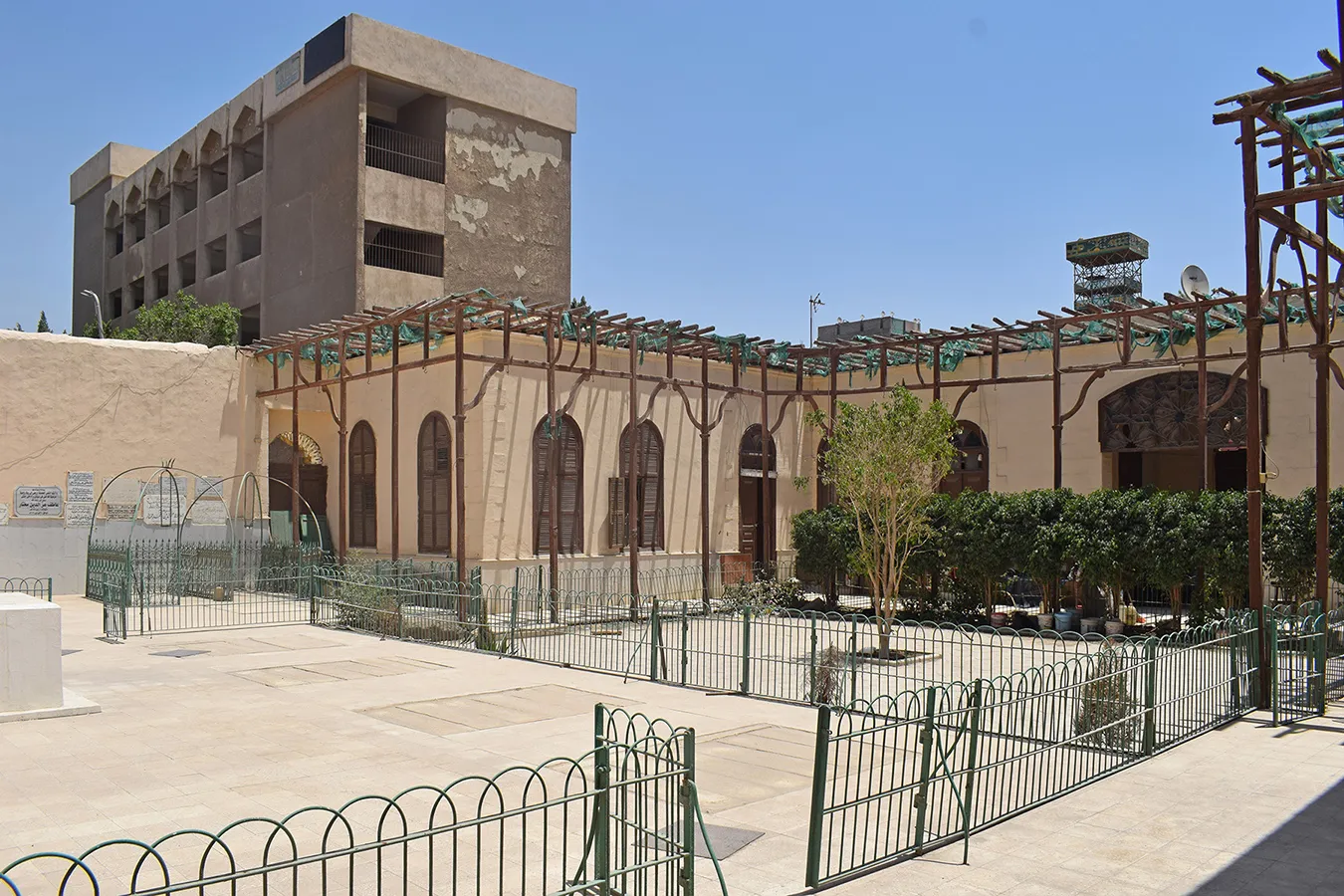A walled enclosure with single-storey structures in U-shape along the main (eastern) elevation and eastern part of the side walls. The front facadee is symmetrical, with three plain windows covered with semicircular arches on each ide of the central entrance gate, which has a simple, banded neo-classical architectural framing, wooden door leaves decorated with neo-classical motifs, and a decoratibe iron grille in the semicircular arch above the dooor. In the side walls, windows in the eastern section are irregularly placed. The back parts of the side walls and the back wall of the enclosure are plain, without a cornice or architectural divisions. An undecorated secondary entrance is placed in the middle of the northern elevation. A rectangular sabil window with simple iron grille and fitted with wooden shutters is placed in the rounded northeastern corner, and above it a marble plaque (now whitewashed) is placed, divided into four calligraphic panels.