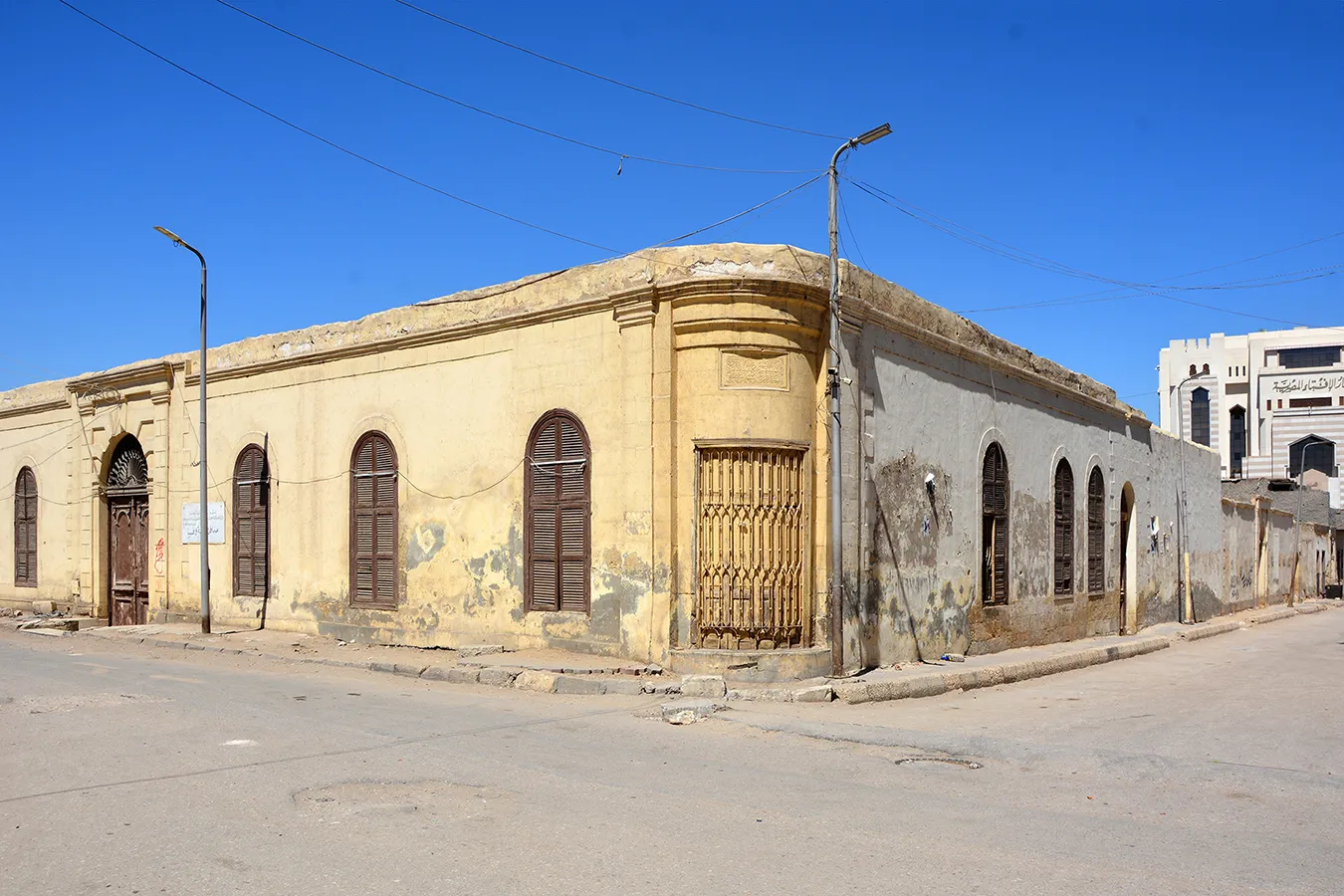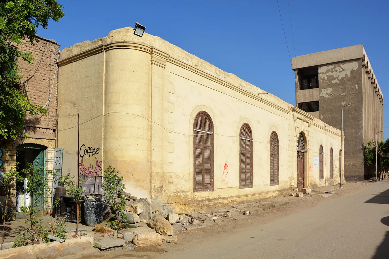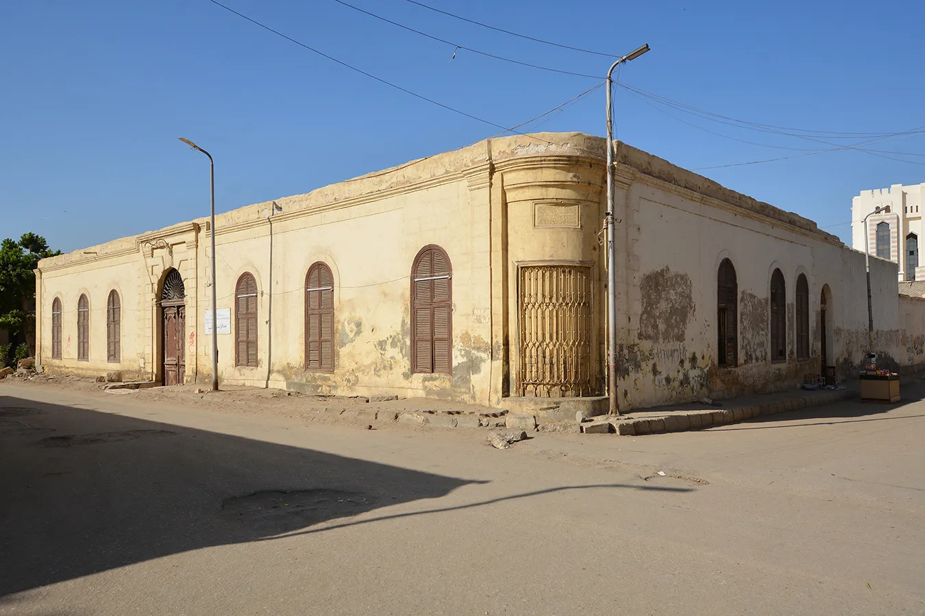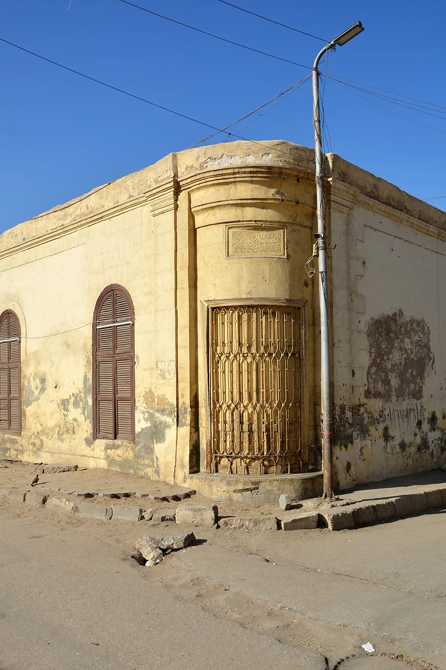 A walled enclosure with single-storey structures in U-shape along the main (eastern) elevation and eastern part of the side walls. The front facadee is symmetrical, with three plain windows covered with semicircular arches on each ide of the central entrance gate, which has a simple, banded neo-classical architectural framing, wooden door leaves decorated with neo-classical motifs, and a decoratibe iron grille in the semicircular arch above the dooor. In the side walls, windows in the eastern section are irregularly placed. The back parts of the side walls and the back wall of the enclosure are plain, without a cornice or architectural divisions. An undecorated secondary entrance is placed in the middle of the northern elevation. A rectangular sabil window with simple iron grille and fitted with wooden shutters is placed in the rounded northeastern corner, and above it a marble plaque (now whitewashed) is placed, divided into four calligraphic panels.