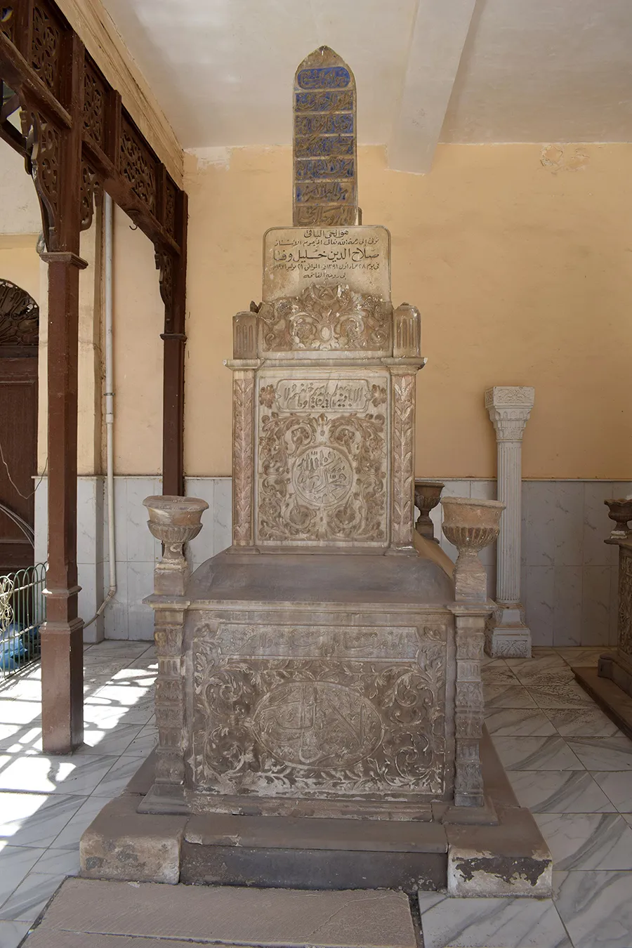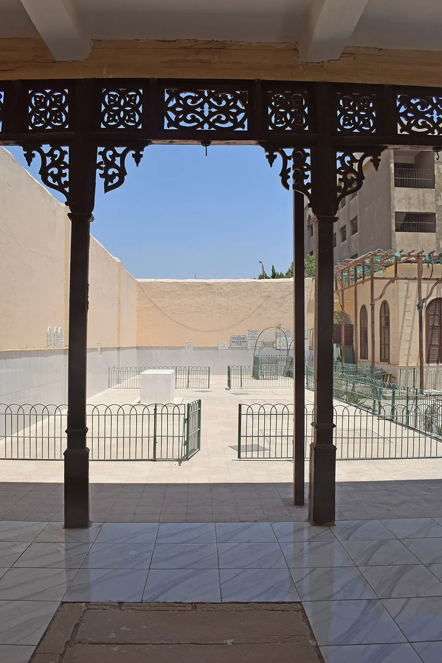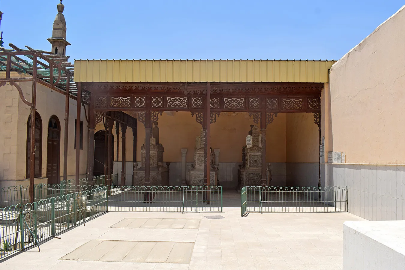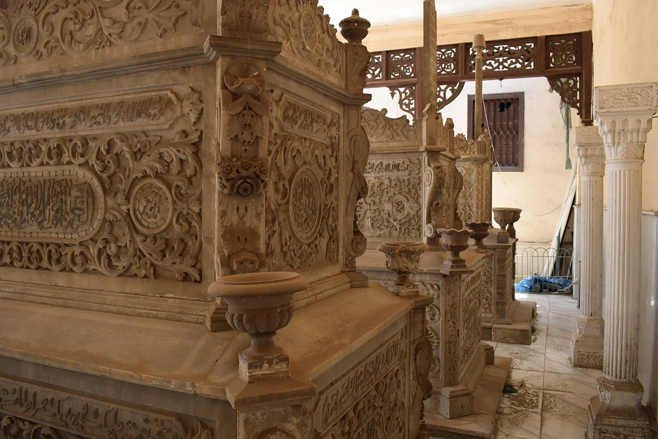 residential units. Another shaded wooden canopy elevated two steps above ground level is located in the located in the southwestern corner of the enclosure. It features arabesque motifs of wooden lattice openwork and covers three richly decorated marble cenotaphs.