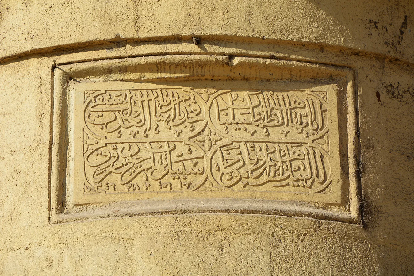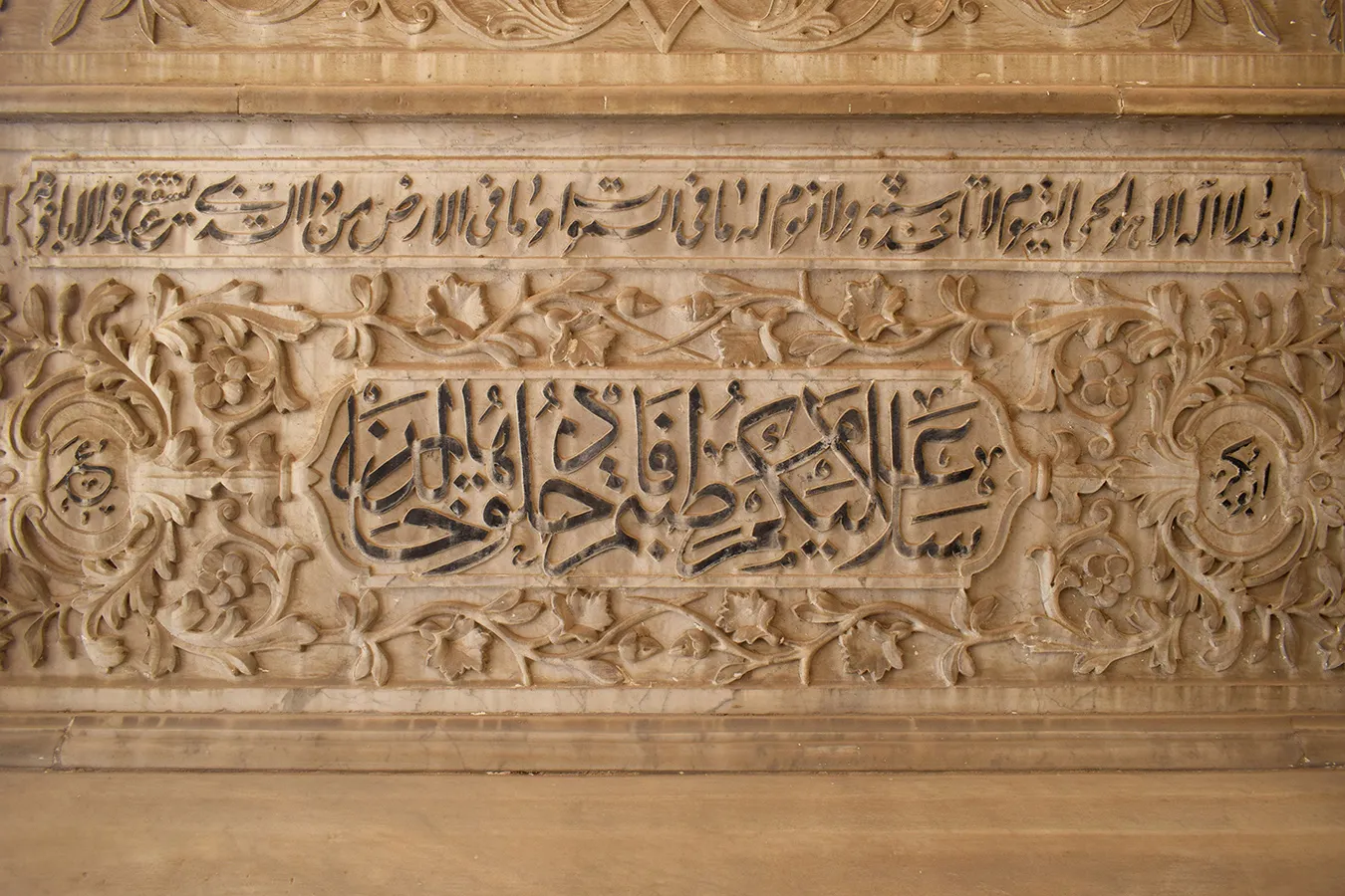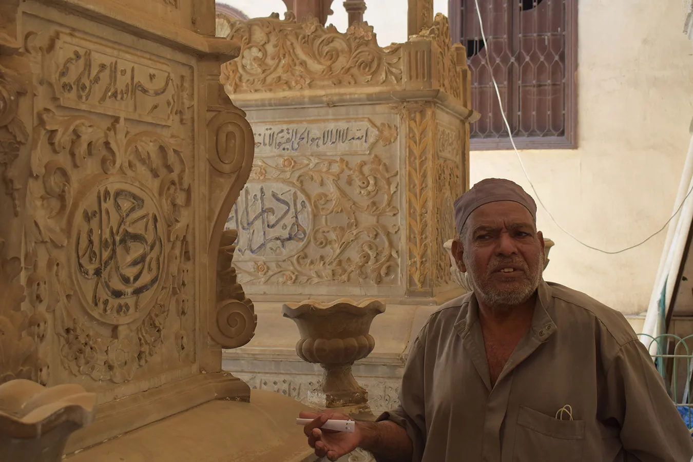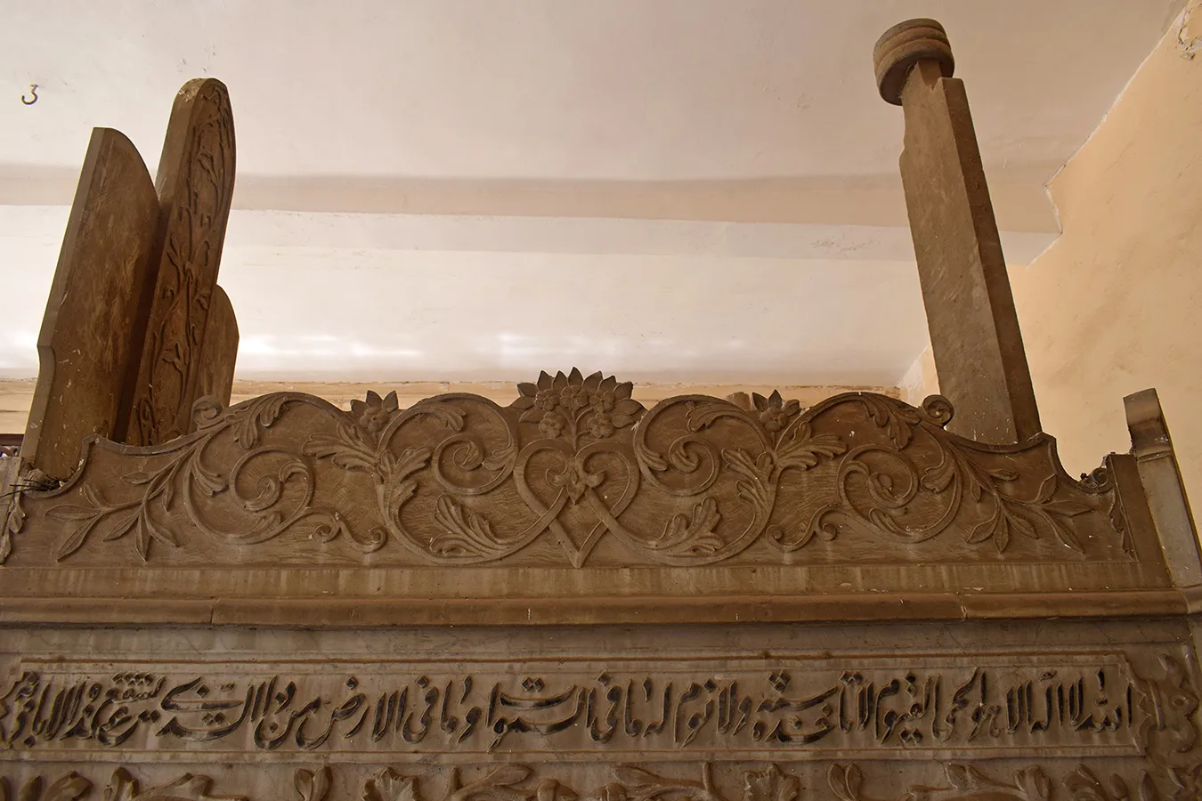 residential units. Another shaded wooden canopy elevated two steps above ground level is located in the located in the southwestern corner of the enclosure. It features arabesque motifs of wooden lattice openwork and covers three richly decorated marble cenotaphs.
