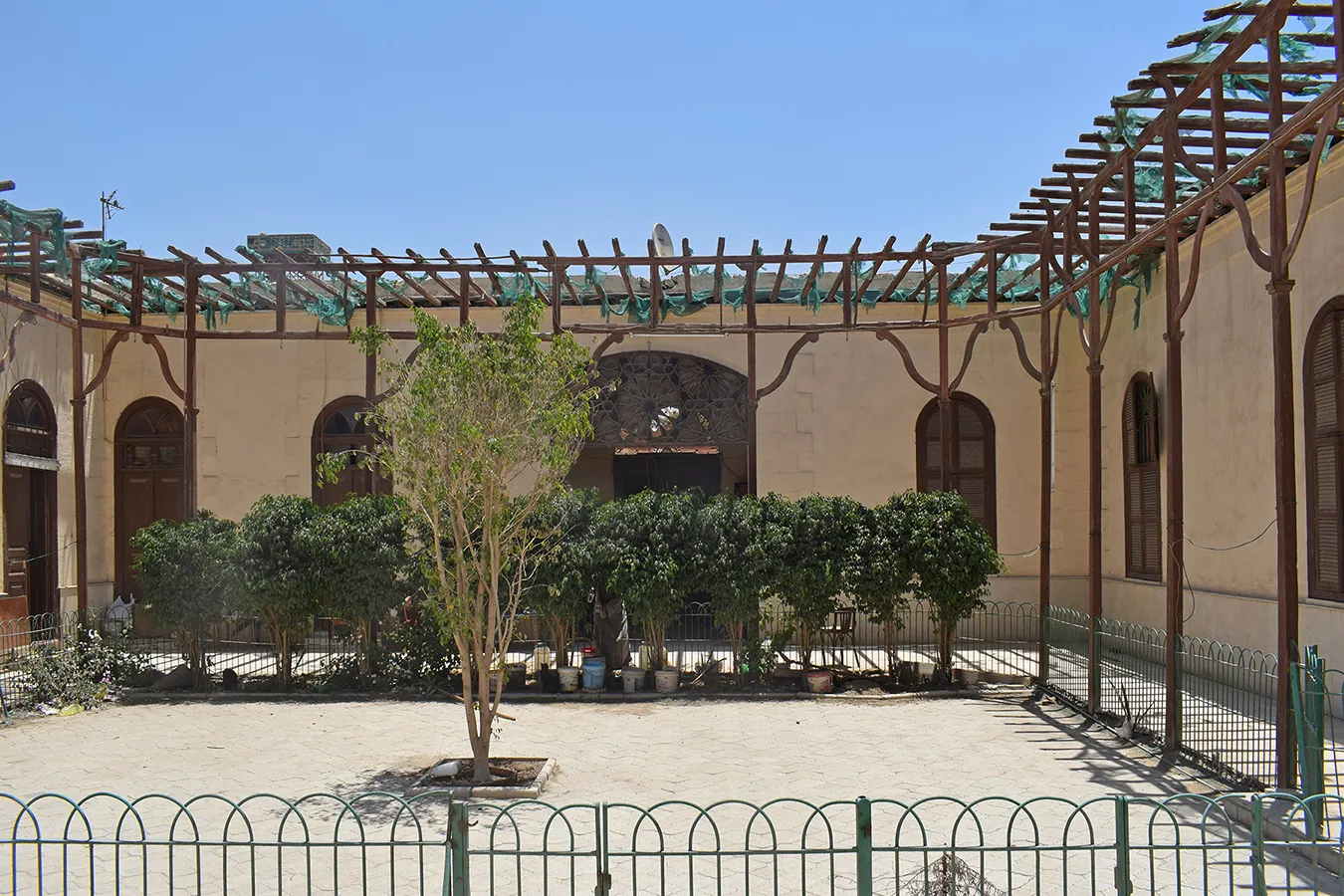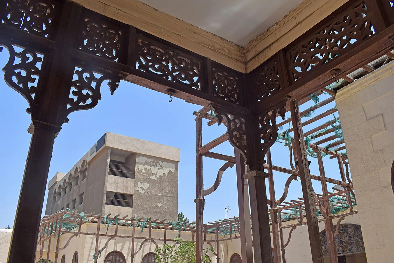 The U-shaped residential zone in the eastern part of the enclosure is divided into two symmetrical 3-bedroom apartments separated by a shared shaded corridor accessed from the main gateway and with a a wide opening onto the courtyard covered with a segmental arch. In the upper part of the opening is a wood-and-glass screen of fine craftsmanship, composed af a delicate pattern of interlacing twelve-pointed stars. A wooden shading canopy on slender wooden supports runs along the courtyard-facing walls of the