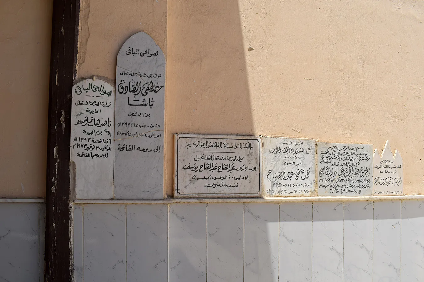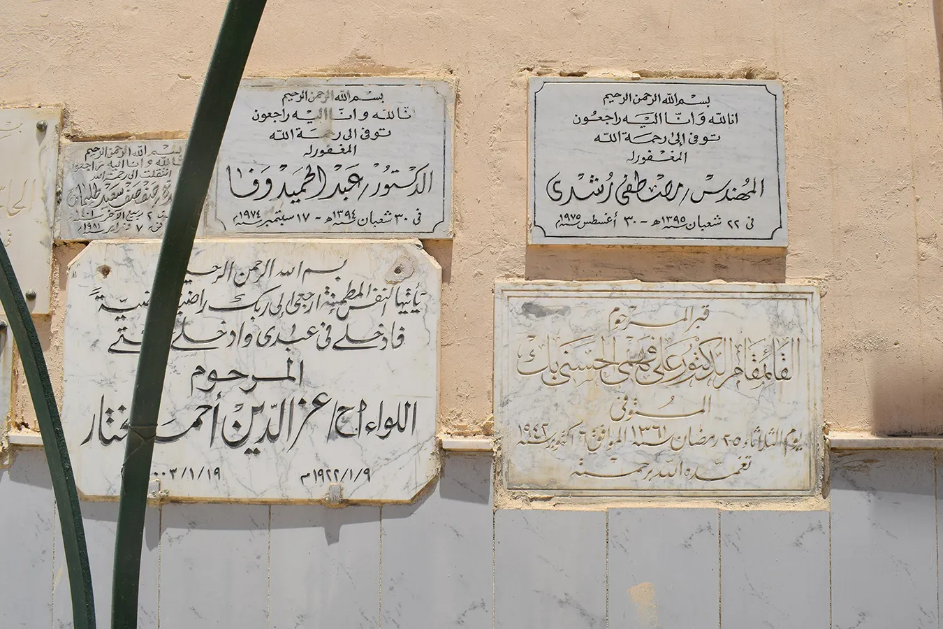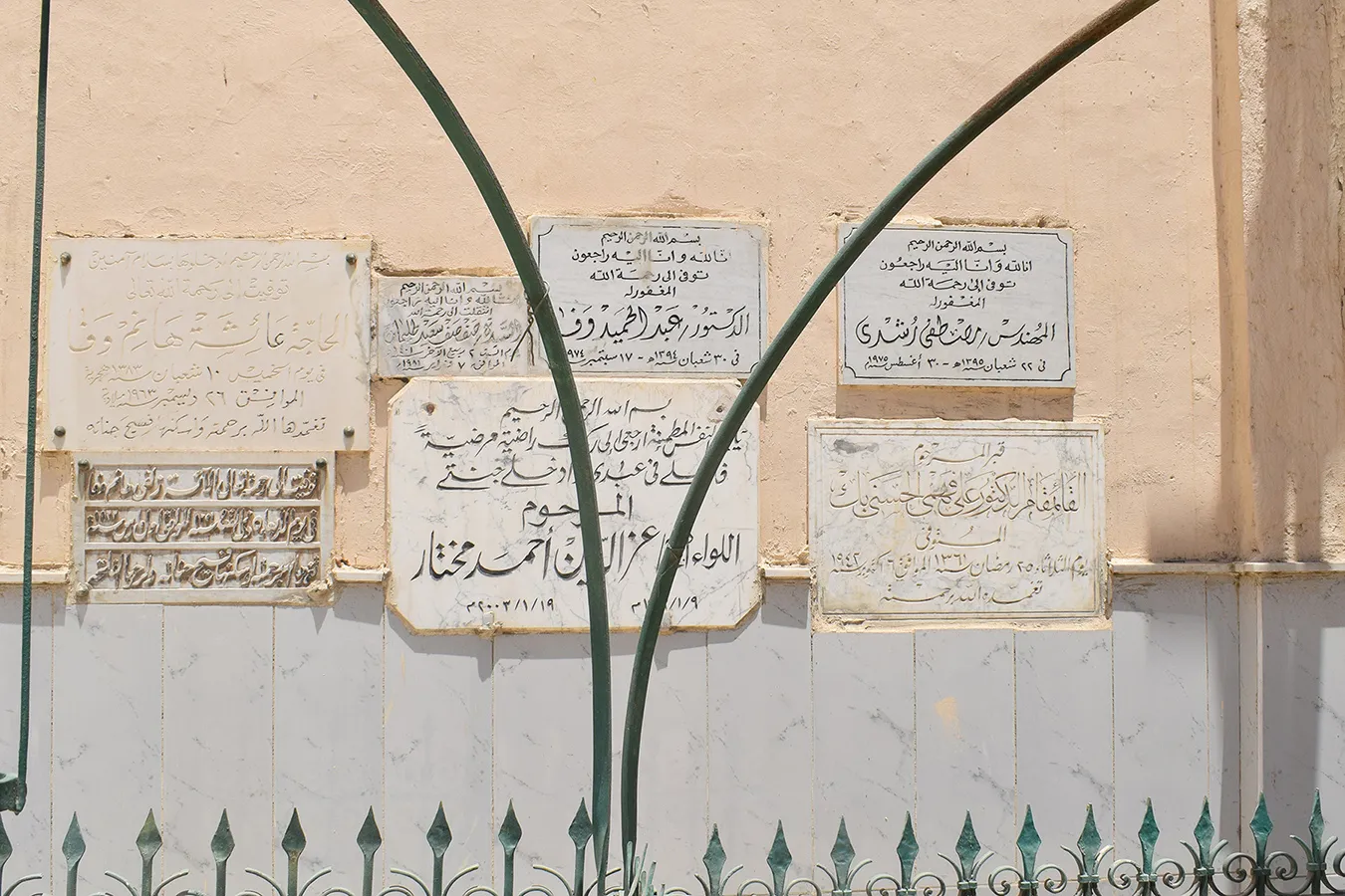 Numerous marble plaques with funerary inscriptions are mounted on the inside of the side walls of the enclosure, apparently relocated from cenotaphs. They include dates of late 20th and also 21st centuries.