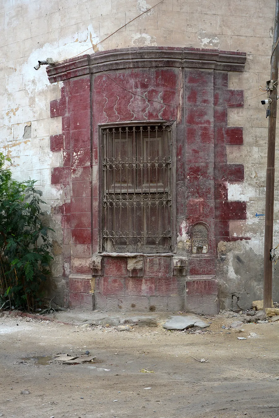The funerary enclosure occupies a sizeable quadrilateral lot measuring approximately 32 x 20–40 metres, with southern, eastern and northern walls meeting at right angles, and the western wall oblique. It faces streets on the southern, western and northern sides, and borders on neighbouring funerary enclosure to the east. The corner where the western and northern walls meet at an obtuse angle is rounded and pierced with a large sabil window. It is rectangular, covered with a flat arch of joggled voussoirs, and flanked with two very simple pilasters carrying a simple Classical moulding. There are two similarly treated gates in the northern and western walls (the western one taller than the western wall, which is much lower than the buildings in the corners of the enclosure. Otherwise, there is no architectural decoration; the building hasn’t got a formally arranged façade. The sabil window had a marble ledge at the bottom supported on three muqarnas corbels. Only scarce remnants remain. The corbels, the joggled voussoirs, and an empty recess over the western gate are the only elements of the building related to Mamluk style. Right of the sabil window is a small wall fountain with a bronze spigot in a marble wall panel with rounded top that is set in a recess framed with simple moulding. The panel contains three lines of calligraphic inscription in raised relief. The text relates to the beneficence of water and includes the date 17 Gumada al-Thani 1333 AH. The windows in the southern elevation are rectangular, small and plain. There are clear traces of at least three large openings in the wall that have been walled up. The windows (including the sabil window) are fitted with simple decorative wrought iron grilles. The northern elevation is windowless. On the wall of the building in the north-eastern corner three huge panels in wooden frames are mounted (apparently later than the original construction.) They include hand-painted religious inscriptions in a trained, but not masterly hand.